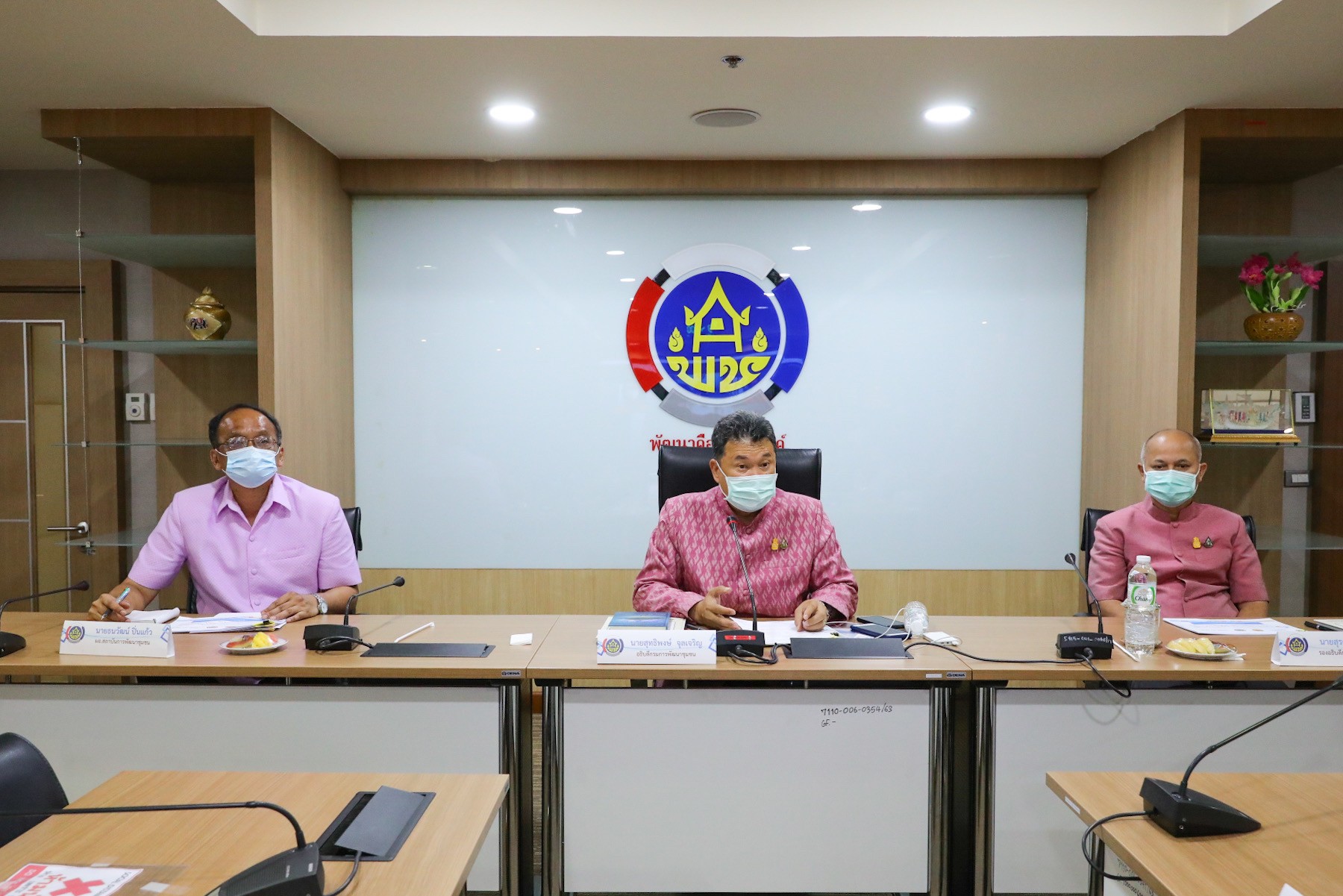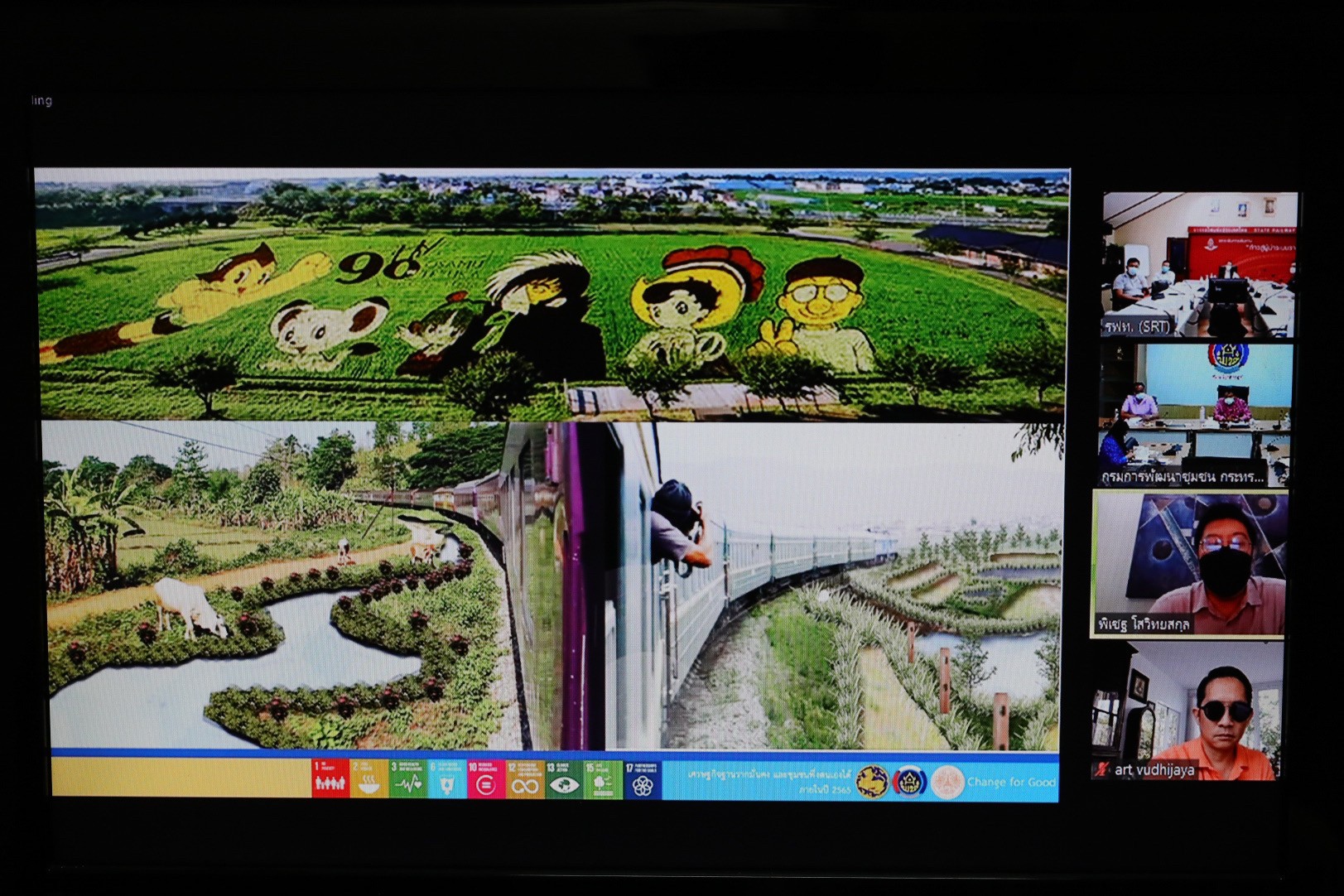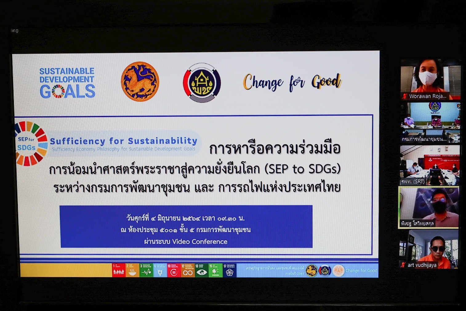 นายสุทธิพงษ์ จุลเจริญ อธิบดีกรมการพัฒนาชุมชน กระทรวงมหาดไทย และ นายนิรุฒ มณีพันธ์ ผู้ว่าการรถไฟแห่งประเทศไทย (รฟท.) หารือการดำเนินงานโครงการพัฒนาพื้นที่ต้นแบบการพัฒนาคุณภาพชีวิตตามหลักทฤษฎีใหม่ ประยุกต์สู่ “โคก หนอง นา โมเดล” ระหว่างกรมการพัฒนาชุมชน และ การรถไฟแห่งประเทศไทย โดยมี นายสุรศักดิ์ อักษรกุล รองอธิบดีกรมการพัฒนาชุมชน นายธนวัฒน์ ปิ่นแก้ว ผู้อำนวยการสถาบันการพัฒนาชุมชน นางสาวนิภา ทองก้อน ผู้อำนวยการสำนักเสริมสร้างความเข้มแข็งชุมชน รศ.วรวรรณ โรจนไพบูลย์ ผศ.พิเชฐ โสวิทยสกุล ที่ปรึกษาอธิบดีกรมการพัฒนาชุมชน และผู้บริหาร กรมการพัฒนาชุมชน พร้อมด้วย นายไพบูลย์ สุจิรังกุล วิศวกรใหญ่ฝ่ายการช่างโยธา และคณะผู้บริหารการรถไฟแห่งประเทศไทย , มล. อภิชิต วุฒิชัย ร่วมในการประชุม ผ่านระบบวีดิทัศน์ทางไกล (video conference) ด้วยโปรแกรม zoom cloud meeting