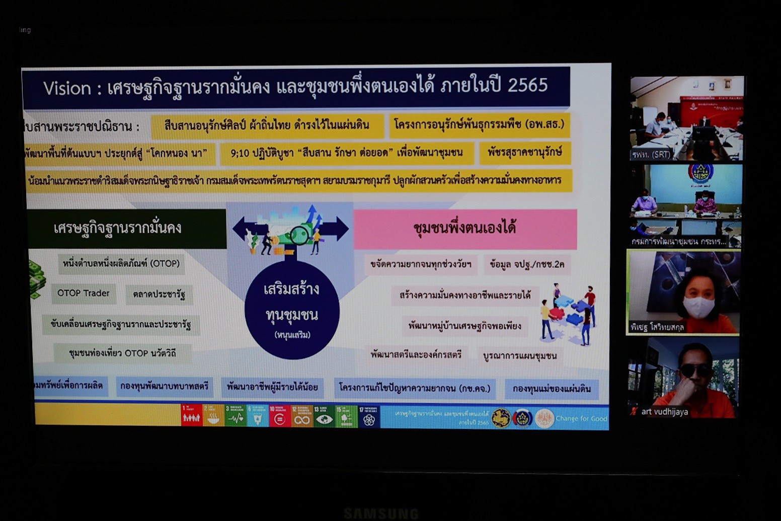 รศ.วรวรรณ โรจนไพบูลย์ กล่าวเสริมว่า “ด้วยวิสัยทัศน์ เศรษฐกิจฐานรากมั่นคง และชุมชนพึ่งตนเองได้ ภายในปี 2565 เป็นดังหมุดหมายสำคัญ ที่กรมการพัฒนาชุมชน ขับเคลื่อนสร้างสรรค์ให้บรรลุผลอย่างเป็นรูปธรรม โดยทุกกิจกรรม โครงการ มุ่งสนองพระราชปณิธาน และพระราชประสงค์ของพระบาทสมเด็จพระวชิรเกล้าเจ้าอยู่หัว และพระบรมวงศานุวงศ์ทุกพระองค์ ในการสืบสาน รักษา และต่อยอด เพื่อสร้างสุขให้กับประชาชนทุกหมู่เหล่า และตอบโจทย์การขจัดความยากจนและพัฒนาคนทุกช่วงวัยอย่างยั่งยืนตามหลักปรัชญาของเศรษฐกิจพอเพียง กุญแจสำคัญของกรมการพัฒนาชุมชน คือการขับเคลื่อนผ่านกลไกกานขับเคลื่อนสืบสานศาสตร์พระราชาเพื่อการปฏิรูปประเทศ หรือ กลไก 3-5-7 ที่จะช่วยหนุนเสริมให้การขับเคลื่อนสืบสานศาสตร์การพัฒนาเศรษฐกิจพอเพียงและทฤษฎีใหม่ บรรลุเป้าหมายความยั่งยืนของโลกได้ทั้ง 17 ข้อ โดยเน้นการพัฒนาที่มีประชาชนเป็นแกนกลาง โดยการร่วมบูรณาการเพื่อเสริมกลไกเดิมของภาครัฐที่มีอยู่ ในพื้นที่ 3 ระดับ เป็นอย่างน้อย คือ ระดับชุมชนหรือลุ่มน้ำ ระดับจังหวัดหรือภูมิภาค และระดับชาติ ภายใต้การมีส่วนร่วมของ 5 กลไก ที่จะช่วยหนุนเสริมงานขับเคลื่อนสืบสานศาสตร์การพัฒนาเศรษฐกิจพอเพียงและทฤษฎีใหม่ ประกอบด้วย กลไกการประสานงานภาคีเครือข่าย กลไกแผนงานและยุทธศาสตร์เชิงบูรณาการ กลไกการติดตามและประเมินผล กลไกการจัดการความรู้ อันเป็นองค์ความรู้ที่ได้จากการปฏิบัติที่ต้องนำมาจัดทำเป็นตำราหรือคู่มือเฉพาะในแต่ละพื้นที่ และกลไกการสื่อสารสังคมให้รับรู้ ร่วมด้วย การบูรณาการของ 7 ภาคี คือ ภาครัฐที่ให้การสนับสนุนด้านงบประมาณ กฎหมาย รวมถึงเครื่องมือต่าง ๆ ภาควิชาการและสถาบันการศึกษา ภาคศาสนา ภาคประชาชน ภาคเอกชน ภาคประชาสังคม และภาคสื่อมวลชน