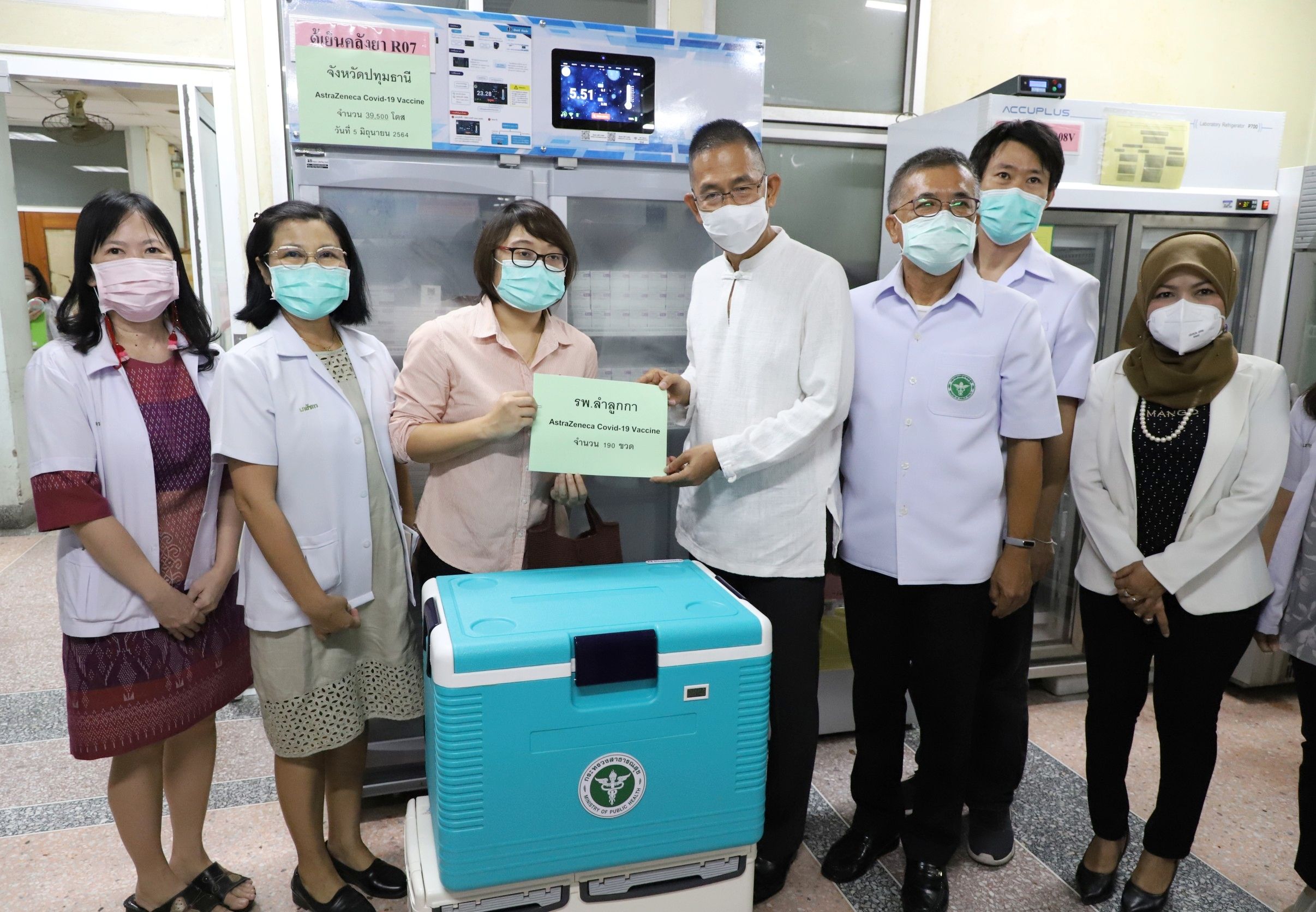 เมื่อเวลา 09.00 น. วันที่6 มิ.ย.2564ที่ โรงพยาบาลปทุมธานี นายชัยวัฒน์ ชื่นโกสุม ผู้ว่าราชการจังหวัดปทุมธานี พร้อมด้วยนายพิษณุ ประเภทธนานันท์ นายอำเภอเมืองปทุมธานี นายแพทย์สุรินทร์ สืบซึ้ง นายแพทย์สาธารณสุขจังหวัดปทุมธานี ส่งมอบวัคซีนป้องกันโควิด-19 แอสตร้าเซเนก้า (AstraZeneca Covid-19 vaccine) จังหวัดปทุมธานี จำนวน 39,500 โดส และ Sinovac จำนวน 9,380 โดส ให้กับกลุ่มผู้สูงอายุและผู้ที่มีโรคเรื้อรัง 7 โรคหลัก ที่ลงทะเบียนผ่าน “หมอพร้อม” โดยเริ่มฉีดในวันจันทร์ ที่ 7 มิถุนายน 2564 พร้อมกันทุกหน่วยบริการ ทั้งจังหวัด โดยมี นายแพทย์อภิชน จีนเสวก รองนายแพทย์สาธารณสุขจังหวัดปทุมธานี นายแพทย์ปรีดา ตั้งจิตเมธี รองผู้อำนวยการกลุ่มภารกิจด้านบริการปฐมภูมิ และหน่วยงานที่เกี่ยวข้องเข้าร่วมส่งมอบ