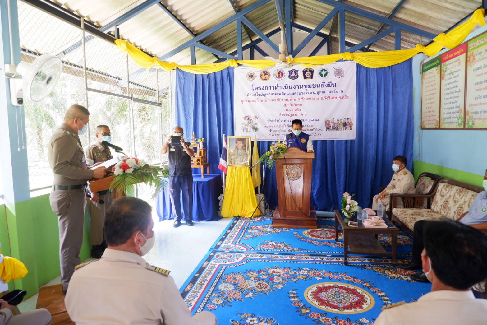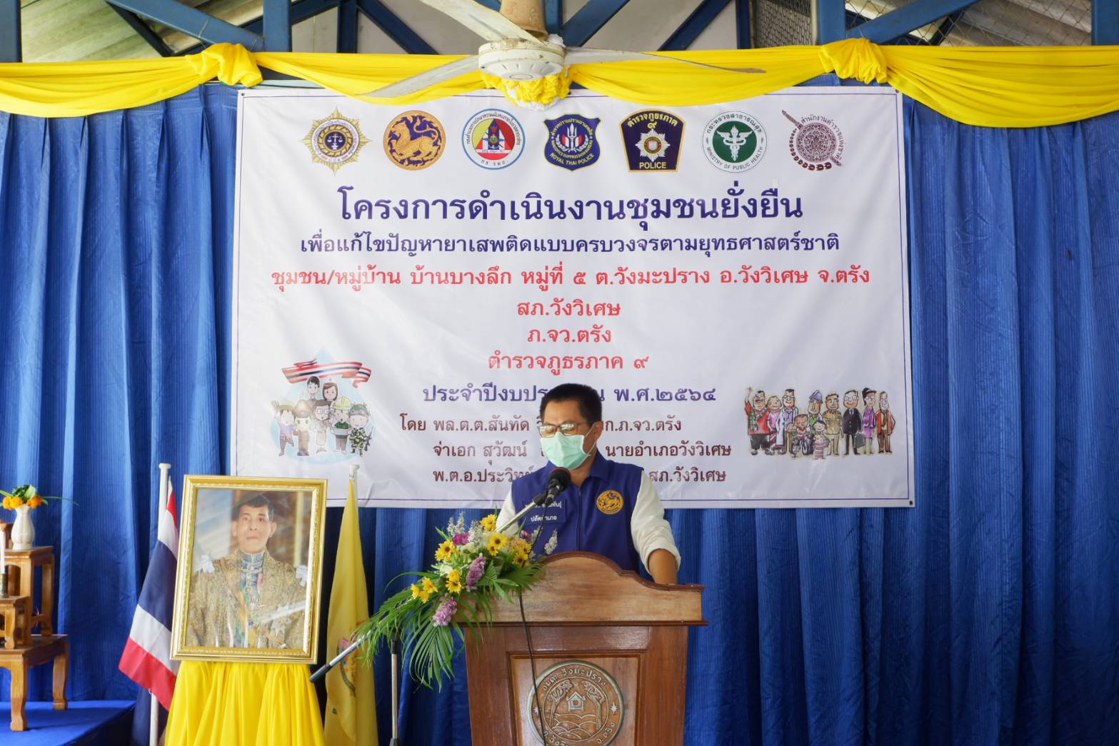ที่บ้านบางลึก หมู่ที่ 5 ต.วังมะปราง อ.วังวิเศษ จ.ตรัง นายพรศิลป์ อรุณพันธุ์ ปลัดอำเภอหัวฝ่ายบริหารปกครอง ปฏิบัติราชการแทนนายอำเภอวังวิเศษ เป็นประธานในพิธีเปิดโครงการดำเนินงานชุมชนยั่งยืน เพื่อแก้ไขปัญหายาเสพติดแบบครบวงจรตามยุทธศาสตร์ชาติ พ.ต.อ.ประวิทย์ เขียวไสว ผกก.สภ.วังวิเศษ กล่าวว่า ตามที่ตำรวจภูธรภาค 9 ได้มอบหมายให้สถานีตำรวจภูธรวังวิเศษ ดำเนินงานโครงการดำเนินงานชุมชนยั่งยืน เพื่อแก้ไขปัญหายาเสพติดแบบครบวงจรตามยุทธศาสตร์ชาติ โดยให้ดำเนินการแก้ไขปัญหาการแพร่ระบาดของยาเสพติดในชุมชน/หมู่บ้าน โดยเสริมสร้างให้ชุมชนเกิดความเข้มแข็งเข้าใจและรับรู้ปัญหาพิษภัยที่เกิดขึ้นจากยาเสพติด เพื่อให้เกิดกระบวนการป้องกันแก้ไขและการบำบัดยาเสพติดโดยการมีส่วนร่วมของคนในหมู่บ้าน/ชุมชน และเพื่อสร้างรูปแบบการดำเนินงานในหมู่บ้าน/ชุมชนเข้มแข็งในการแก้ไขปัญหายาเสพติดอย่างยั่งยืน
