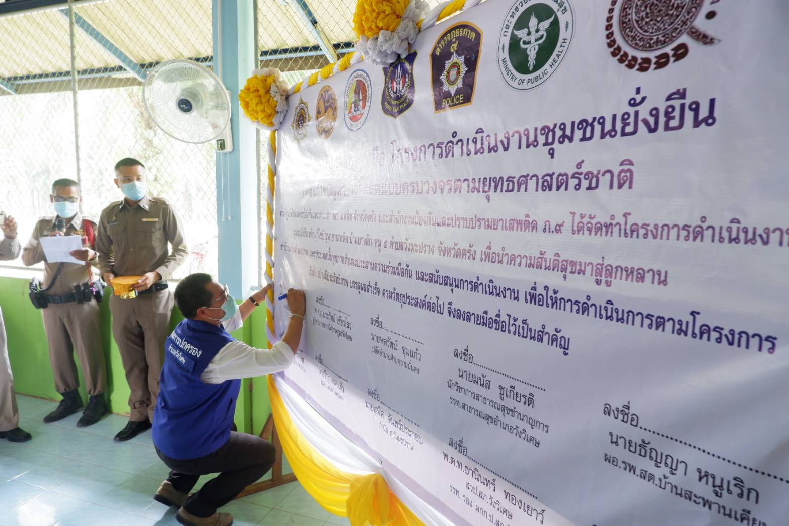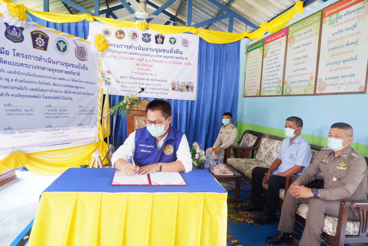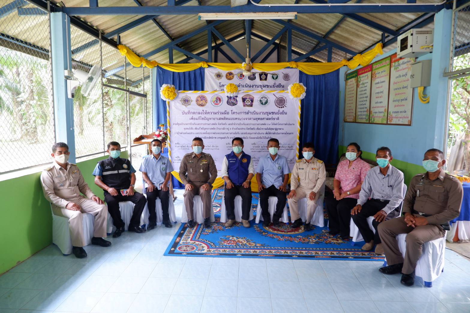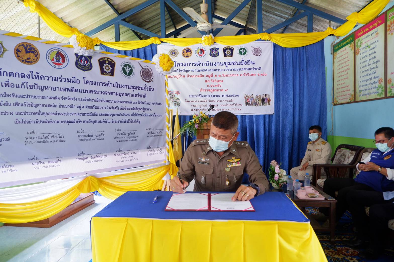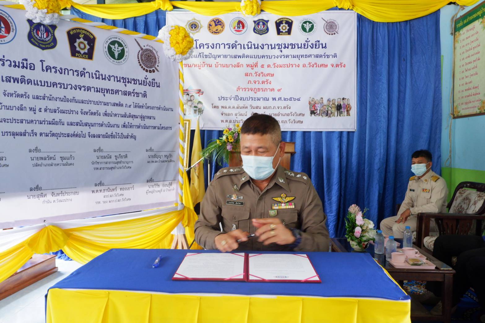 วัตถุประสงค์ของโครงการ การปฏิบัติงานโครงการดำเนินงานชุมชนยั่งยืน เพื่อแก้ไขปัญหายาเสพติด แบบครบวงจรตามยุทธศาสตร์ชาติ โดยชุดปฏิบัติการชุมชนยั่งยืนจะเข้ามาดำเนินงานตามกระบวนการในบ้านบางลึก หมู่ที่ 5 ต.วังมะปราง อ.วังวิเศษ จ.ตรัง เป็นระยะเวลา 3 เดือน เริ่มตั้งแต่วันที่ 1 มิถุนายน-31 สิงหาคม 2564 ชุดปฏิบัติการชุมชนยั่งยืนประกอบด้วย เจ้าหน้าที่ตำรวจ จำนวน 7 นาย เจ้าหน้าที่ฝ่ายปกครอง จำนวน 5 นาย เจ้าหน้าที่ฝ่ายสาธารณสุข จำนวน 7 นาย ซึ่งการลงนามในบันทึกข้อตกลงความร่วมมือ เพื่อเป็นการประสานงาน สนับสนุนการดำเนินงาน ให้การดำเนินงานตามโครงการเป็นไปอย่างมีประสิทธิภาพ บรรลุผลสำเร็จตามวัตถุประสงค์ต่อไป และประชุมให้ความรู้ แกนนำชุมชน ประชาชน เพื่อสร้างความน่าเชื่อถือแก่ชาวบ้าน และได้รับความร่วมมือจากชาวบ้านยิ่งขึ้น ที่มาร่วมพิธี