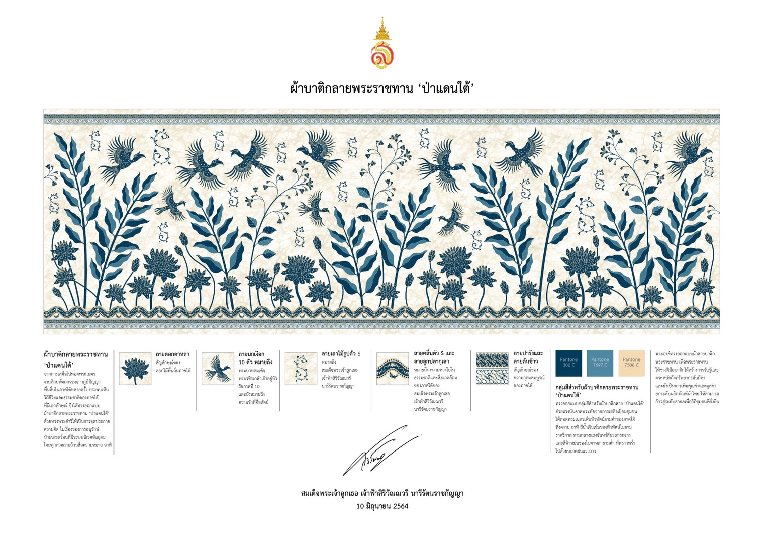 ผ้าบาติกลายพระราชทาน ‘ป่าแดนใต้’ สื่อถึงวิถีชีวิตและธรรมชาติของภาคใต้ที่มีเอกลักษณ์ จึงได้ทรงออกแบบผ้าบาติกลายพระราชทาน ‘ป่าแดนใต้’ ด้วยทรงพระดำริให้เป็นการจุดประกายความคิด ในเรื่องของการอนุรักษ์ป่าฝนเขตร้อนที่มีระบบนิเวศอันอุดม ลวดลายประกอบด้วย ลายดอกดาหลาสัญลักษณ์ของดอกไม้พื้นถิ่นภาคใต้ ,ลายนกเงือก 10 ตัว หมายถึง พระบาทสมเด็จ พระวชิรเกล้าเจ้าอยู่หัว และยังหมายถึงความรักที่ซื่อสัตย์ ,ลายเถาไม้รูปตัว S หมายถึง สมเด็จพระเจ้าลูกเธอ เจ้าฟ้าสิริวัณณวรี นารีรัตนราชกัญญา ,ลายคลื่นตัว S และลายลูกปลากุเลา หมายถึง ความห่วงใยในธรรมชาติและสิ่งแวดล้อม ของภาคใต้ของ สมเด็จพระเจ้าลูกเธอ เจ้าฟ้าสิริวัณณวรี นารีรัตนราชกัญญา ,ลายปารังและลายต้นข้าว สัญลักษณ์ของความอุดมสมบูรณ์ของภาคใต้