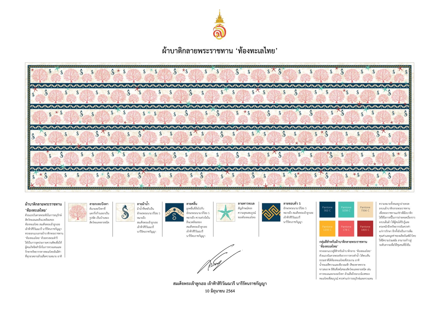 ผ้าบาติกลายพระราชทาน “ท้องทะเลไทย” ด้วยแรงบันดาลพระทัยในการอนุรักษ์สัตว์ทะเลและสิ่งแวดล้อมของท้องทะเลไทย สมเด็จพระเจ้าลูกเธอเจ้าฟ้าสิริวัณณวรี นารีรัตนราชกัญญา ทรงออกแบบลายผ้าบาติกพระราชทาน ‘ท้องทะเลไทย’ ด้วยทรงพระดำริ ให้เป็นการจุดประกายความคิดเพื่อให้ ผู้คนเกิดจิตสำนึกในการหวงแหนและรักษาทรัพยากรทางทะเลไทยอันมีค่า ลวดลายประกอบด้วย ลายกะละปังหา หมายถึง ต้นกะละปังหาที่แตกกิ่งก้านออกเป็นรูปพัด เป็นบ้านของสัตว์ทะเลหลายชนิด ,ลายม้าน้ำ ม้าน้ำที่ขดตัวเป็นอักษรพระนามาภิไธย S หมายถึง สมเด็จพระเจ้าลูกเธอ เจ้าฟ้าสิริวัณณวรี นารีรัตนราชกัญญา ,ลายคลื่น ลูกคลื่นที่ล้อไปกับอักษรพระนามาภิไธย S หมายถึง ความห่วงใยใน สิ่งแวดล้อมของ สมเด็จพระเจ้าลูกเธอ เจ้าฟ้าสิริวัณณวรี นารีรัตนราชกัญญา ,ลายดาวทะเล หมายถึง สัญลักษณ์ของความอุดมสมบูรณ์ของท้องทะเลไทย ,ลายขอบตัว S อักษรพระนามาภิไธย S หมายถึง สมเด็จพระเจ้าลูกเธอ เจ้าฟ้าสิริวัณณวรี นารีรัตนราชกัญญา