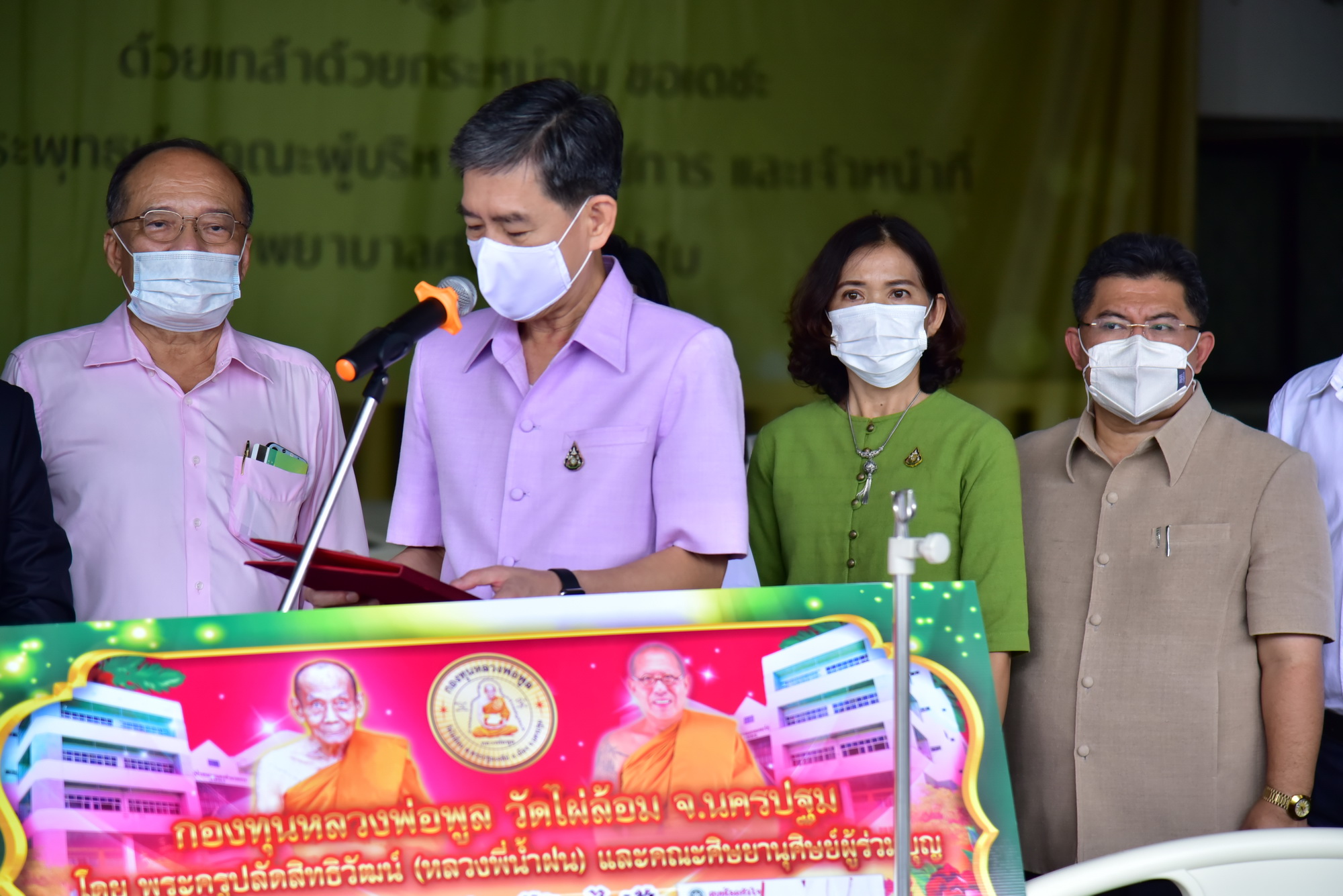 วันที่ 9 มิถุนายน 2564 ที่บริเวณอาคารอำนวยการ โรงพยาบาลนครปฐม นายสุรศักดิ์ เจริญศิริโชติ ผู้ว่าราชการจังหวัดนครปฐม พร้อมด้วยนางวราภรณ์ เจริญศิริโชติ นายกเหล่ากาชาดจังหวัดนครปฐม นายยุทธนา โพธิวิหค นายอำเภอเมืองนครปฐม แพทย์หญิงดารารัตน์ รัตนรักษ์ ผอ.โรงพยาบาลนครปฐม รับมอบเตียงผู้ป่วยไฟฟ้า จำนวน 97 เตียง ซึ่งกองทุนหลวงพ่อพูล วัดไผ่ล้อม โดยพระครูปลัดสิทธิวัฒน์ และคณะศิษย์ผู้ร่วมทำบุญ ได้มอบเตียงผู้ป่วยไฟฟ้า พร้อมที่นอน และเสาแขวนสายน้ำเกลือให้กับตึกศูนย์โรคหัวใจ โรงพยาบาลนครปฐม เพื่อทดแทนอุปกรณ์เดิมที่เสื่อมสภาพและชำรุด