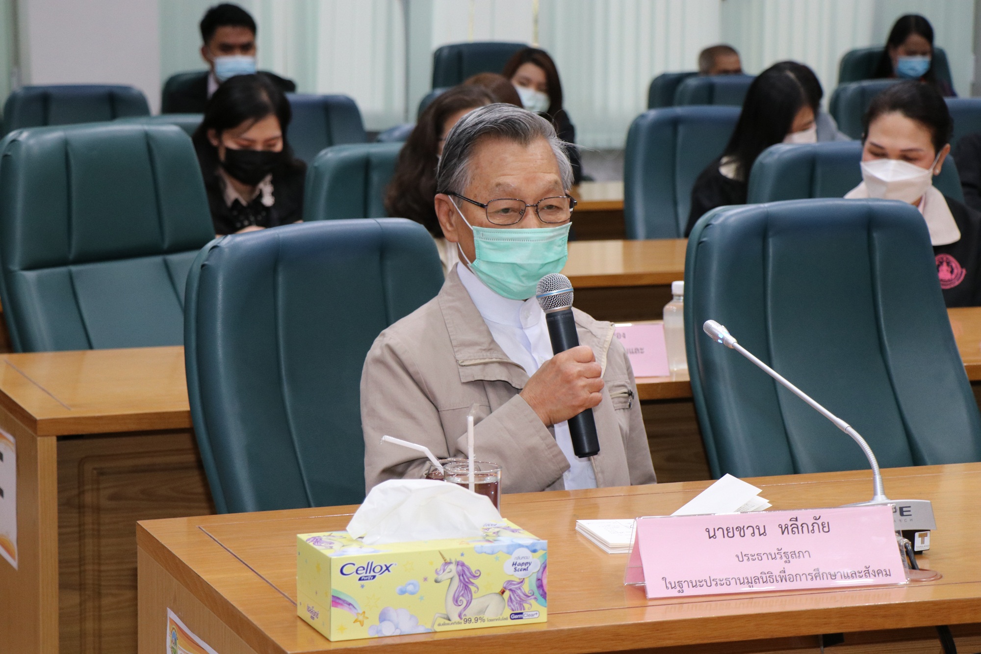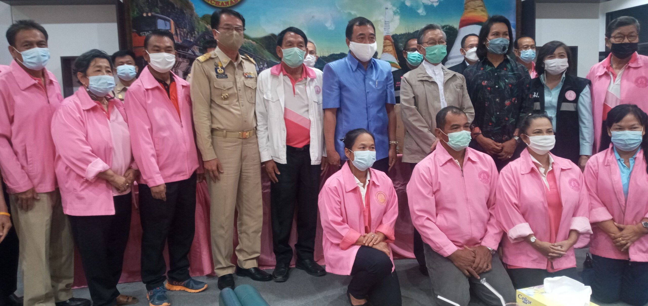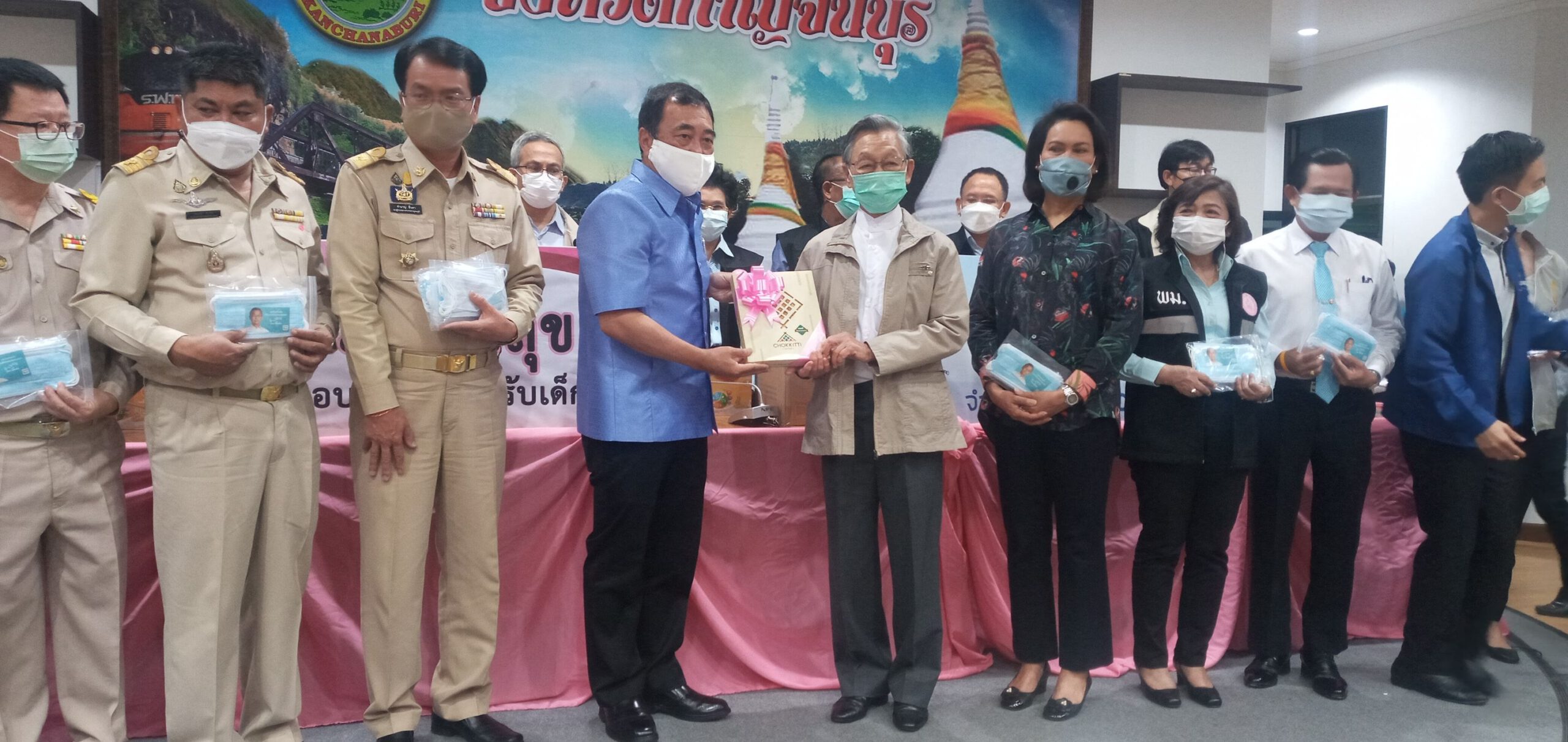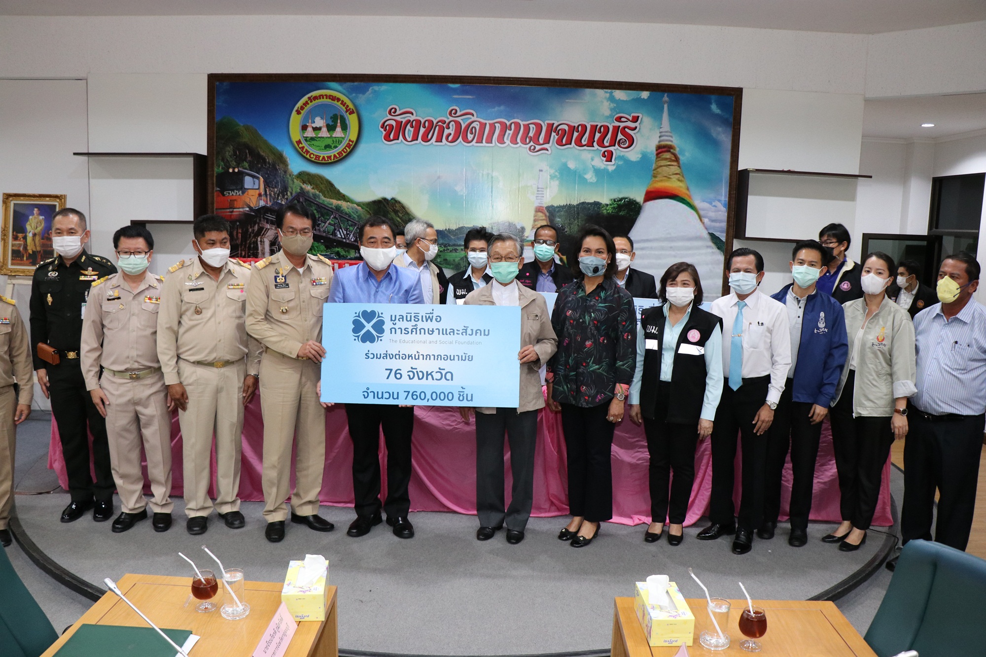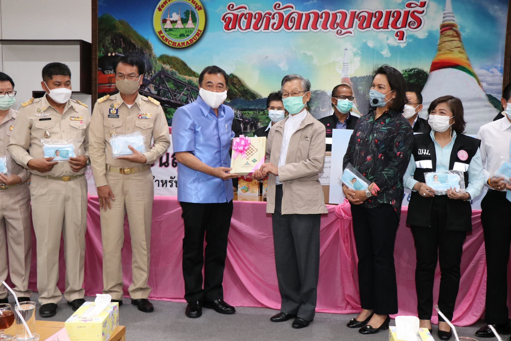 ที่ห้องประชุมแควใหญ่ ชั้น 5 ศาลากลางจังหวัดกาญจนบุรี นายชวน หลีกภัย ประธานรัฐสภาและประธานมูลนิธิเพื่อการศึกษาและสังคมพร้อมคณะผู้บริหารกระทรวงการพัฒนาสังคมและความมั่นคงของมนุษย์ ได้เดินทางมามอบหน้ากากอนามัย จำนวน 10,000 ชิ้น ให้แก่จังหวัดกาญจนบุรี โดย นายจีระเกียรติ ภูมิสวัสดิ์ ผู้ว่าราชการจังหวัดกาญจนบุรีให้การต้อนรับ และรายงานสถานการณ์การแพร่ระบาดของเชื้อไวรัสโควิด-19 และการช่วยเหลือบรรเทาความเดือดร้อนของประชาชนในเบื้องต้น พร้อมด้วย หัวหน้าส่วนราชการ เจ้าหน้าที่ให้การต้อนรับ