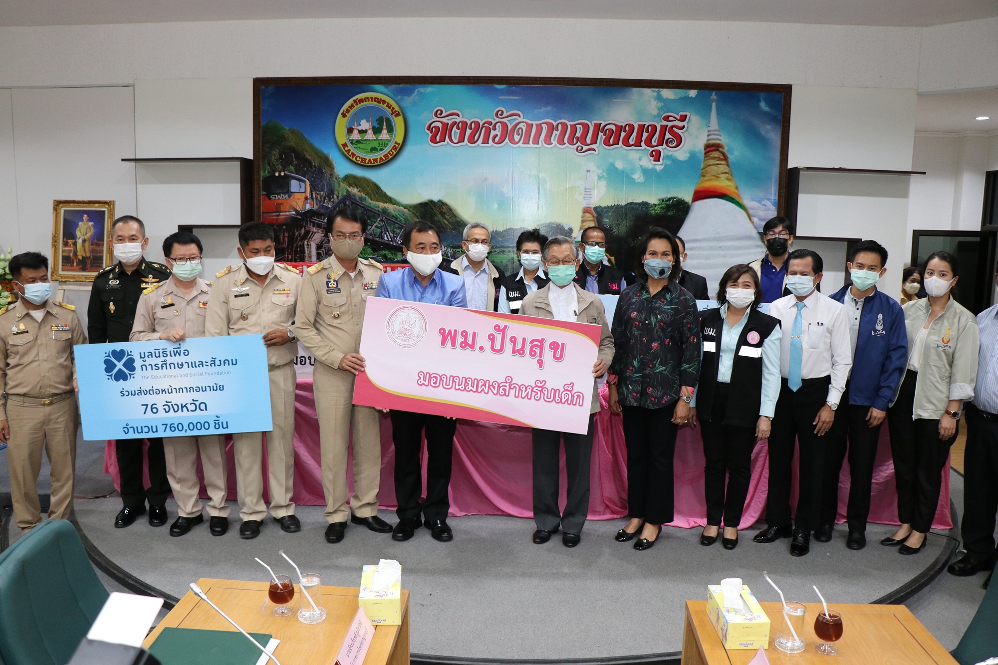 กาญจนบุรี ประธานรัฐสภาในฐานะประธานมูลนิธิเพื่อสังคมและการศึกษามอบหน้ากากอนามัยและนมผงสำหรับเด็กให้กับจังหวัดกาญจนบุรี เพื่อนำไปมอบให้กับประชาชนที่ยังขาดแคลนหน้ากากอนามัย ไว้ใช้สำหรับป้องกันโรคติดเชื้อไวรัสโคโรนา 2019 (โควิด-19)