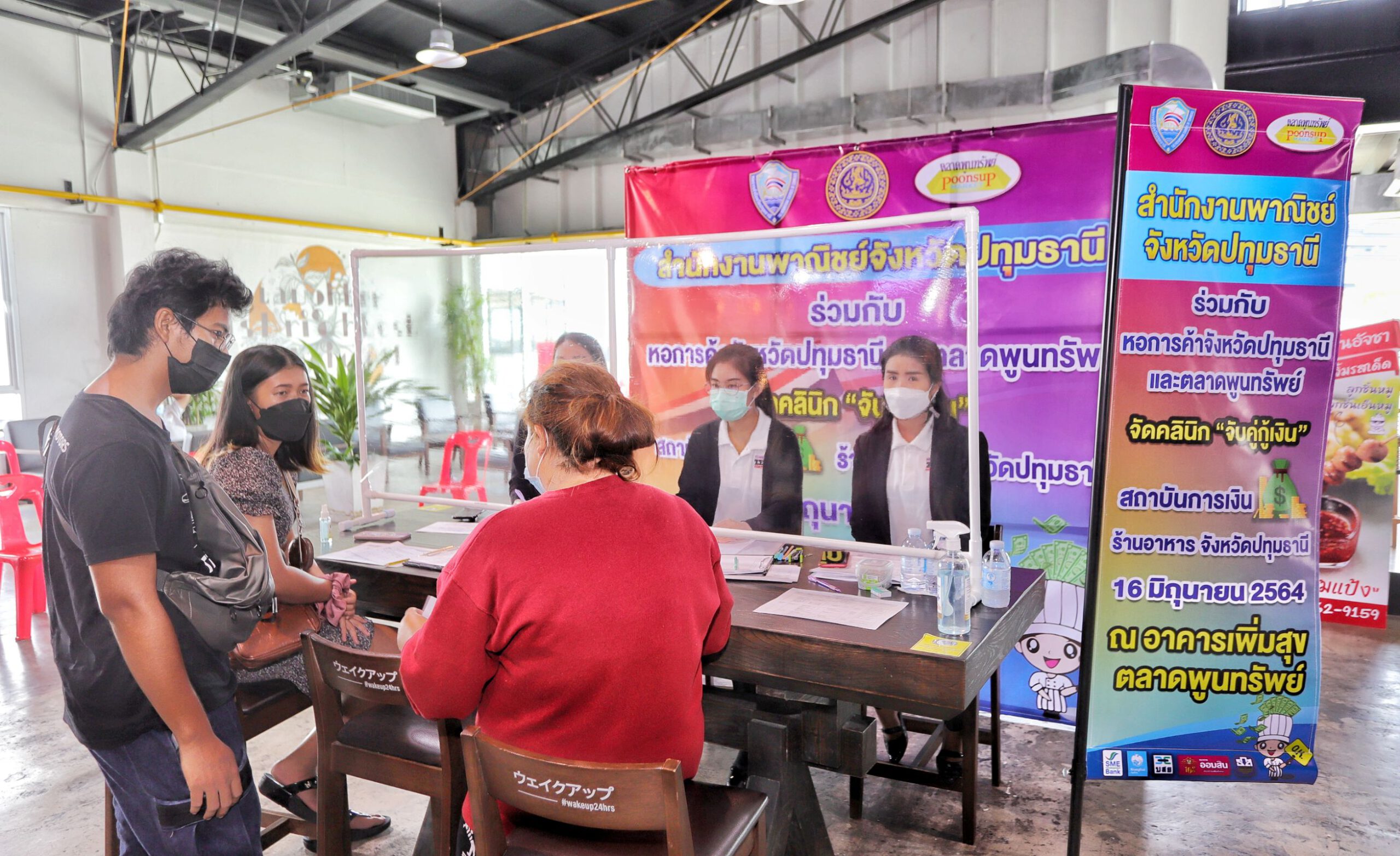 เมื่อเวลา 11.00 น.วันที่ 16 มิถุนายน 2564 ที่ศูนย์อาหาร อาคารเพิ่มสุข ตลาดพูนทรัพย์ สำนักงานพาณิชย์จังหวัดปทุมธานี พร้อมด้วยหอการค้าจังหวัดปทุมธานี ตลาดพูนทรัพย์และสถาบันการเงิน 5 แห่ง จัดคลินิก “จับคู่กู้เงิน” ระหว่างสถาบันการเงินกับร้านอาหารในจังหวัดปทุมธานี ตามนโยบายของนายจุรินทร์ ลักษณวิศิษฏ์ รองนายกรัฐมนตรีและรัฐมนตรีว่าการกระทรวงพาณิชย์ ช่วยเหลือร้านอาหารที่ได้รับผลกระทบจากสถานการณ์โควิด-19 โดยมีสถาบันการเงินที่เข้าร่วมโครงการ ได้แก่ ธนาคารออมสิน ธนาคาร SME D Bank ธนาคารกรุงไทย ธนาคาร ธ.ก.ส. และธนาคาร บสย. เพื่อปล่อยเงินกู้ดอกเบี้ยต่ำและปลอดหลักทรัพย์ในบางกรณี รวมทั้งเงื่อนไขผ่อนปรนอื่น ๆ