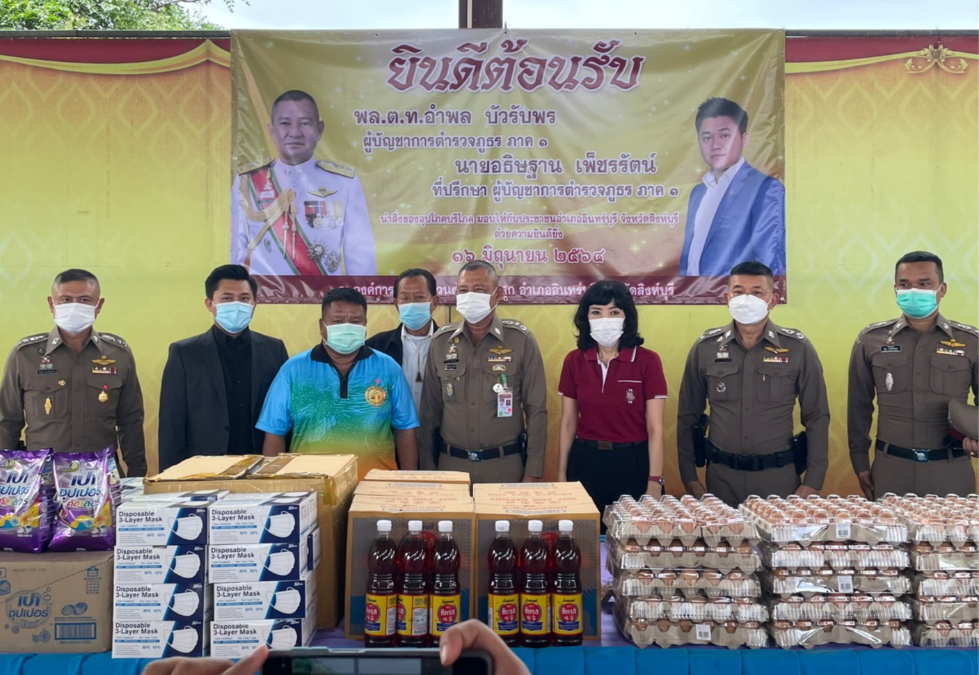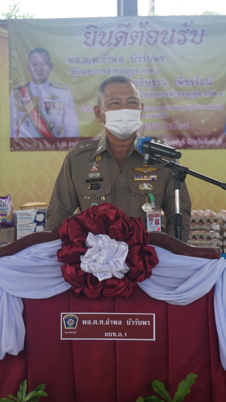 16 มิ.ย. 64 เวลา 11.00 น. พล.ต.ท.อำพล บัวรับพร ผู้บัญชาการตำรวจภูธรภาค 1 พร้อมด้วย คุณนฤมล บัวรับพร ประธานชมรมแม่บ้านตำรวจภูธรภาค 1 คุณอธิษฐาน เพ็ชรรัตน์ ที่ปรึกษา ผบช.ภ.1 และคณะแม่บ้านฯ ได้มีความห่วงใยพี่น้องประชาชนในพื้นที่ ตำบลประศุก อำเภออินทร์บุรี จังหวัดสิงห์บุรี และได้จัดหาสิ่งของอุปโภค-บริโภค จำนวน 102 ชุด มามอบให้กับประชาชนซึ่งส่วนใหญ่เป็นผู้สูงอายุ รวมทั้งผู้ป่วยติดเตียง เพื่อช่วยบรรเทาความเดือดร้อน เนื่องจากได้รับผลกระทบจากการแพร่ระบาดของโรคติดเชื้อไวรัสโคโรนา 2019 (COVID-19)