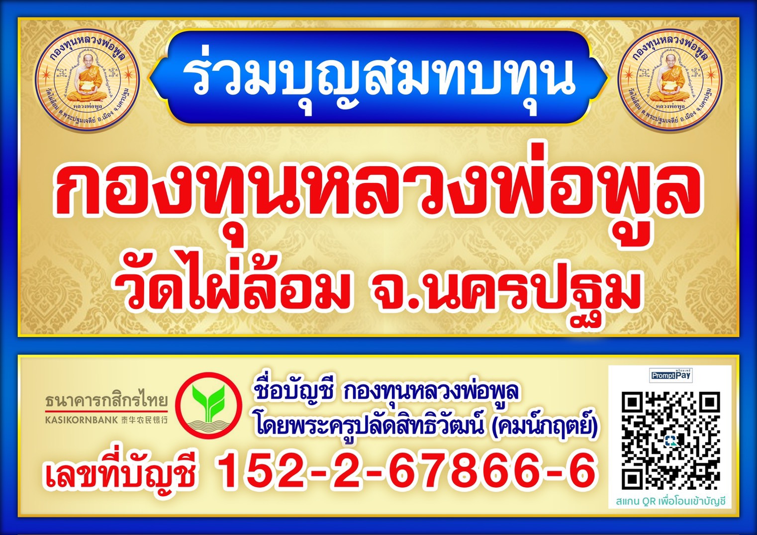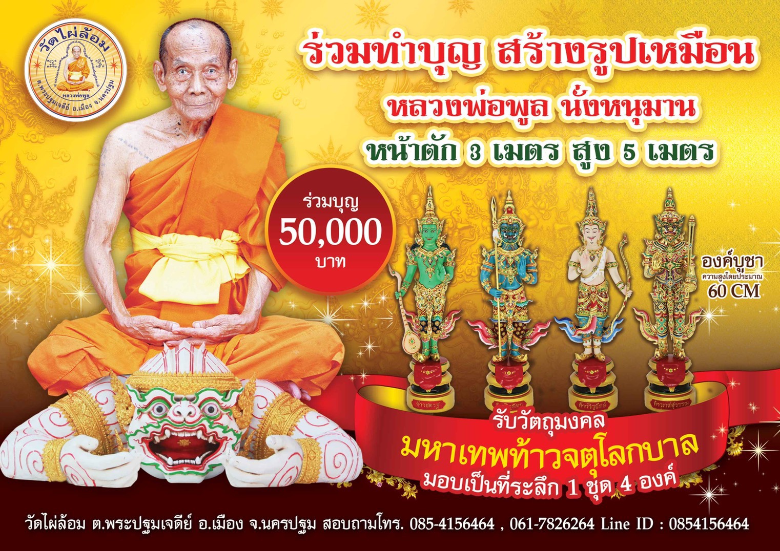 ร่วมทำบุญ สร้างรูปเหมือน หลวงพ่อพูล นั่งหนุมาน หน้าตัก3เมตร สูง5เมตร ร่วมบุญ 50,000 บาท รับมอบองค์มหาเทพท้าวจตุโลกบาล ทั้ง 4 มอบเป็นที่ระลึก 1 ชุด 4 องค์ ร่วมบุญได้ที่ วัดไผ่ล้อม ต.พระปฐมเจดีย์ อ.เมือง จ.นครปฐม สอบถามโทร 085-4156464,061-7826264 Line ID:085-4156464
