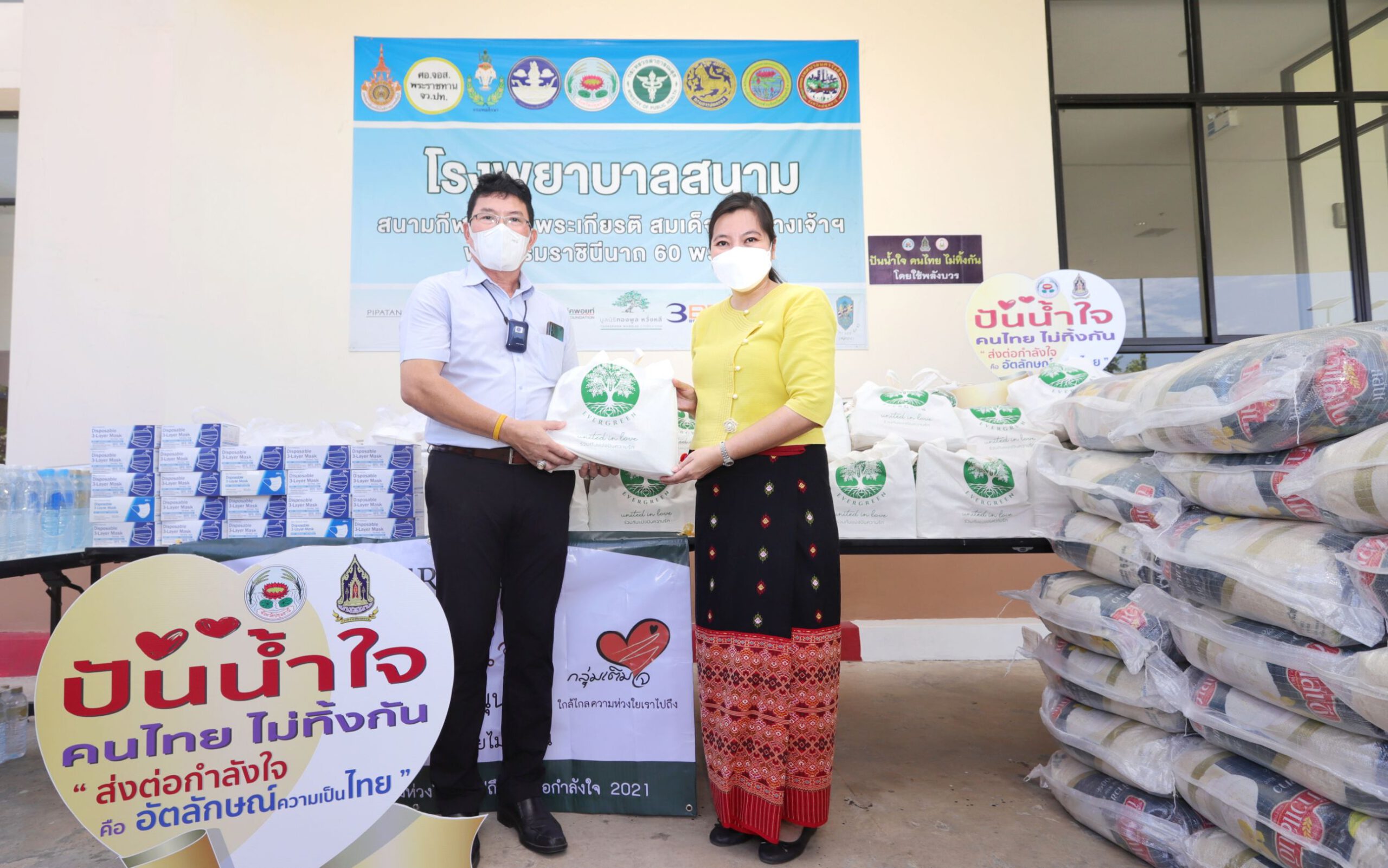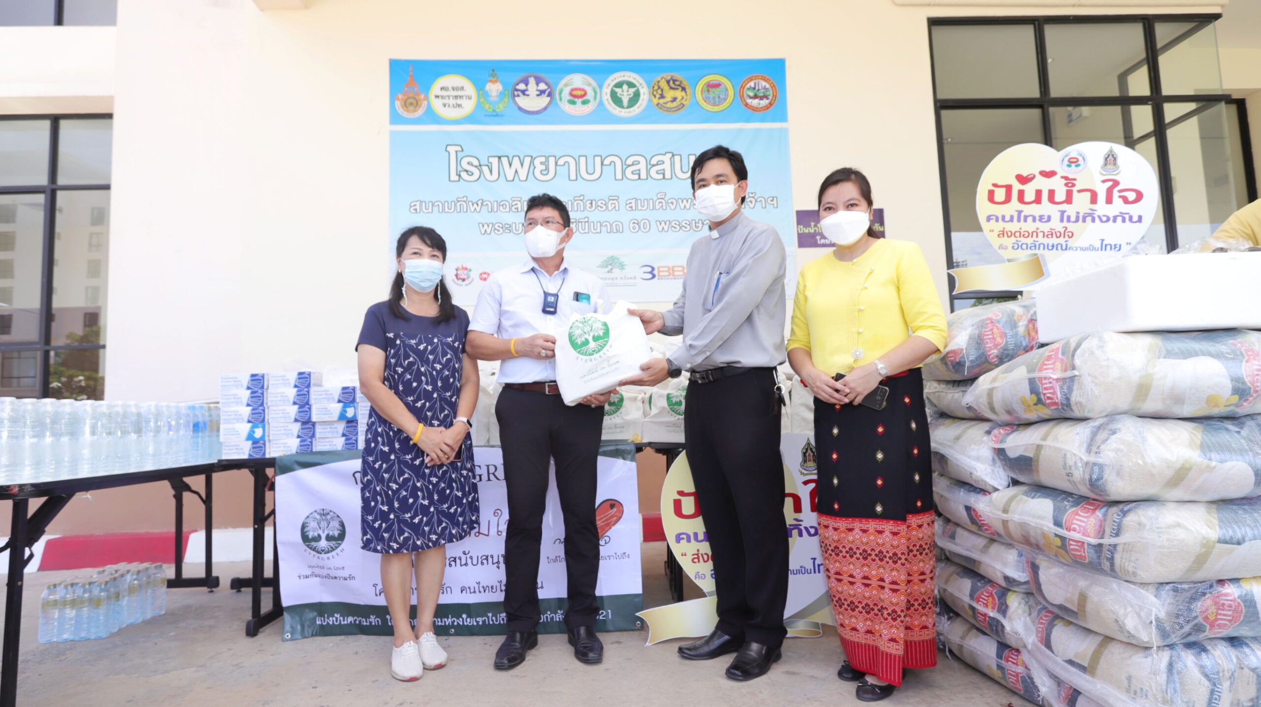 เมื่อเวลา 11.00 น. วันที่ 20 มิ.ย.64 ที่โรงพยาบาลสนาม สนามกีฬาเฉลิมพระเกียรติ สมเด็จพระนางเจ้าสิริกิติ์ พระบรมราชินีนาถ 60 พรรษา ตำบลรังสิต อำเภอธัญบุรี จังหวัดปทุมธานี นางสาวฐิต์ณัฐ สมบัติศิริ วัฒนธรรมจังหวัดปทุมธานี นายอารชวิน ภู่หิรัย์วงศ์สุข ปลัดอำเภอธัญบุรี พร้อมด้วย คุณพ่อเปาโล ไตรรงค์ มุลตรี วัดนักบุญมาร์โก ปทุมธานี นางเกศินี สุขสิริสรณ์ ผู้แทนกลุ่ม EVERGREEN และคณะนำถุงปันน้ำใจ 200 ถุง สิ่งของต่างๆ อาทิ ข้าวกล่อง 200 กล่อง ข้าวสาร 20 กระสอบ อาหารแห้ง หน้ากากอนามัย แอลกอฮอล์ เจลล้างมือ และน้ำดื่ม มามอบให้ เพื่อสนับสนุนการทำงานของบุคลากรทางการแพทย์ เจ้าหน้าที่ และผู้ป่วยโควิด ที่รักษาตัว ภายใต้โครงการ “ปันน้ำใจ คนไทยไม่ทิ้งกัน” โดยมี นายแพทย์รังสรรค์ บุตรชา ผู้อำนวยการโรงพยาบาลประชาธิปัตย์ และผู้อำนวยการโรงพยาบาลสนามเฉลิมพระเกียรติฯ เป็นผู้รับมอบ เพื่อนำไปช่วยเหลือผู้ป่วยโควิด-19 และให้กับบุคลากรการแพทย์ในการปฏิบัติภารกิจช่วยเหลือผู้ป่วย