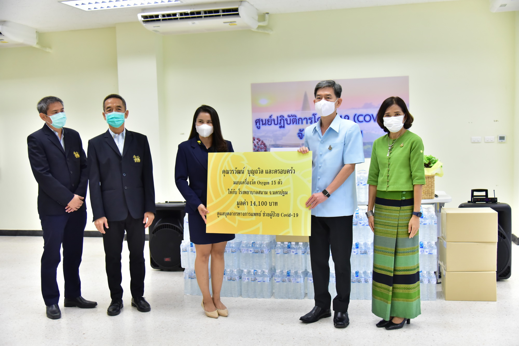 – สมาชิกบิสคลับนครปฐม และสโมสรไลออนส์นครปฐม มอบผ้าปูที่นอน จำนวน 100 ชุด หน้ากากอนามัย จำนวน 6 กล่อง ชุด PPE จำนวน 20 ชุด และเครื่องอุปโภคบริโภค – นายวรวัฒน์ บุญถวิล และครอบครัว มอบเครื่องวัดออกซิเจน จำนวน 15 ตัว มูลค่า 14,100 บาท