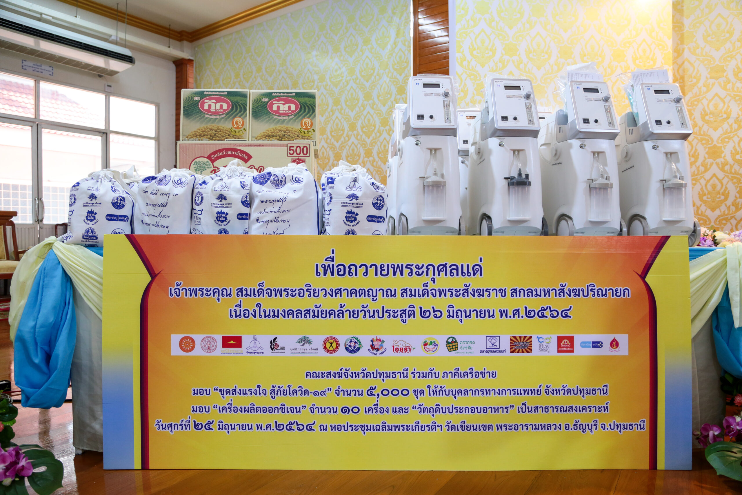 วันที่ 25 มิถุนายน พ.ศ.2564 เวลา 14.00 น. ณ หอประชุมเฉลิมพระเกียรติฯ วัดเขียนเขต พระอารามหลวง อ.ธัญบุรี จ.ปทุมธานี ได้จัดให้มีพิธีเจริญพระพุทธมนต์ เจริญจิตภาวนา ผ่านช่องทาง Online สื่ออิเล็คทรอนิกส์ระบบ Zoom, พิธีมอบ “ชุดส่งแรงใจ สู้ภัยโควิด-19”จำนวน 5,000 ชุด ให้กับแพทย์ บุคลากรทางการแพทย์ และเจ้าหน้าที่ผู้ปฏิบัติงานควบคุมป้องกันการแพร่ระบาดของโรคโควิด-19 จังหวัดปทุมธานี และพิธีมอบ “เครื่องผลิตออกซิเจน” จำนวน 10 เครื่อง และมอบ “วัตถุดิบประกอบอาหาร” ด้วยห่วงใยช่วยเหลือผู้ป่วยติดเชื้อโควิด-19 เป็นสาธารณสงเคราะห์ เพื่อถวายพระกุศลแด่เจ้าพระคุณสมเด็จพระอริยวงศาคตญาณ สมเด็จพระสังฆราช สกลมหาสังฆปริณายก เนื่องในมงคลสมัยคล้ายวันประสูติ 26 มิถุนายน พ.ศ.2564
