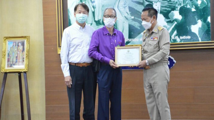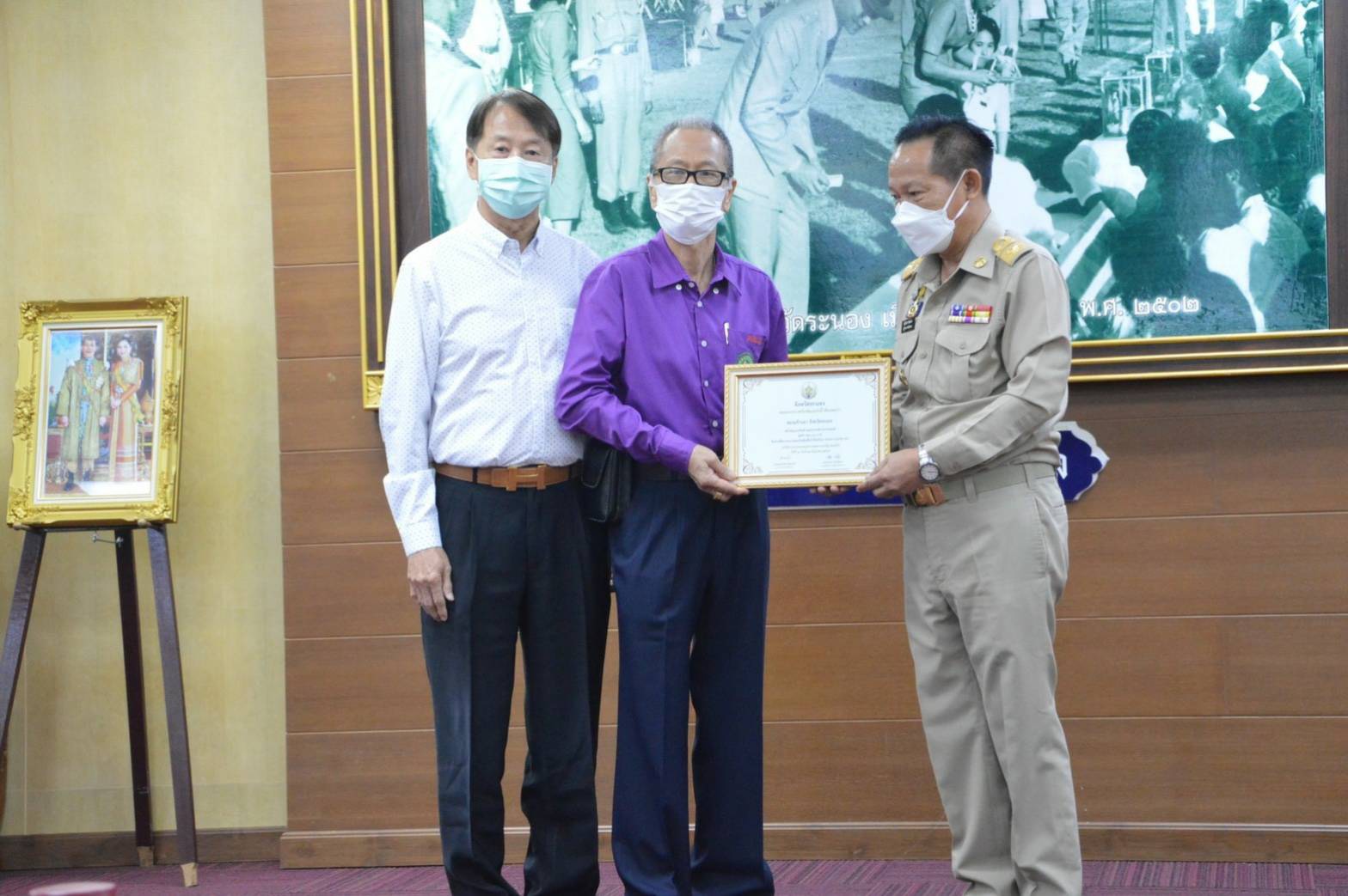 นาย อภิชัย จุลสราภรณ์ (ร้านขายยาจี่อันตึ้ง ปากน้ำระนอง) ประธานชมรมร้านขายยาจังหวัดระนอง พร้อมด้วย คุณบูรพงษ์ ที่ปรึกษาชมรมร้านขายยาจังหวัด ระนองเข้ารับใบประกาศนีบัตรเกียรติคุณ จากนาย สมเกียรติ ศรีษะเนตร ผู้ว่าราชการจังหวัดระนองในโอกาสร่วม บริจาคอุปกรณ์การแพทย์ให้ สำนักงานสาธารณสุขจังหวัดระนอง และโรงพยาบาลระนอง เพื่อนำไปใช้ช่วยเหลือ ผู้ป่วย ในภาวะ โควิด 19ระบาด ณ ศาลากลางจังหวัดระนอง