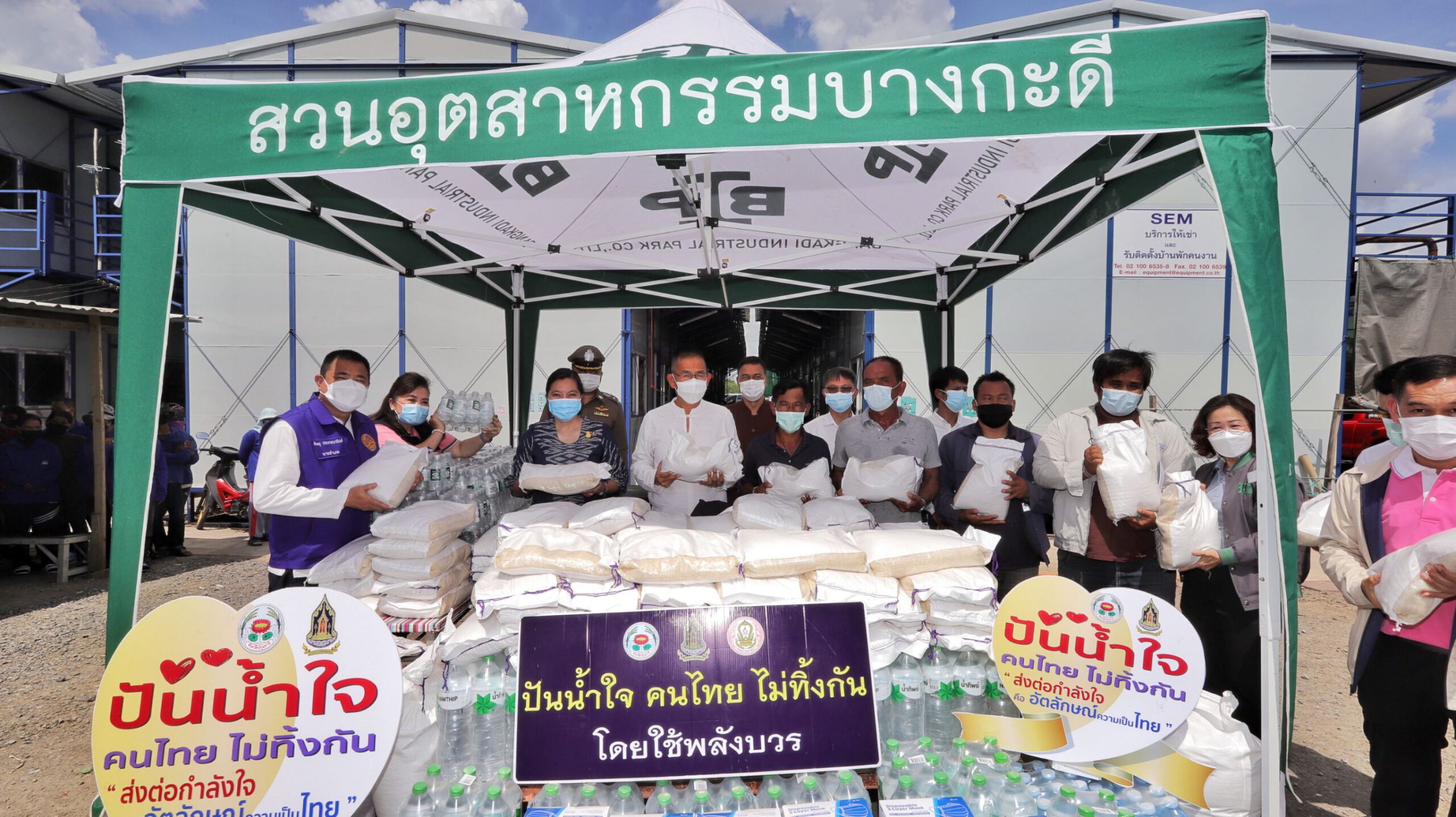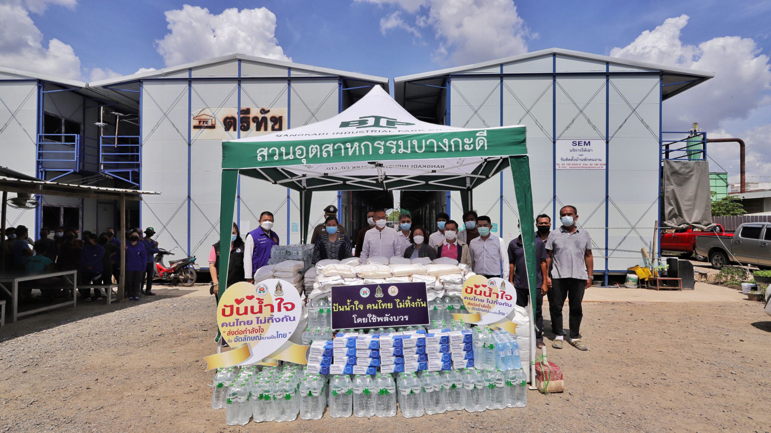เมื่อเวลา 14.00 น.วันที่ 29 มิ.ย.2564 ที่แคมป์งานก่อสร้างบริษัทตรีทัช ที่ทำโครงการก่อสร้างคลังสินค้า ตำบลบ้านใหม่ อำเภอเมือง จังหวัดปทุมธานี นายชัยวัฒน์ ชื่นโกสุม ผู้ว่าราชการจังหวัดปทุมธานี พร้อมนายพิษณุ ประภาธนานันท์ นายอำเภอเมืองปทุมธานี นายศักดิ์ศิลป์ ตุลาธร สวัสดิการและคุ้มครองแรงงานจังหวัดปทุมธานี ดร.สุชาติ เปรมสุริยา ประกันสังคมจังหวัดปทุมธานี นางสาวฐิต์ณัฐ สมบัติศิริ วัฒนธรรมจังหวัดปทุมธานี นางสุจินต์ ธำรงค์เทพพิทักษ์ ผู้จัดการทั่วไป บริษัท สวนอุตสาหกรรมบางกะดี จำกัด เจ้าหน้าที่ตำรวจ เจ้าหน้าที่ฝ่ายปกครอง กำนัน ผู้ใหญ่ และหน่วยงานที่เกี่ยวข้องเข้าร่วมลงพื้นที่แคมป์ที่พักคนงาน เพื่อสร้างความเข้าใจเกี่ยวกับการให้ความช่วยเหลือ ตามมาตรการในระบบประกันสังคมและการปฏิบัติตัวในระหว่างหยุดงาน พร้อมมอบสิ่งของอุปโภค บริโภค อาทิ ข้าวสาร จำนวน 150 ถุง ( 1 ถุง / 5 กิโล) น้ำดื่ม 1.5ลิตร จำนวน 50 แพ็ค หน้ากากอนามัย จำนวน 50 กล่อง ที่สนับสนุนโดย พระมงคลวโรปการ ที่ปรึกษาเจ้าคณะจังหวัดปทุมธานี เจ้าอาวาสวัดชินวรารามวรวิหาร ในโครงการ ปันน้ำใจ คนไทย ไม่ทิ้งกัน” ใช้พลังบวร เพื่อมอบให้แก่คนงานไว้ประกอบอาหารในระหว่างหยุดงานตามมาตรการจากถูกปิดตามคำสั่ง ศบค.โดยแคมป์คนงานแห่งนี้ มี จำนวนพนักงานที่พักอาศัยในเเคมป์ขณะนี้จำนวน 144 คน เป็นคนไทย 51ราย เมียนมาร์ 78รายและกัมพูชา 15 ราย โดยไม่พบผู้ติดเชื้อ