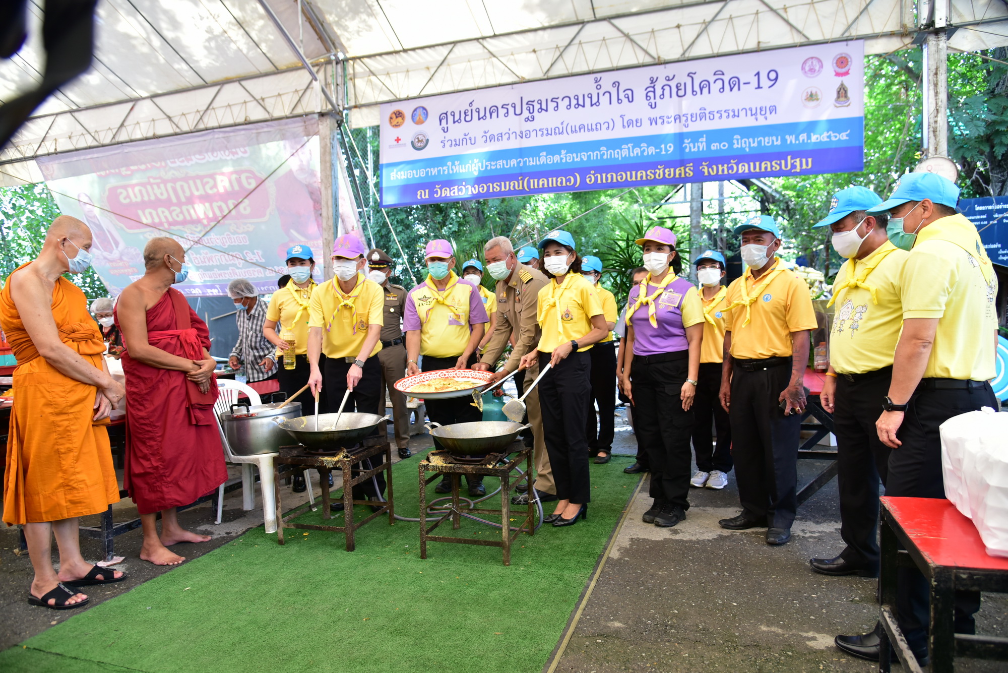 จิตอาสาพระราชทาน ร่วมกิจกรรม นครปฐมร่วมใจ สู้ภัยโควิด-19 โดยจัดทำโรงครัวประกอบอาหาร มอบอาหารปรุงสำเร็จ พร้อมเครื่องอุปโภคบริโภค เพื่อช่วยเหลือกลุ่มเปราะบางที่ได้รับผลกระทบจากสถานการณ์แพร่ระบาดโควิด-19