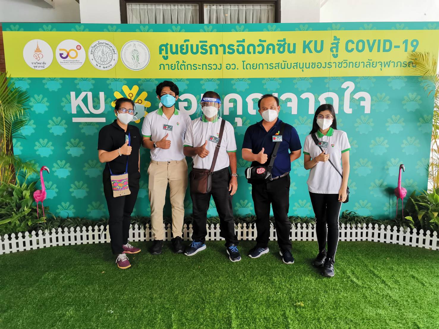 ที่ศูนย์บริการฉีดวัคซีน KU สู้ COVID-19 ภายใต้กระทรวง อว.โดยการสนับสนุนของราชวิทยาลัยจุฬาภรณ์ ภายในอาคารจักรพันธุ์เพ็ญศิริ มหาวิทยาลัยเกษตรศาสตร์ อ.บางเขน กรุงเทพมหานคร คณะจิตอาสาวิทยาลัยเทคโนโลยีปัญญาภิวัฒน์ โดยนางสาววธูสิริ ภูมะธน , นางสาวอรัชพร ล้วนทับทิม สำนักทรัพยากรบุคคล นายรัฎชานนท์ แสนทวีสุข สำนักกิจการนักเรียน นักศึกษา และนายสันธาน ธรรมชัย , นายวิศรุต มีแก้ว สำนักบริหารศูนย์การเรียนปัญญาภิวัฒน์ ได้เดินทางไปร่วมปฏิบัติหน้าที่เป็นจิตอาสาให้บริการประชาชนที่เดินทางไปรับการฉีดวัคซีนป้องกัน COVID-19 โดยปฏิบัติงานภายใต้การกำกับดูแลของทีมแพทย์ พยาบาล และบุคลากรทางการแพทย์ของราชวิทยาลัยจุฬาภรณ์ ซึ่งคณะจิตอาสาได้รับมอบหมายให้ปฏิบัติหน้าที่แนะนำผู้รับการฉีดวัคซีนและแสดงการยกธงแจ้งจุดเคลื่อนย้ายตำแหน่ง การให้บริการฉีดวัคซีนกำหนดบริการรอบละ500คน จัดเป็นแถว25แถวๆละ20คน คณะจิตอาสายังทำหน้าที่แจ้งหน้าที่ทำการตรวจวัดความดันและคอยสังเกตอาการความผิดปกติของผู้รับการฉีดวัคซีนอย่างใกล้ชิด เมื่อฉีดวัคซีนเรียบร้อยแล้วจะให้พักรอดูอาการ25นาที