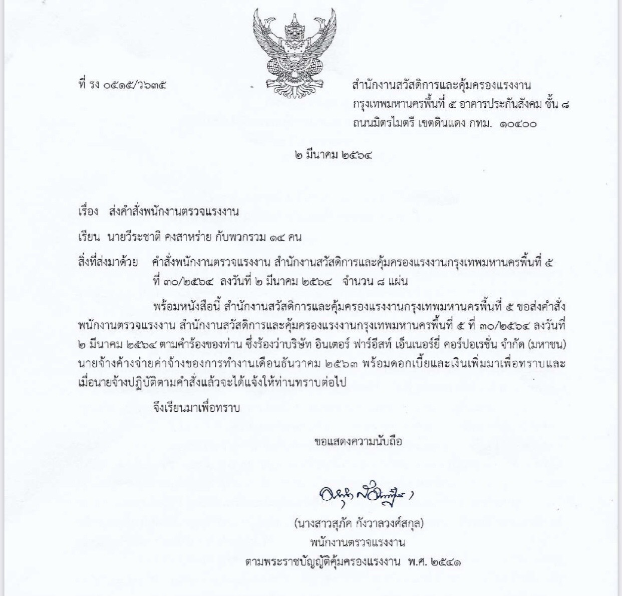 ซึ่งก่อนหน้านี้ พนักงาน IFEC ได้ยื่นร้องต่อสวัสดิการแรงงาน และเมื่อวันที่ 12 พฤษภาคม 2564 ศาลแรงงานกลางได้มีคำสั่งสิ้นสุดแล้วว่า เป็นพนักงานของ IFEC จริง กรรมการบริษัท จึงต้องดำเนินการจ่ายเงินเดือนให้ จึงขอให้นิติกรของสวัสดิการแรงงานเร่งรัดเรื่องดังกล่าว เพราะทราบว่า มีการเรียกกรรมการของ IFEC เมื่อวันที่ 9 กรกฎาคม 2564 มาพบ แต่ก็มีการเลื่อนออกไปอีก ทำให้ล่าช้าไปอีก 2-3 เดือน ซึ่งทำให้พนักงานได้เงินล่าช้าออกไปอีก จนไม่มีเงินเดือนประทังชีพ และมาตรการต่างๆของรัฐ ในช่วงสถานการณ์โควิด ก็ยังไม่เคยได้รับ เพราะปัญหาเรื่องการจดแจ้งประกันสังคมที่ผ่านมา ทำให้ พนักงานได้รับความเดือดร้อนเป็นทวีคูณ