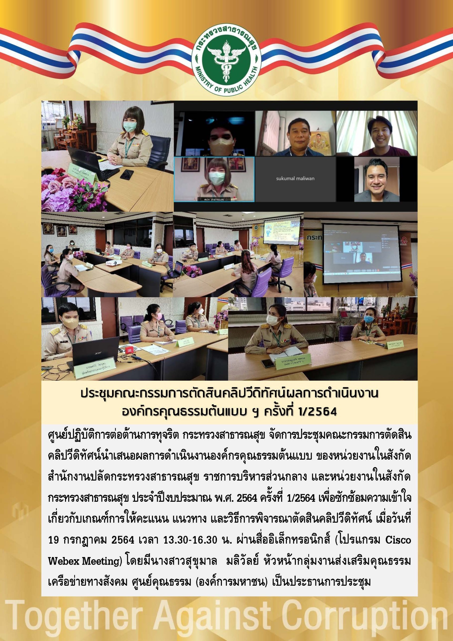 ศูนย์ปฏิบัติการต่อต้านการทุจริต กระทรวงสาธารณสุข จัดการประชุมคณะกรรมการตัดสินคลิปวีดิทัศน์นำเสนอผลการดำเนินงานองค์กรคุณธรรมต้นแบบ ของหน่วยงานในสังกัดสำนักงานปลัดกระทรวงสาธารณสุข ราชการบริหารส่วนกลาง และหน่วยงานในสังกัดกระทรวงสาธารณสุข ประจำปีงบประมาณ พ.ศ. 2564 ครั้งที่ 1/2564 เพื่อซักซ้อมความเข้าใจเกี่ยวกับเกณฑ์การให้คะแนน แนวทาง และวิธีการพิจารณาตัดสินคลิปวีดิทัศน์ เมื่อวันที่ 19 กรกฎาคม 2564 เวลา 13.30-16.30 น. ผ่านสื่ออิเล็กทรอนิกส์ (โปรแกรม Cisco Webex Meeting) โดยมีนางสาวสุขุมาล มลิวัลย์ หัวหน้ากลุ่มงานส่งเสริมคุณธรรมเครือข่ายทางสังคม ศูนย์คุณธรรม (องค์การมหาชน) เป็นประธานการประชุม//