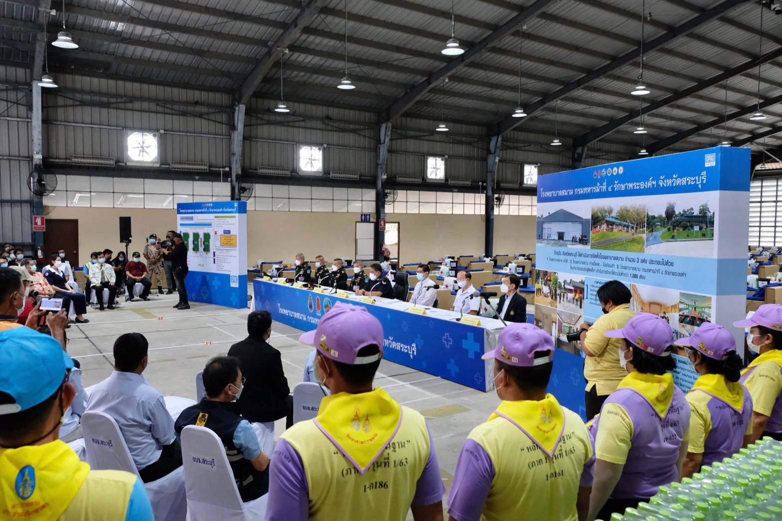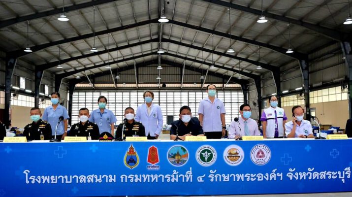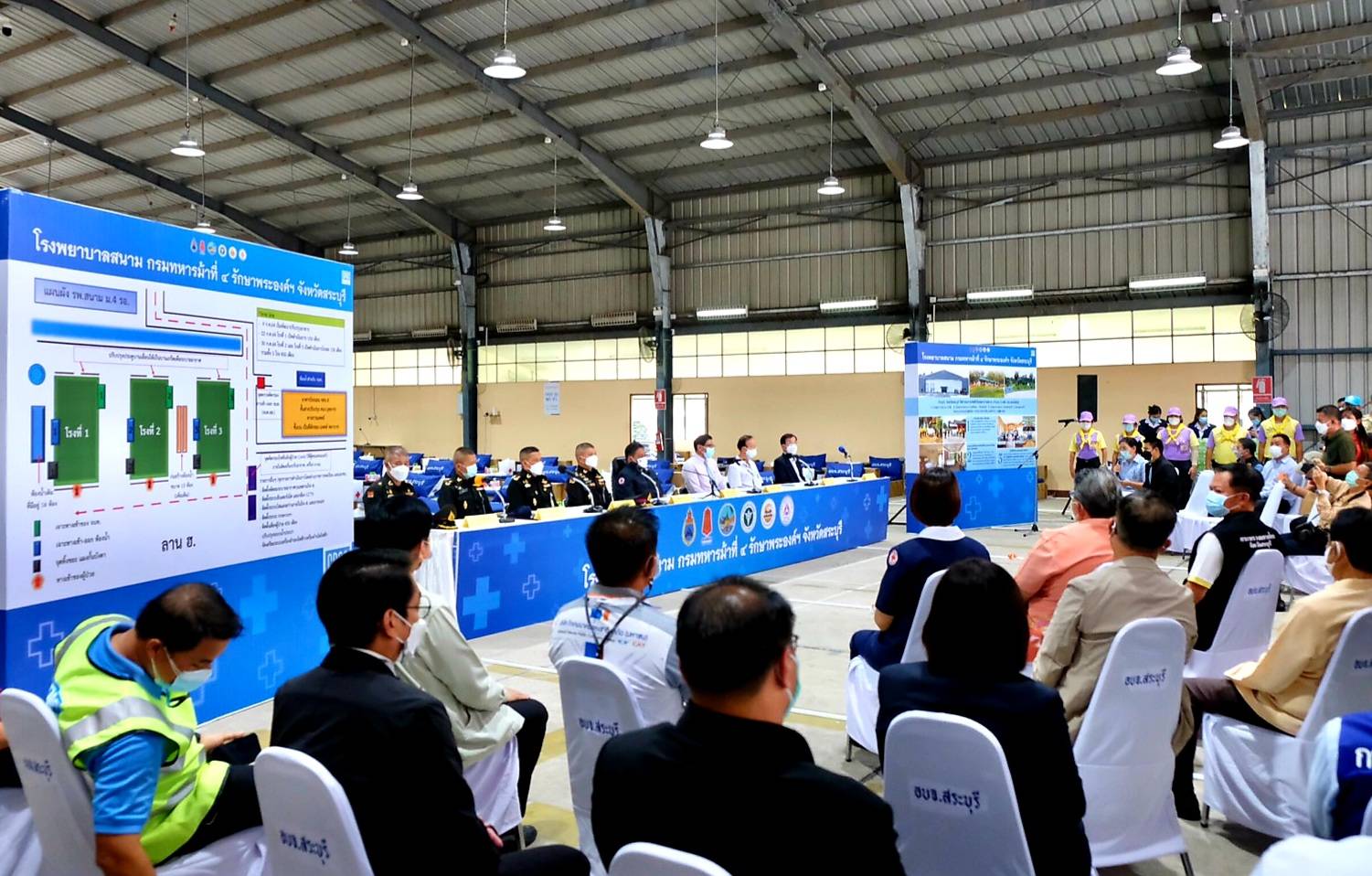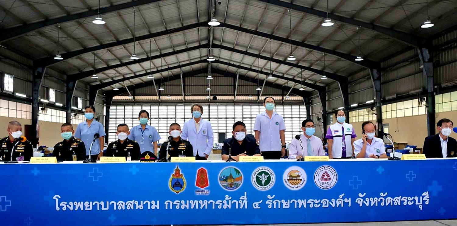 นายเเมนรัตน์ รัตนสุคนธ์ ผู้ว่าราชการจังหวัดสระบุรี พร้อมด้วย นายธนกฤต อัตถะสัมปุณณะ รองนายกองค์การบริหารส่วนจังหวัดสระบุรี พล.ต.อุดม แก้วมหา ผู้บัญชาการกองพลทหารม้าที่ 2 รักษาพระองค์ นายกฤษ์ สกุลแพทย์ นายแพทย์สาธารณสุขจังหวัดสระบุรี และส่วนราชการที่เกี่ยวข้อง จัดงานแถลงข่าวการบริหารจัดการโรงพยาบาลสนาม และผลการดำเนินการป้องกันและควบคุมโรคโควิด-19 ซึ่งจังหวัดสระบุรี บูรณาการทุกภาคส่วน จัดตั้งโรงพยาบาลสนามกรมทหารม้าที่ 4 รักษาพระองค์ โดยใช้โรงจอดอากาศยาน จำนวน 3 โรงเรือน เป็นที่ตั้งเพื่อรับผู้ป่วยเข้ารับการรักษา สามารถรองรับได้ โรงนอนละ 150 เตียง รวมเป็น 450 เตียง ส่วนขยายเพิ่มเติมได้ถึง 600 เตียง