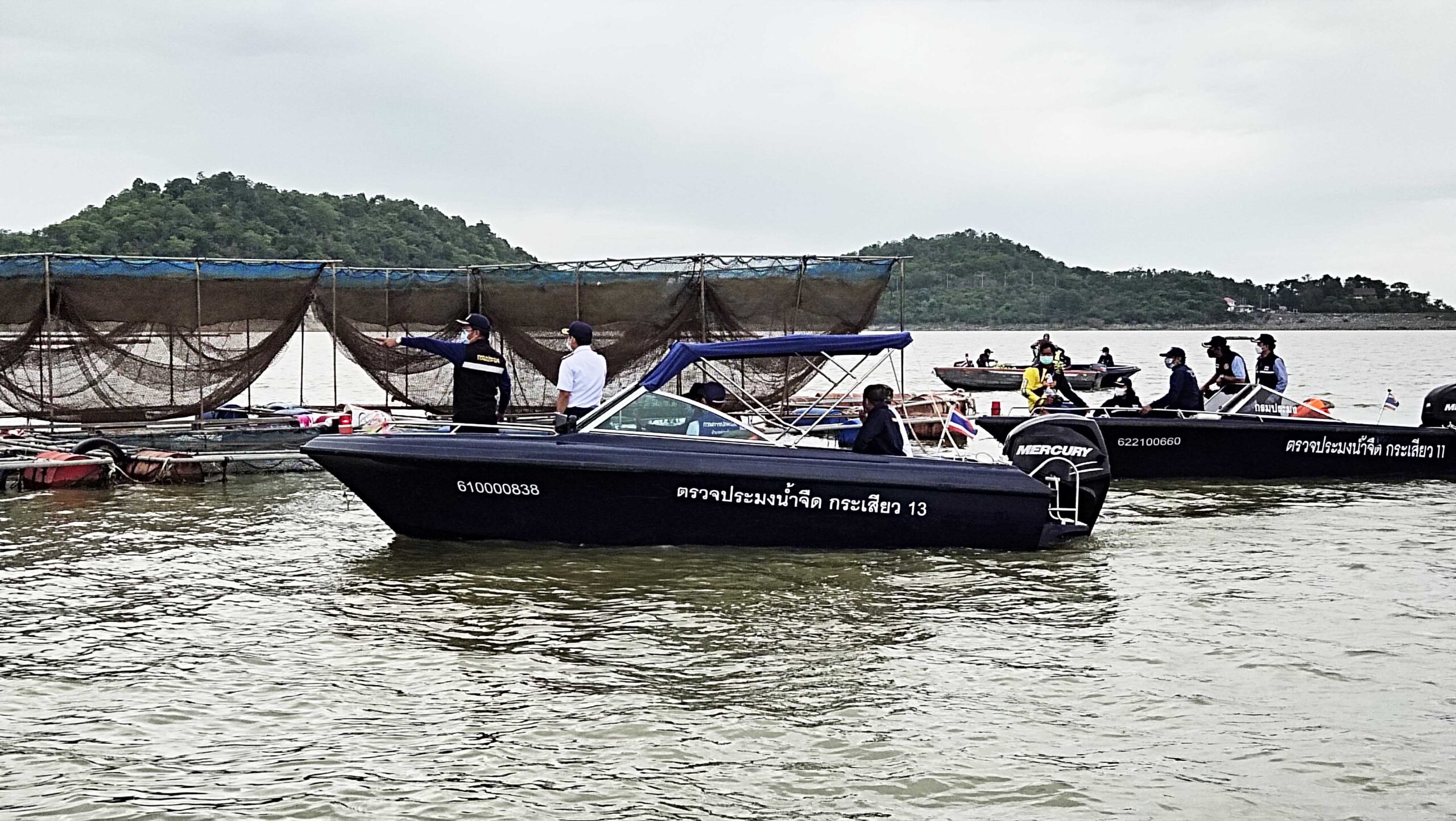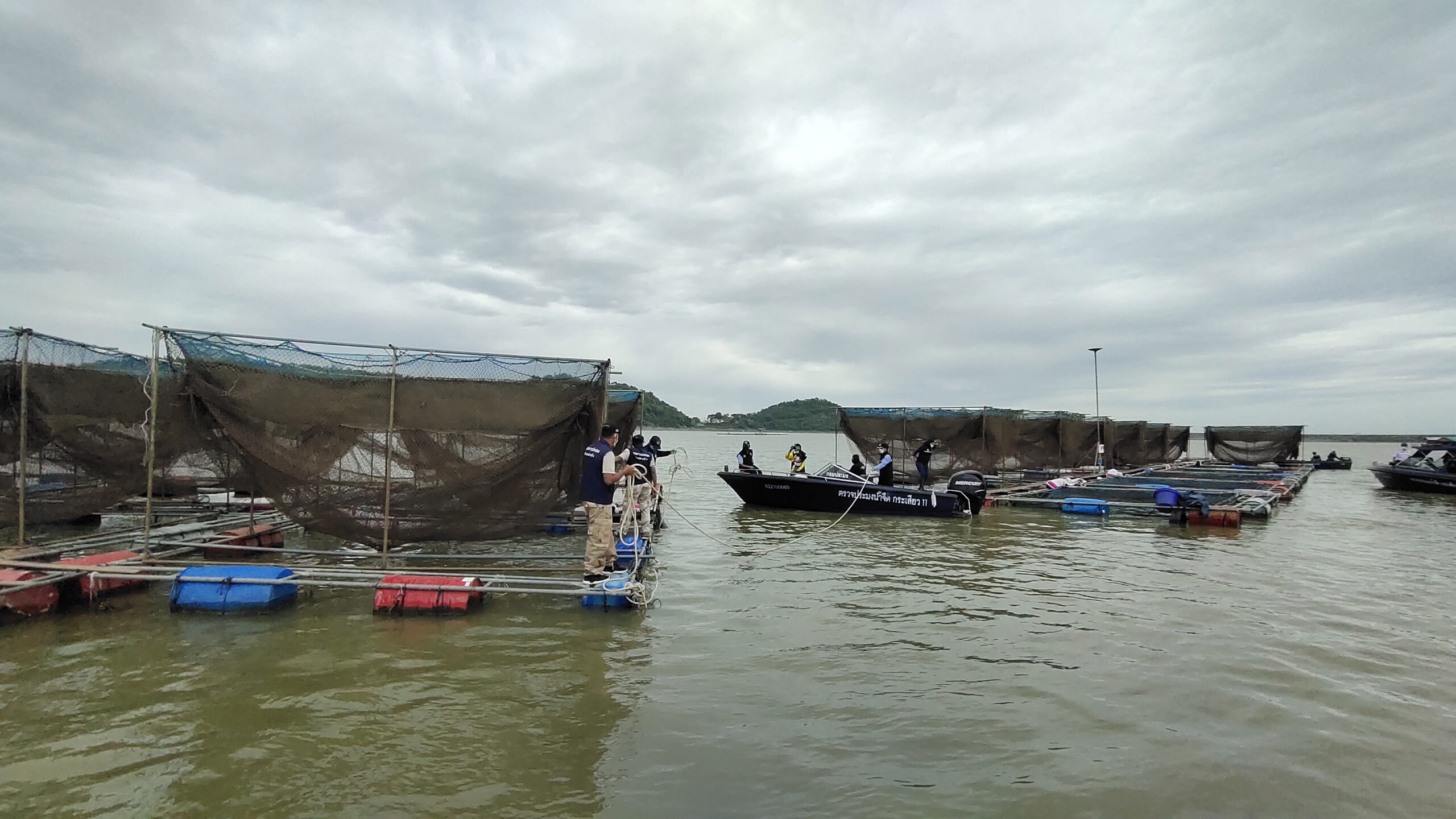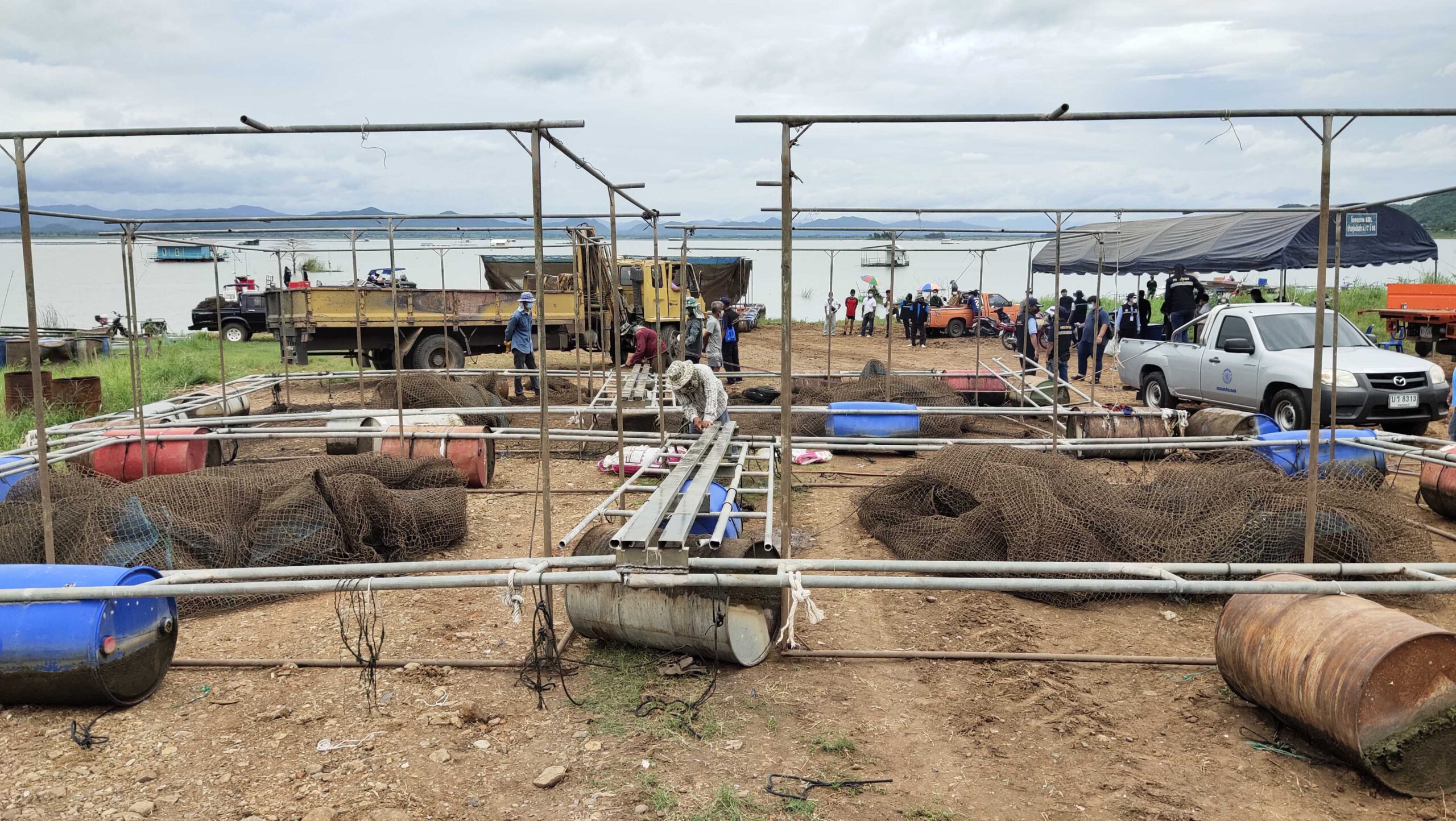 สุพรรณบุรี ประมงนำกำลังรื้อกระชังเลี้ยงปลาเขื่อนกระเสียวหลังจากยืดเยื้อมานาน