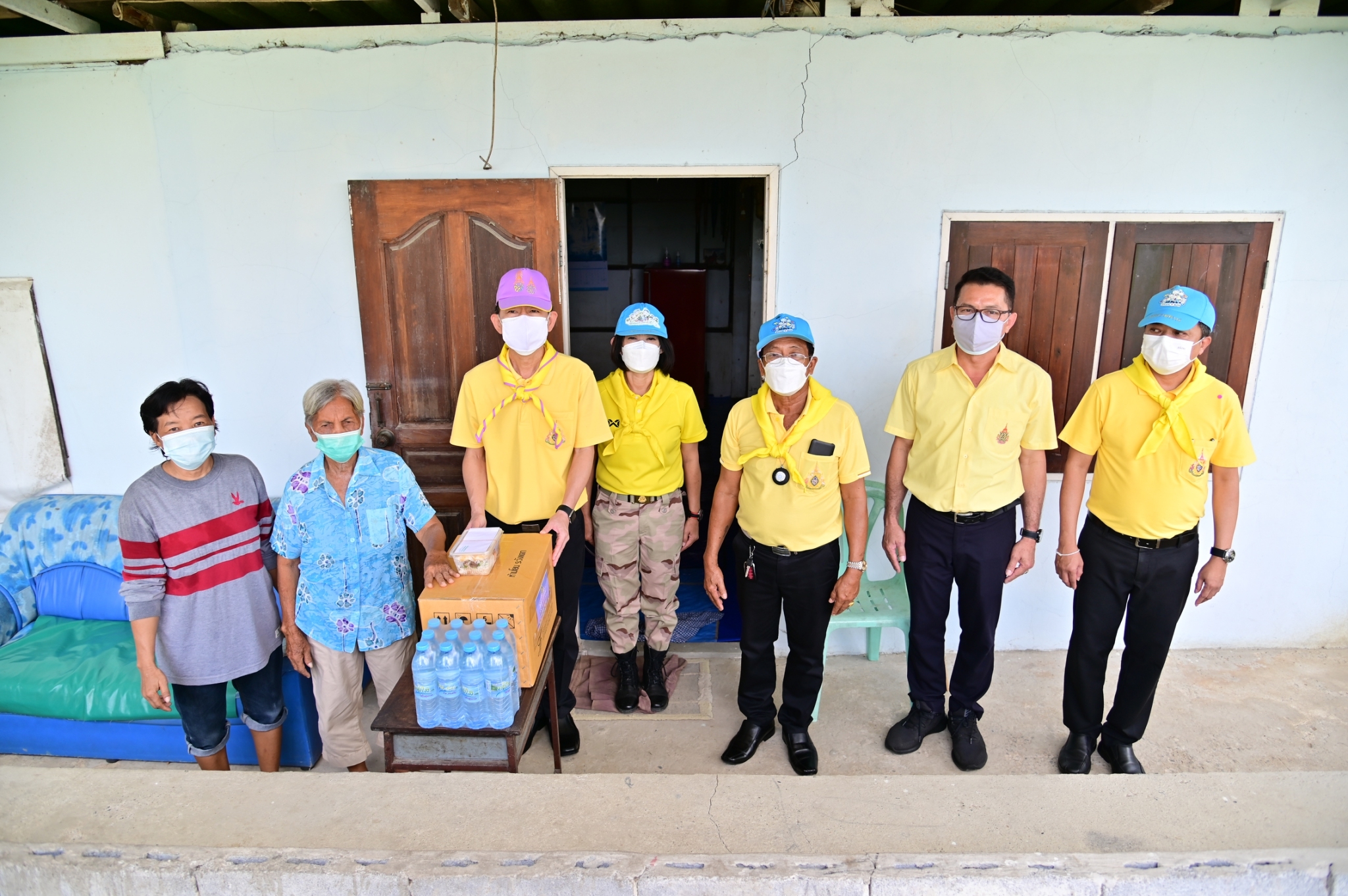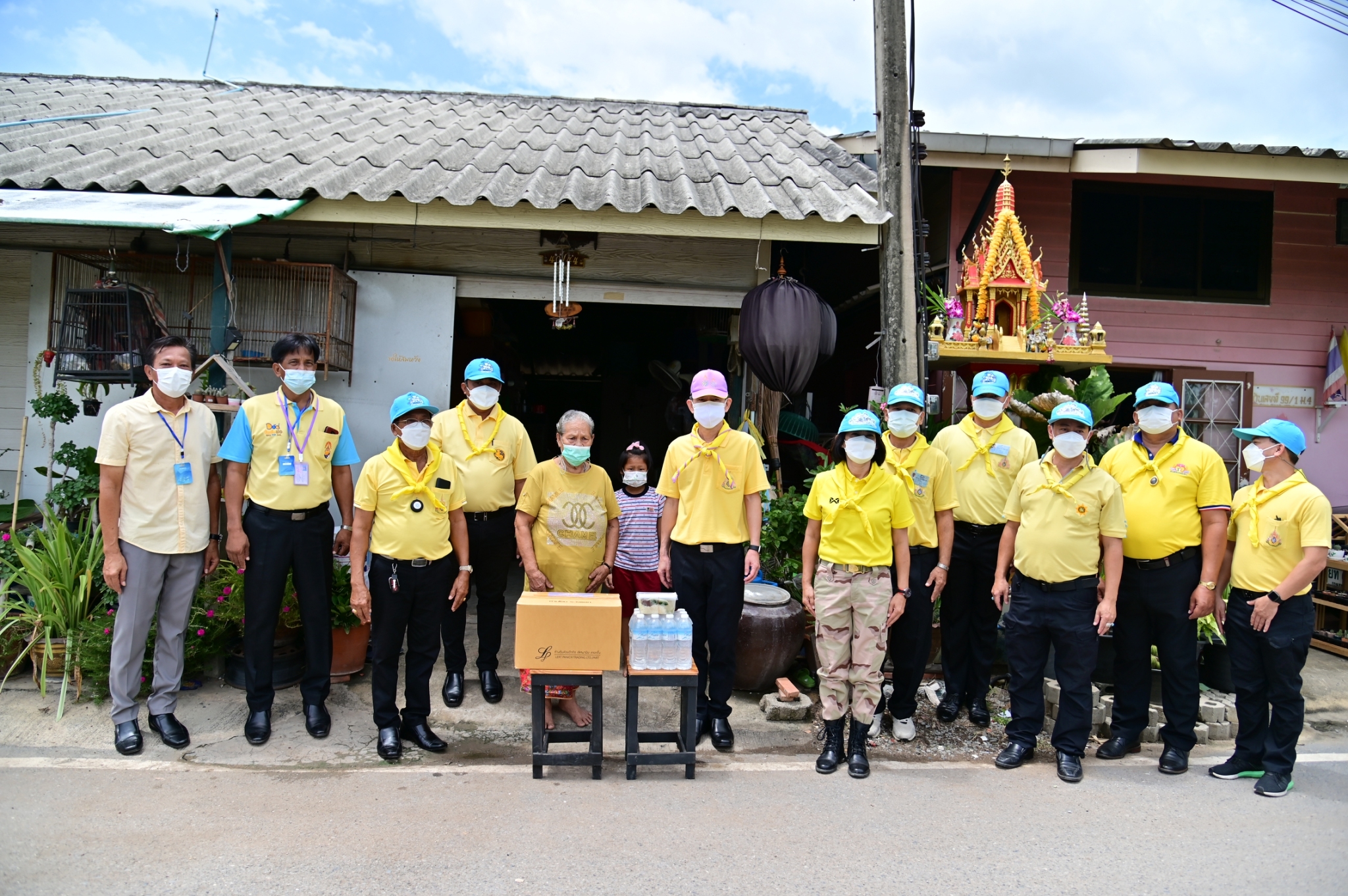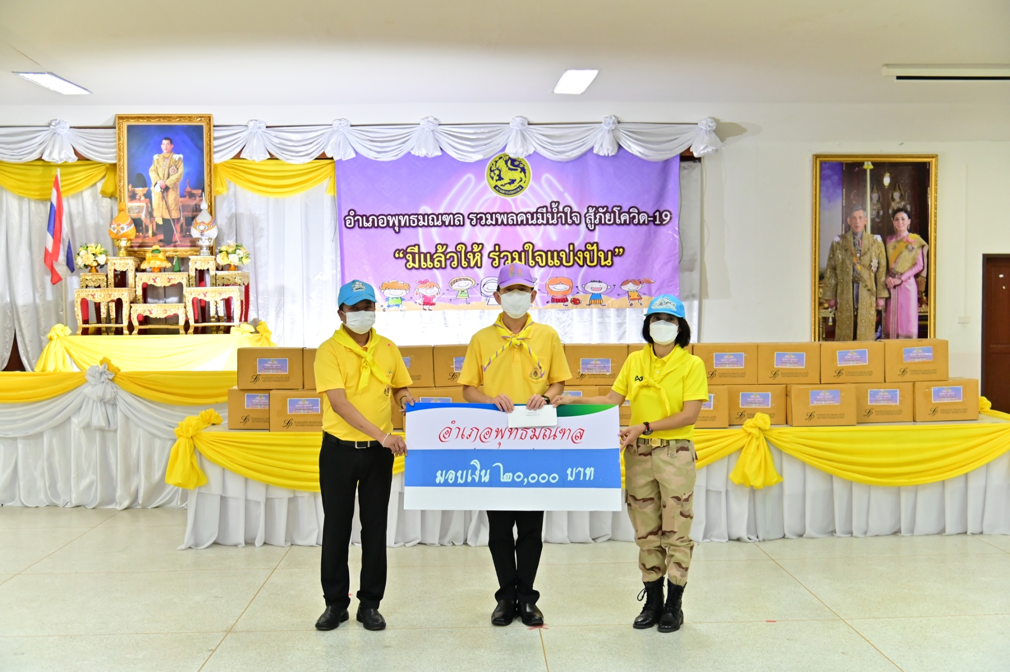 โอกาสนี้ ผู้ว่าราชการจังหวัดนครปฐม ได้มอบสิ่งของและเครื่องอุปโภคบริโภค ให้กับนายกเทศมนตรี นายกองค์การบริหารส่วนตำบล กำนัน และผู้ใหญ่บ้าน ในพื้นที่ตำบลศาลายา ตำบลคลองโยง และตำบลมหาสวัสดิ์ เพื่อนำไปมอบให้กับประชาชนในพื้นที่เป้าหมาย จำนวน 569 ราย จากนั้น นายอำเภอพุทธมณฑล ได้มอบเงินบริจาคสมทบ จำนวน 20,000 บาท เพื่อใช้ในกิจกรรมของเหล่ากาชาดจังหวัดนครปฐม หลังจากนั้น ผู้ว่าราชการจังหวัดนครปฐม ได้ลงพื้นที่มอบสิ่งของ เครื่องอุปโภคบริโภค และข้าวกล่อง ให้กับประชาชนผู้สูงอายุในพื้นที่ตำบลคลองโยง อีกด้วย