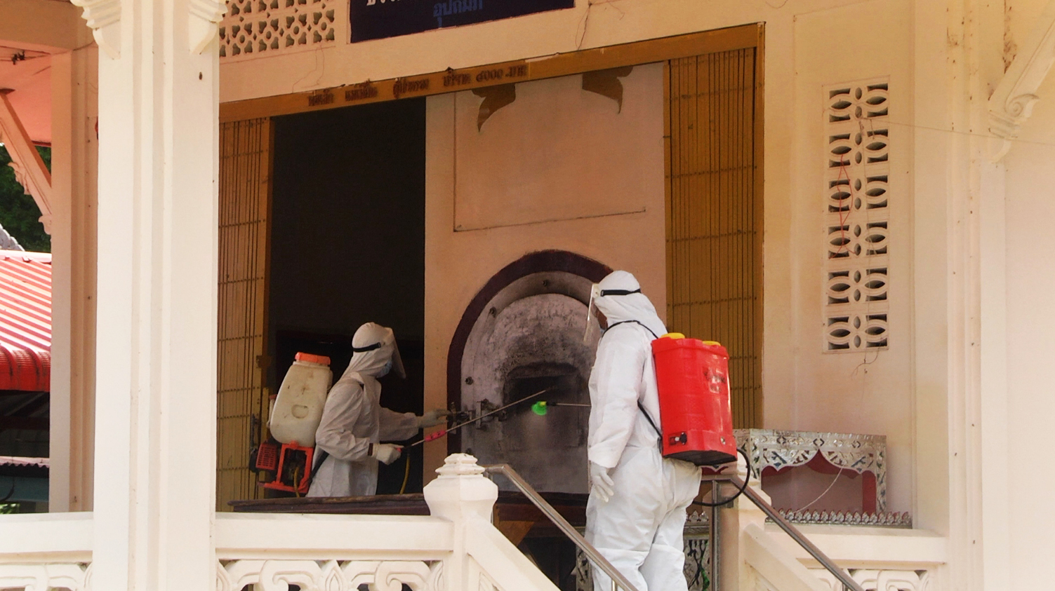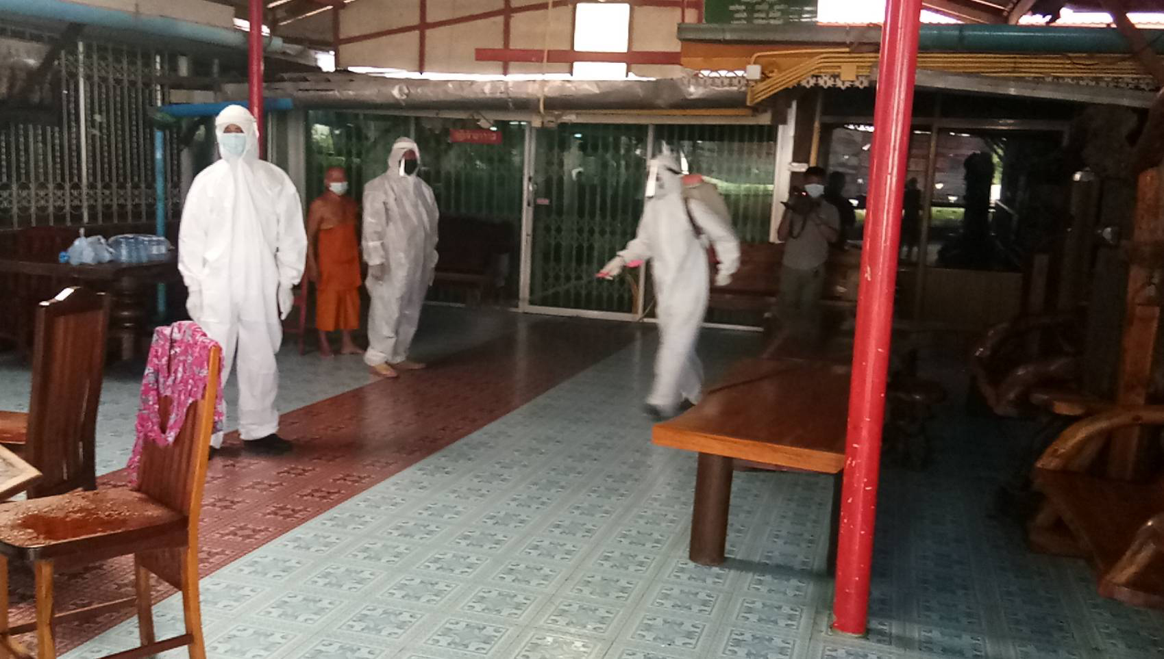 สุพรรณบุรี กู้ภัยฉีดพ่นยาฆ่าเชื้อให้วัดที่มีพระติดโควิดปิดวัด14วัน