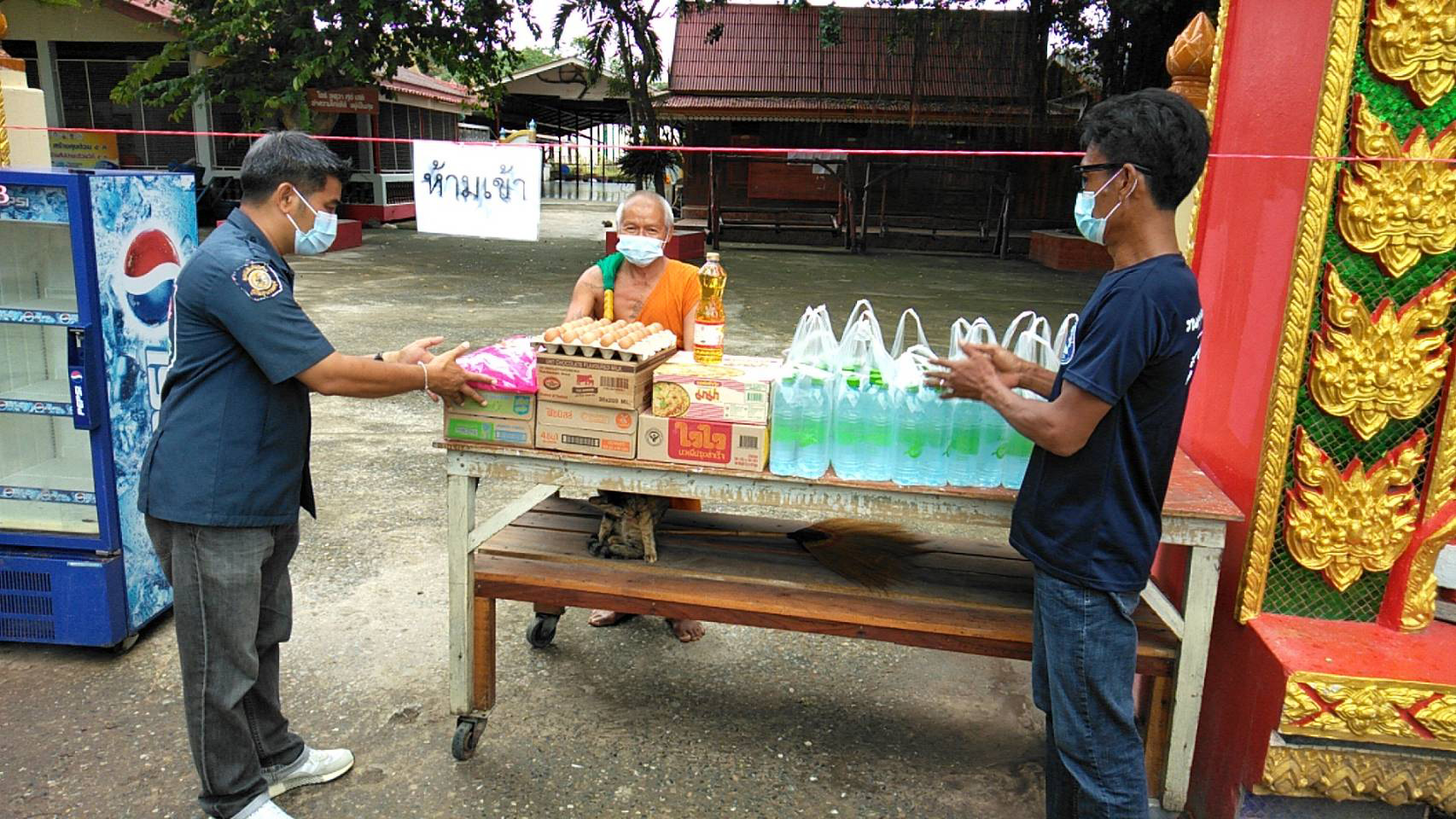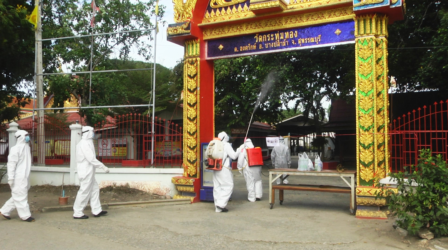 ที่ จ.สุพรรณบุรีนายวิญญู สัตบุตร หัวหน้าศูนย์กู้ภัยมูลนิธิเสมอกันกู้ภัยสุพรรณบุรีได้นำทีมงานชุดปฏิบัติการฉุกเฉินพิเศษตอบโต้โควิด-19 เข้าดำเนินการฉีดพ่นยาฆ่าเชื้อที่วัดกระทุ่มทอง ตำบลองครักษ์ อ.บางปลาม้า จังหวัดสุพรรณบุรี สืบเนื่องมาจากเมื่อ 3 วันที่ผ่านมาได้รับแจ้งจากอาสาสมัครกู้ภัยในพื้นที่ ว่า มีพระในวัดกระทุ่มทอง อาพาธด้วยโรคติดเชื้อไวรัสโคโรน่า2019 หรือโควิด-19 จำนวน 2 รูป หนึ่งในนั้นคือเจ้าอาวาส ซึ่งตอนนี้ไปรักษาตัวที่รพ.สนาม ม.เกษตรฯ อ.บางปลาม้า ทำให้ต้องปิดวัด ห้ามคนเข้าออก งดรับกิจนิมนต์ งดบิณฑบาตร รวมถึงยังมีพระลูกวัดที่อาพาธด้วยโรคติดเชื้อโควิด-19 แยกรักษาตัวในกฏิ เนื่องจากเป็นผู้ป่วยกลุ่มสีเขียว ซึ่งได้รับการดูแลจาก รพ.สต. และ อสม.อยู่ พร้อมกันนี้อดีตผู้ใหญ่บ้าน อสม.และพระลูกวัด ได้ร้องขอให้ทีมงานของมูลนิธิเสมอกันมาช่วยฉีดพ่นยาฆ่าเชื้อ เพื่อลดความเสี่ยงในการติดเชื้อ และเพื่อความสบายใจของประชาชนในหมู่บ้าน ทำให้พระที่จำวัดอยู่มีความยากลำบากในเรื่องอาหารการกิน ทั้งนี้นายวิญญู ได้นำข้าวสาร อาหารแห้ง ไข่สด และน้ำดื่มจำนวนหนึ่ง ไปถวายให้พระลูกวัดที่จำวัดอยู่ เพื่อนำไปประกอบอาหารฉันบรรเทาความเดือดร้อนไปก่อน
