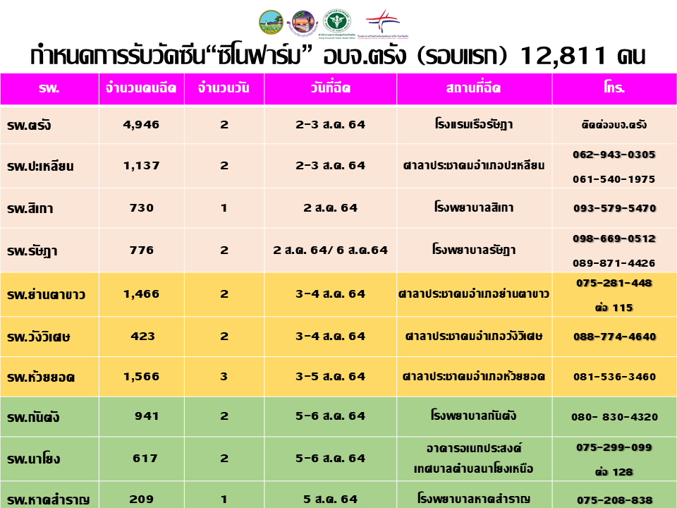 อบจ.ตรัง เปิดช่องทางสะดวกให้ประชาชนที่ได้สิทธิ์รับวัคซีนซิโนฟาร์มกับอบจ.ตรัง รอบแรก จำนวน 12,811 คน ตรวจสอบรายชื่อ วัน เวลา สถานที่นัดฉีดวัคซีน