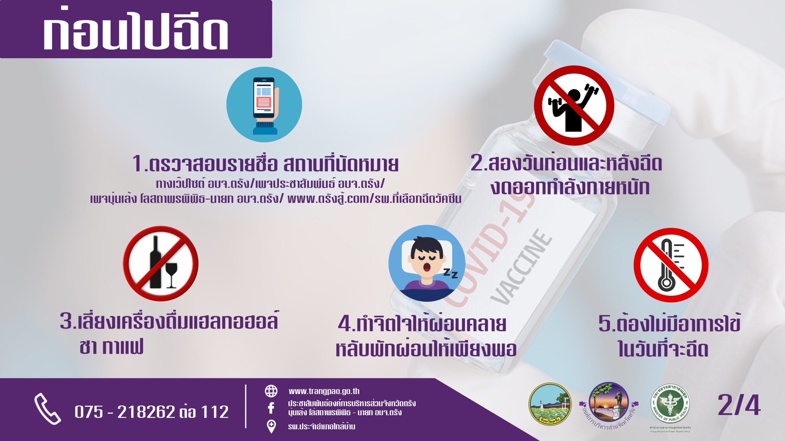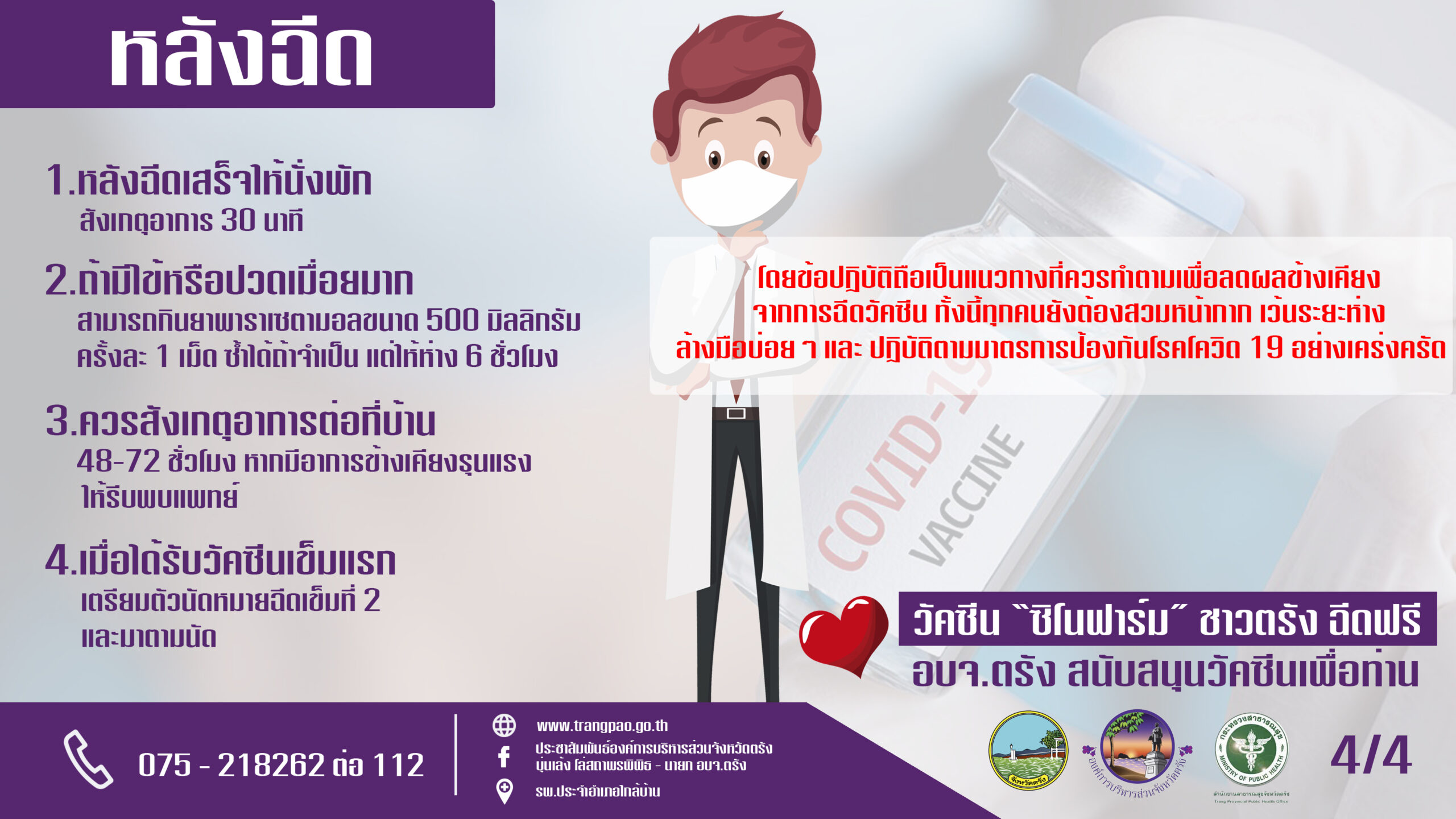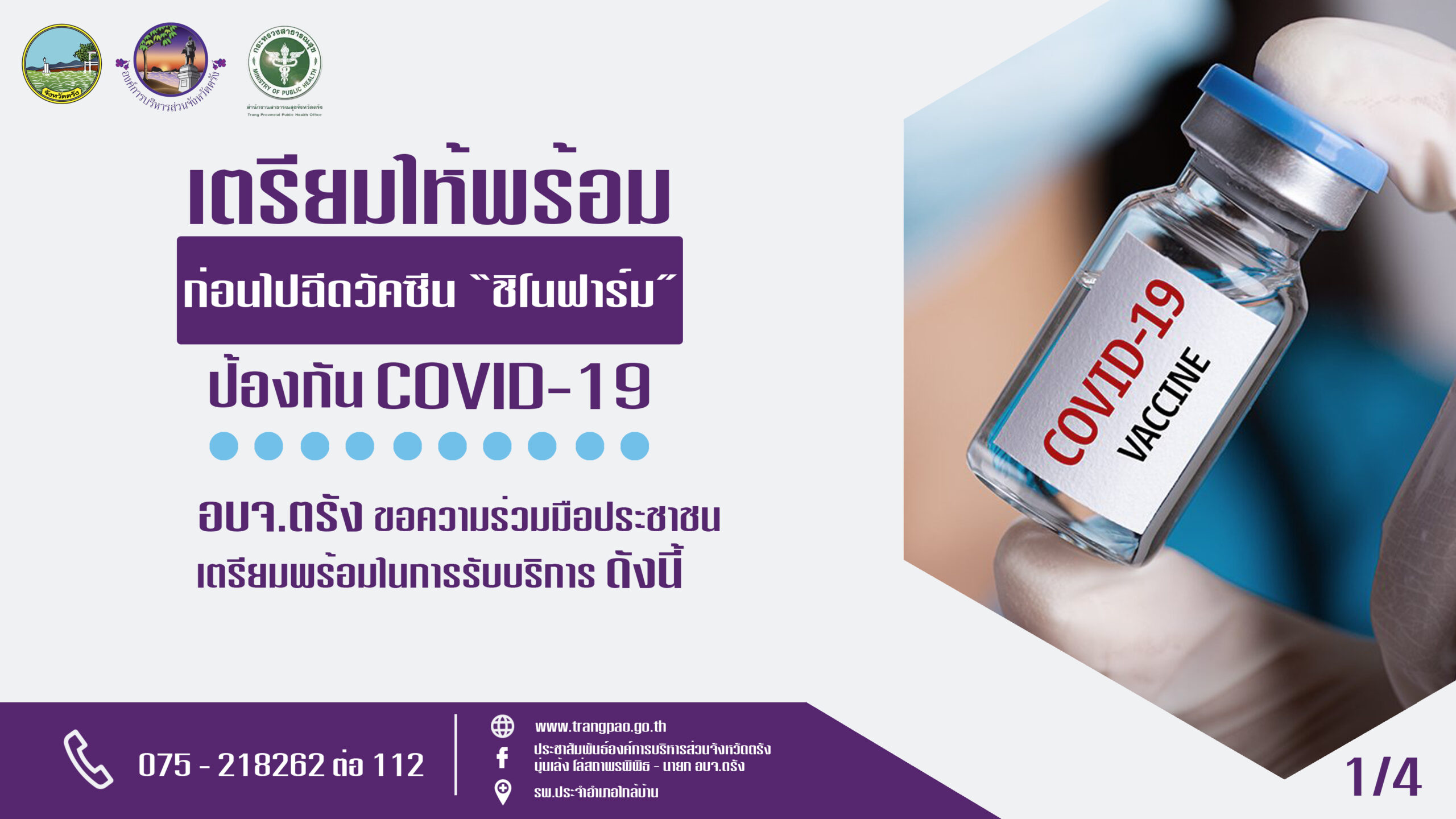 อบจ.ตรัง จัดทำคู่มือ ‘ก่อนฉีด-วันที่ฉีด-หลังฉีด’ วัคซีนซิโนฟาร์มและเตรียมความพร้อมรับการจัดสรรวัคซีนรอบที่ 2 จาก ราชวิทยาลัยจุฬาภรณ์