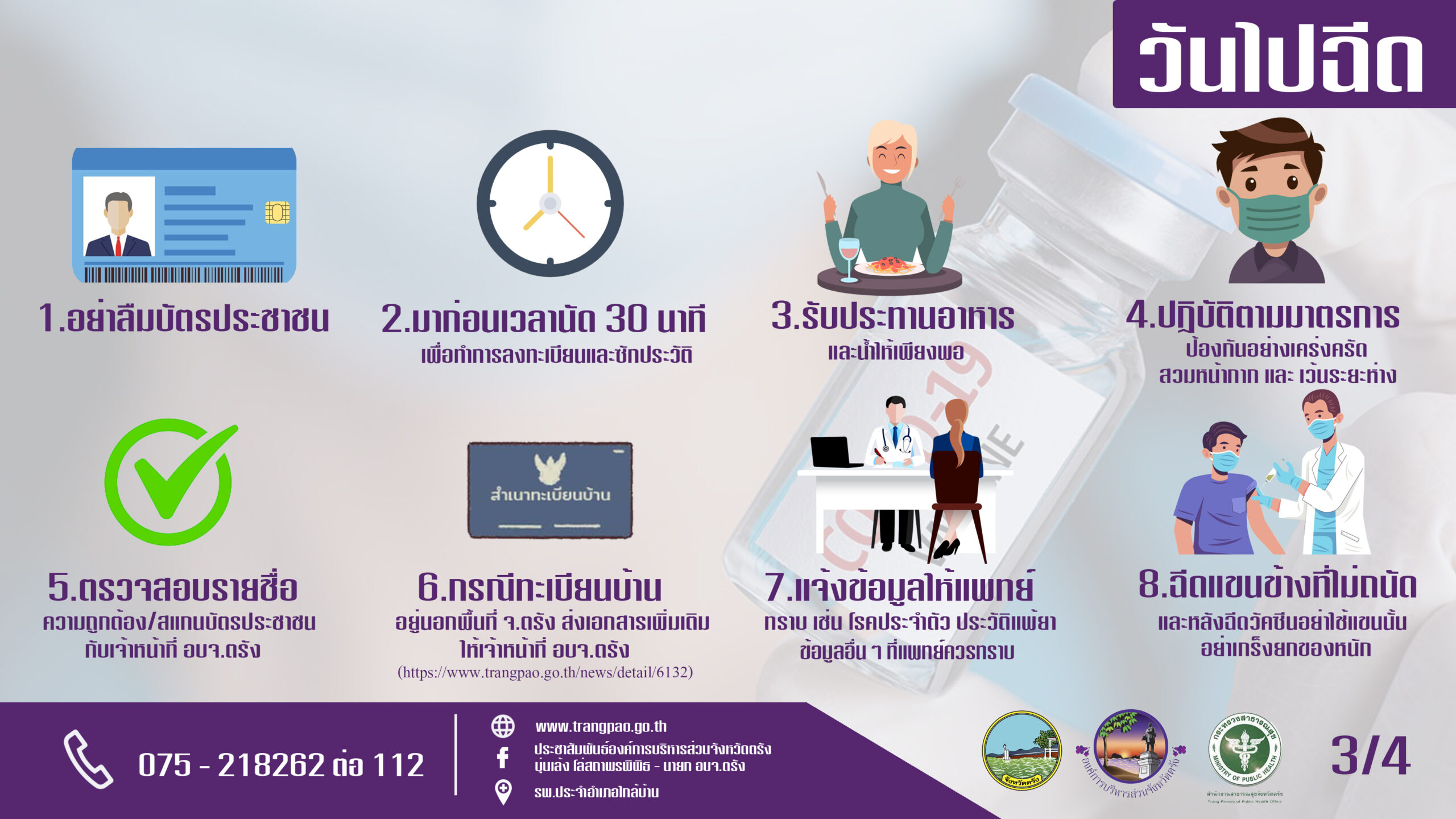 https://www.trangpao.go.th/news/detail/6132) แนบสำเนาบัตรประชาชนหรือ passport ของผู้ฉีดวัคซีน พร้อมเซนต์สำเนาถูกต้อง และสำเนาบัตรประชาชนของผู้รับรองพร้อมเซนต์สำเนาถูกต้อง ในวันฉีดวัคซีนให้มาก่อนเวลานัดฉีด 30 นาที เพื่อดำเนินการลงทะเบียนและซักประวัติให้เรียบร้อย ทั้งนี้ประชาชนที่เดินทางไปฉีดวัคซีนในวันที่ 2-3 สิงหาคม 2564 ที่ ร.ร.เรือรัษฎา อำเภอเมืองตรัง ขอแจ้งว่าทีมฉีดวัคซีนเคลื่อนที่จากโรงพยาบาลโรคผิวหนังเขตร้อนภาคใต้ จังหวัดตรัง จะสามารถดำเนินการฉีดวัคซีนได้เร็วขึ้นจากชั่วโมงละ 300 คน เป็นชั่วโมงละ 600 คน และจะสามารถดำเนินการเสร็จสิ้นไม่เกินเวลา 13.00 น. จึงขอให้ประชาชนขยับเวลาเดินทางเพื่อมาฉีดวัคซีนให้เร็วขึ้น เมื่อมาถึงโรงแรมเรือรัษฎาให้จอดรถที่ลานจอดรถแล้วเดินไปที่ชั้นใต้ดิน เพื่อตรวจวัดอุณหภูมิก่อนที่จะขึ้นไปชั้น 2 เพื่อดำเนินการตามขั้นตอนอื่นๆ ซึ่งการจัดสถานที่ของโรงแรมจะเป็นลักษณะของ one way คือเข้า-ออกทางเดียวเท่านั้น สำหรับผู้ที่มีรายชื่อฉีดวัคซีนซิโนฟาร์มกับ อบจ.ตรัง ทั้ง 10 อำเภอ แต่มีความจำเป็นต้องกักตัวเองที่ LQ หรือที่บ้าน ให้โทรศัพท์แจ้งโรงพยาบาลที่มีนัดฉีดทราบ เพื่อรอนัดวันฉีดต่อไป