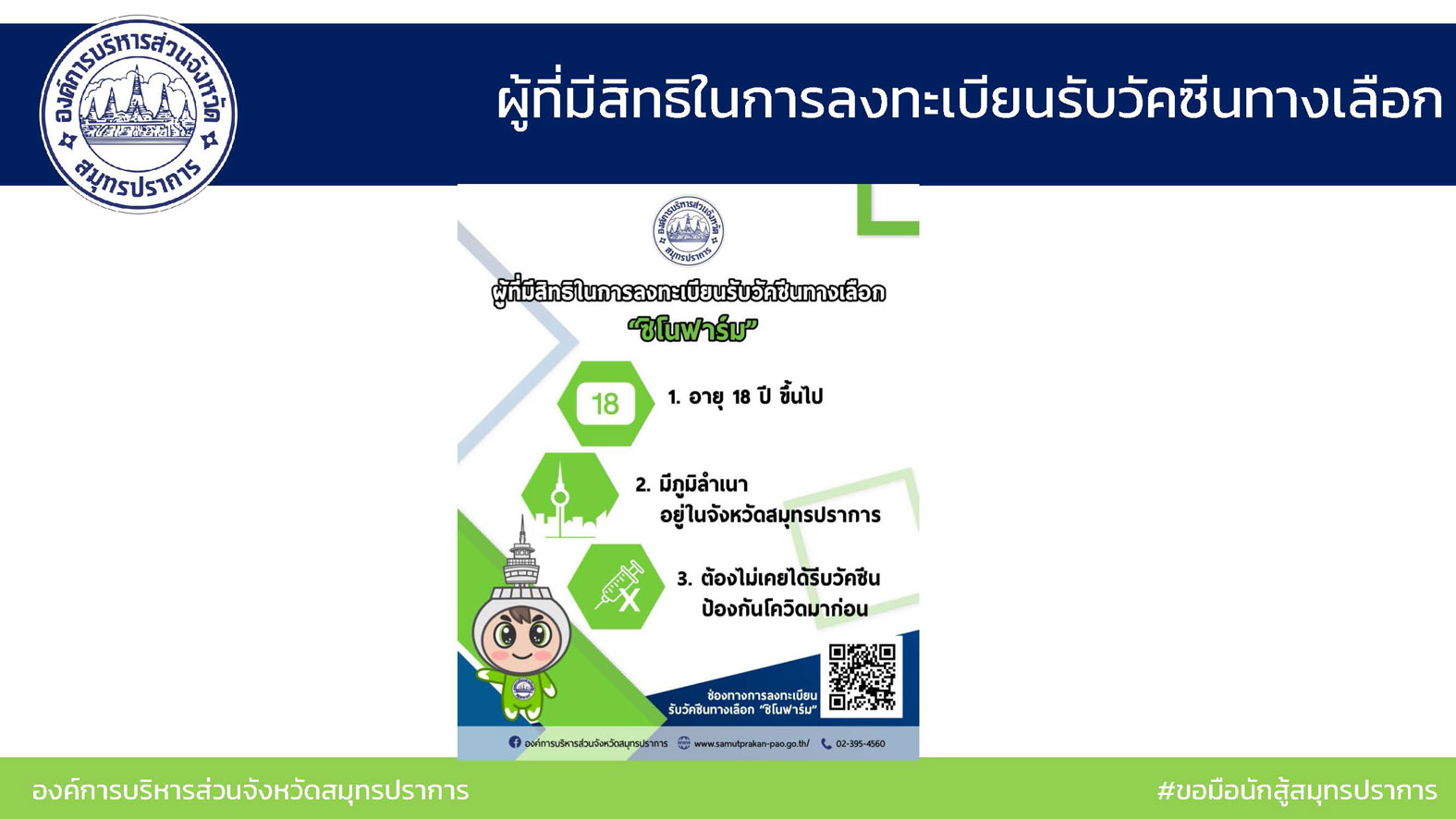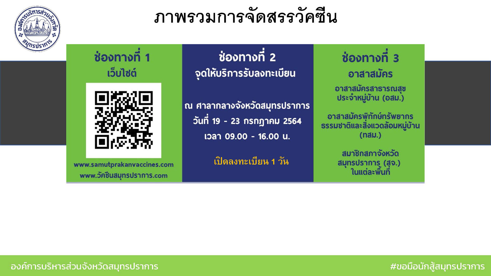 *****สำหรับผู้ที่ลงทะเบียนไว้เรียบร้อยแล้ว และไม่ได้รับการฉีดวัคซีนใแรกนี้รอบขอให้ท่านรอการยืนยันจาก องค์การบริหารส่วนจ้งหวัดสมุทรปราการในรอบถัดไป ซึ่งในขณะนี้ราชวิทยาลัยจุฬาภรณ์ได้ประกาศ จัดสรรวัคซีนชิโนฟาร์ม ให้กับองค์การบริหารส่วนจังหวัดสมุทรปราการเป็นรอบที่สองแล้วจำนวน 133,000 คน ทั้งนี้องค์การบริหารส่วนจังหวัดสมุทรปราการจะได้เร่งดำเนินการในส่วนที่เกี่ยวข้องให้ เพื่อนำมาให้บริการแก่พี่น้องน้องประชาชนโดยเร็วที่สุด