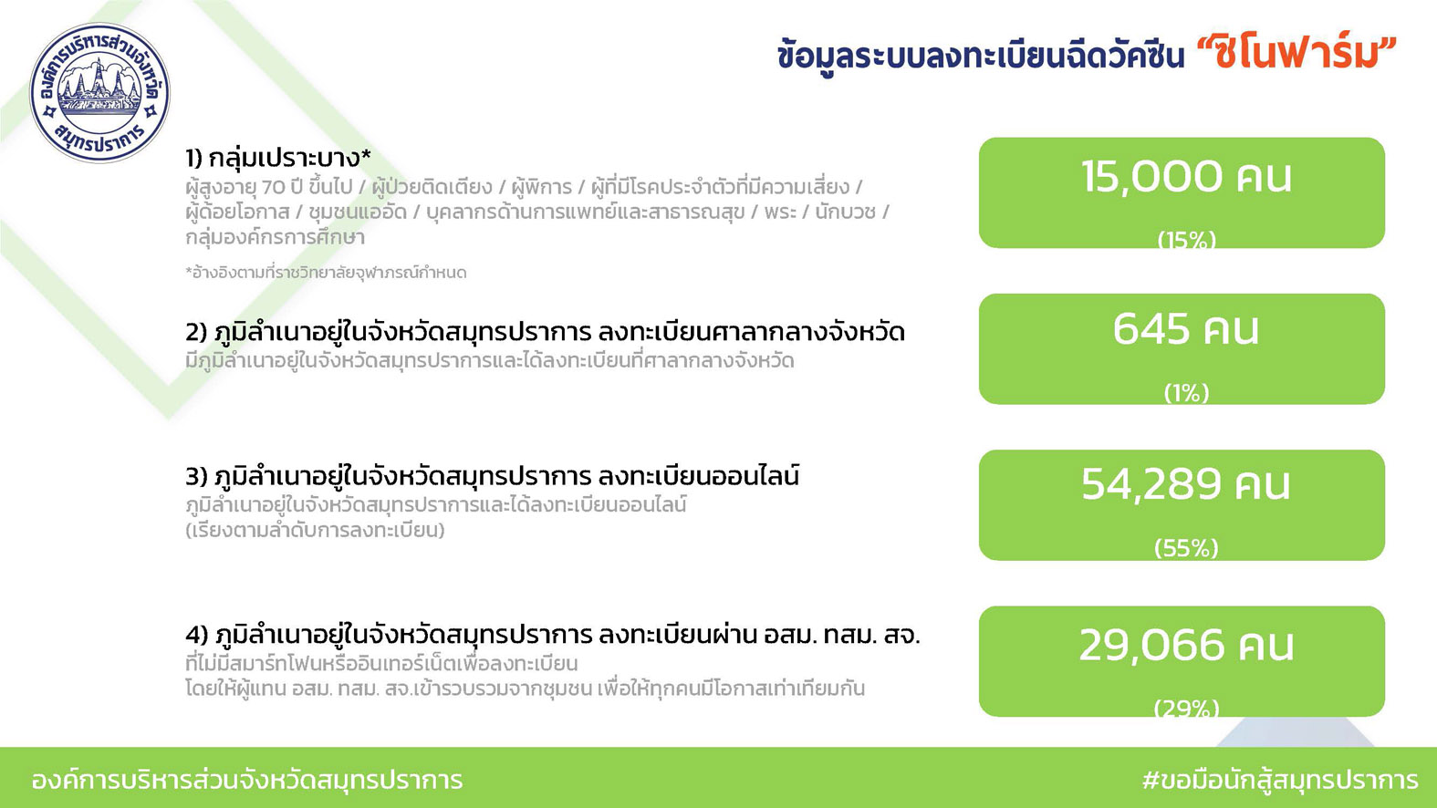 กลุ่มที่กลุ่3มีภูมิลำเนาในจังหวัดสมุทรปราการผู้ และลงทะเบียนออนไลน์เป็ํนกลุ่มที่มีจำนวน มากที่สุด อตนี้ในล็ ทางอบจ สมุทรปราการ จึงจัดสรรให้มากที่สุดถึง 55% เป็นจำนวนประมาณ54,289คน