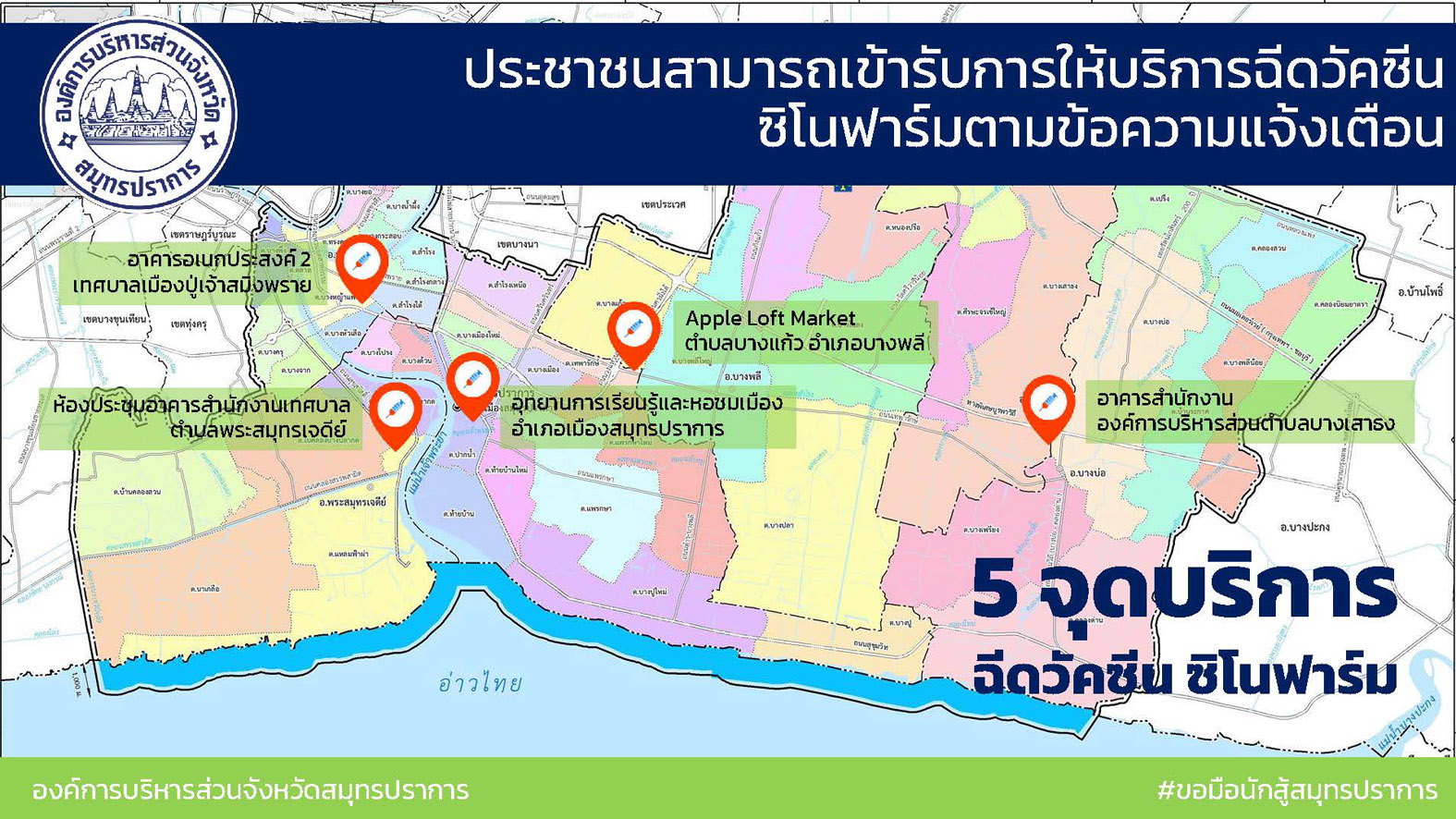 ขณะนี้องค์การบริหารส่วนจังหวัดสมุทรปราการได้ดำเนินการจัดซื้อวัคซีน จัดจ้างสถานพยาบาลที่ให้บริการฉีด วัคซีนชิโนฟาร์ม และกำหนดสถานที่รับบริการฉีดวัคซีน เป็นที่เรียบโดยได้เลือกโรงพยาบาลจุฬารัตน์แล้ว3อินเตอร์ เป็นผู้ให้บริการฉีดวัคซีนชิโนฟาร์ม ในสถานที่รับบริการฉีดวัคซีน5เพื่อให้สะดวกในจำนวน การเดินทางและครอบคลุมทั้งจังหวัดได้แก่