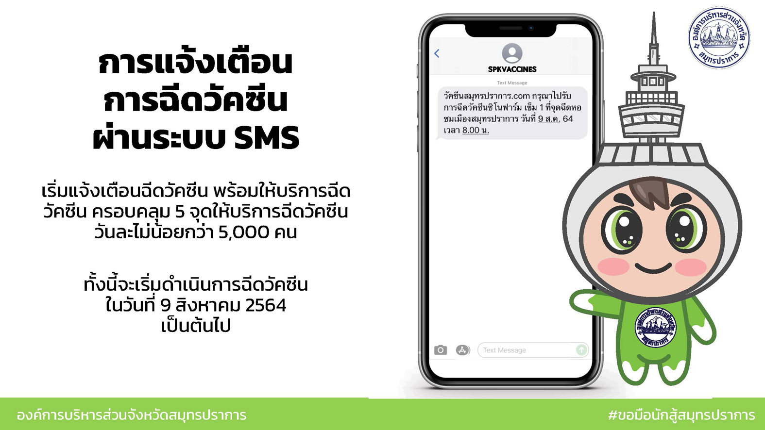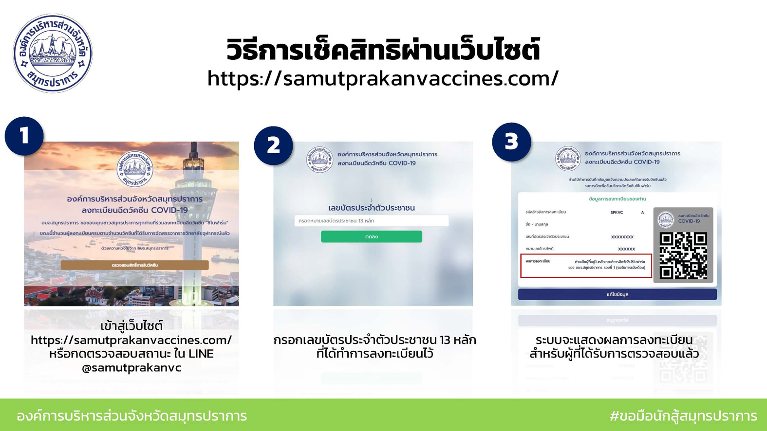 โดยตั้งแต่ในวันนี้เป็นต้นไป ผู้ที่ได้รับการฉีดวัคซีนจะได้รับการยืนยันจากองค์การบริหารส่วนจังหวัด สมุทรปราการตามช่องทางที่ได้เลือกไว้1. ทางข้อความ/sms แจ้งรายละเอียดการฉีดตามเบอร์โทรศัพท์ที่ท่านให้ไว้2. ทางโทรศัพท์แจ้งรายละเอียดในการฉีด นอกจากนี้ยังสมารถตรวจสอบสิทธิ์ผ่านทางเว็บไซต์www.samutprakanvaccines.com อบจ.สมุทรปราการขอความร่วมมือให้ผู้ที่ได้รับนัดหมายฉีดวัคซีน จะต้อง มาตรงตามเวลา