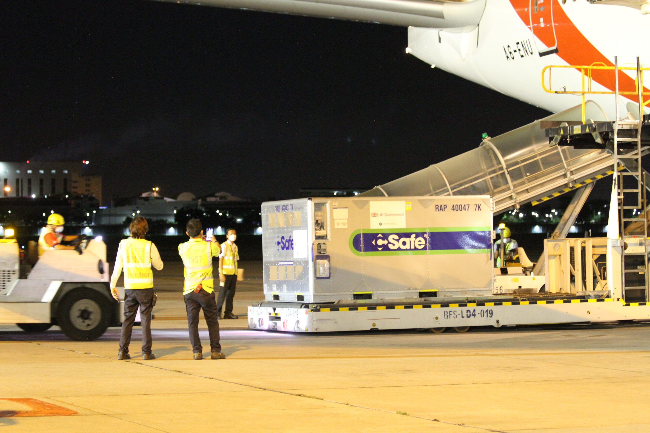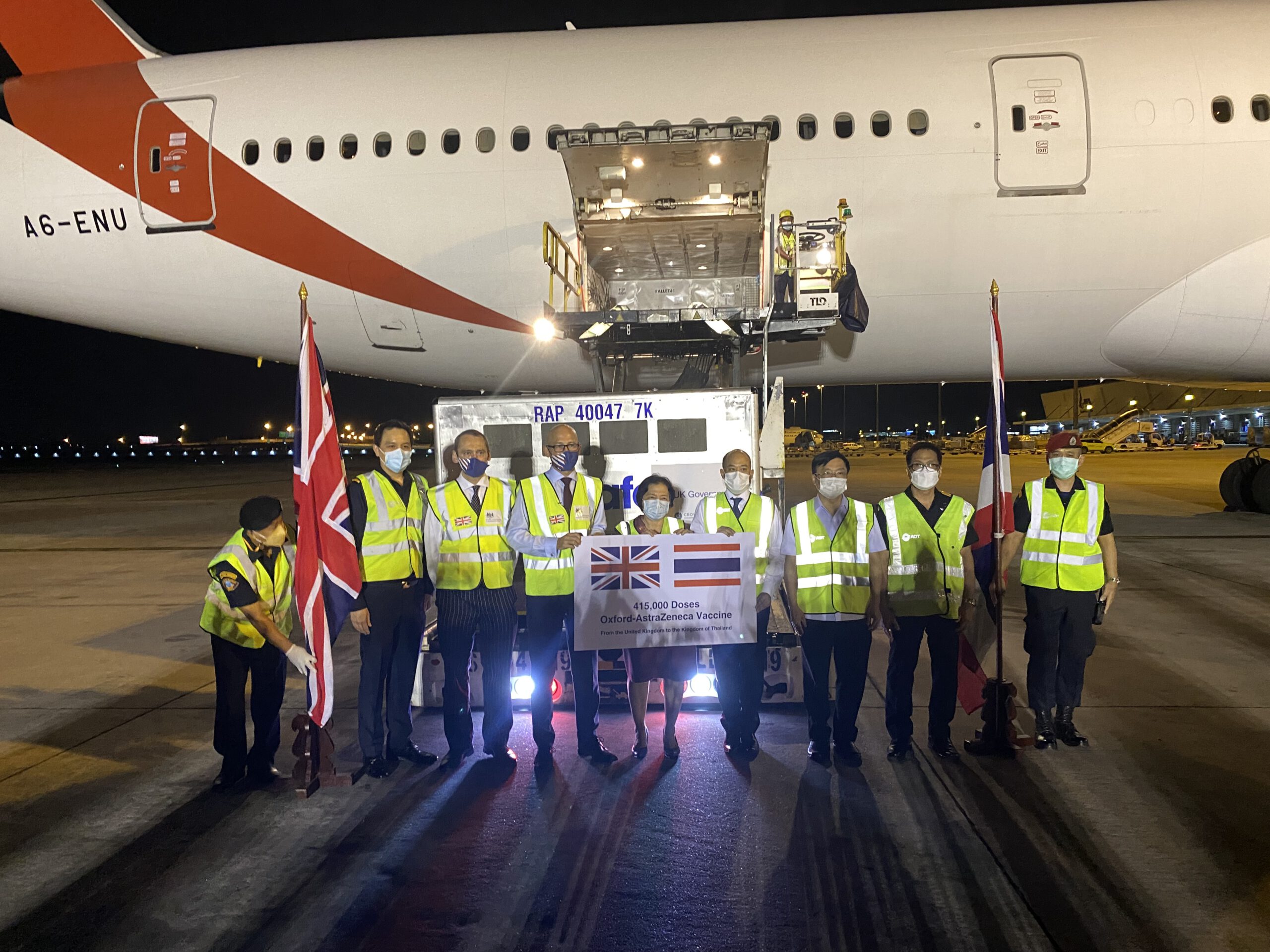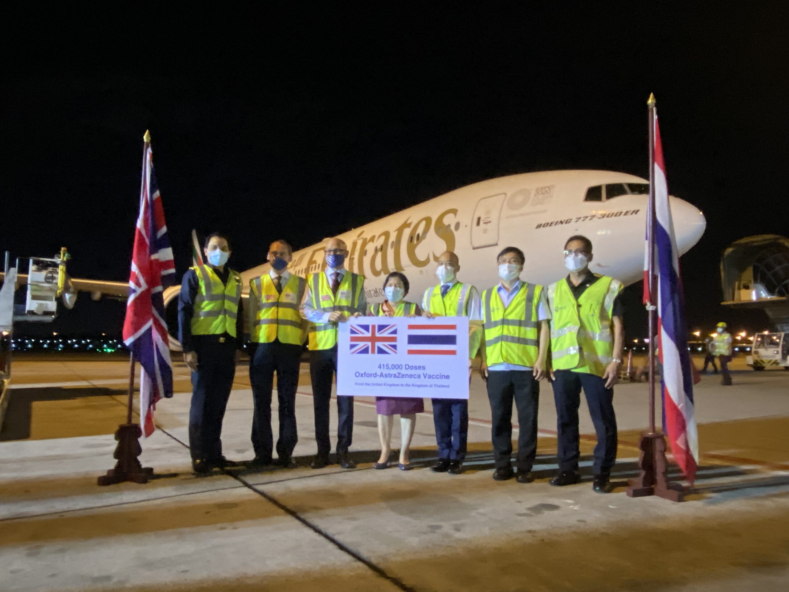 *****เมื่อเวลา 21.30น.วันที่ 3 ส.ค.2564 ที่หลุมจอด 518 คลังสินค้า ท่าอากาศยานสุวรรณภูมิ Mr.Mark Gooding เอกอัครราชทูตอังกฤษประจำประเทศไทย นายแพทย์โสภณ เอี่ยมศิริถาวร รองอธิบดีกรมควบคุมโรค นางจุฬามณี ชาติสุวรรณ อธิบดีกรมยุโรป กระทรวงการต่างประเทศ นายกิตติพงศ์ กิตติขจร รองผู้อำนวยการท่าอากาศยานสุวรรณภูมิ (สายปฏิบัติการ 1) บริษัท ท่าอากาศยานไทย จำกัด มหาชน (ทอท.) ร่วมกันทำพิธีรับวัคซีนแอสตร้าเซนเนกา จำนวน 415,040 โดส ที่เดินทางมาถึงประเทศไทยด้วยสายการบิน เอมิเรตส์แอร์ เทียวบินที่ EK 372 เครื่องลงเวลา 20.55 น. สนามบินสุวรรณภูมิ