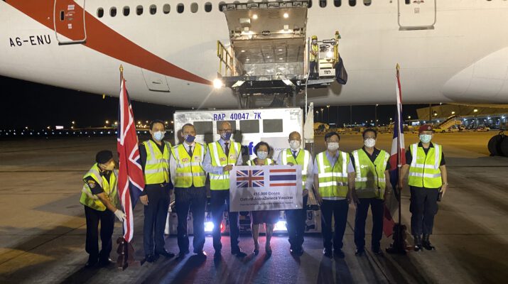 *****ด้วยรัฐบาล สหราชอาณาจักรได้บริจาควัคซีนป้องกันโรคติดต่อเชื้อไวรสโรนา 2019 ซึ่งผลิตโดย บริษัทแอสตร้าเซเนกา ให้แก่รัฐบาลไทยเพื่อประโยชน์ ในการควบคุมสถานการณ์การระบาดของโรคติดเชื้อไวรสโคโรนา 2019 ในประเทศไทย