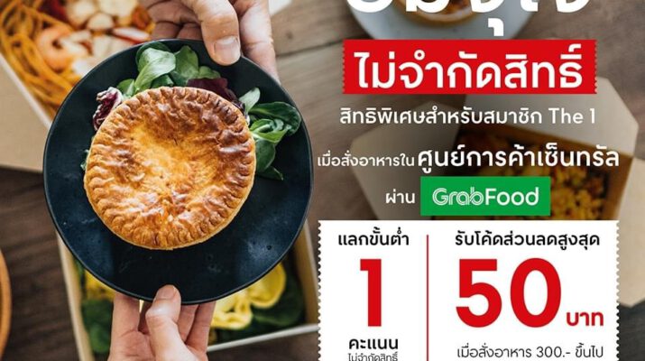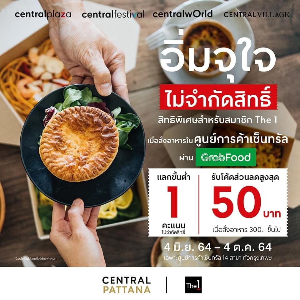 - โปรฯ อิ่มจุใจ ไม่จำกัดสิทธิ์ สิทธิพิเศษสำหรับลูกค้า The เมื่อสั่งอาหารกับเซ็นทรัล ผ่าน GrabFood ใช้คะแนน The 1 เพียง 1 คะแนน แลกรับโค้ดส่วนลดทันที 50 บาท (เมื่อสั่งอาหารครบยอดที่กำหนด) แลกคะแนนรับโค้ดส่วนลด คลิก https://offers.onelink.me/H3Sq/77fd1cdc เริ่มแล้ววันนี้ – 4 ต.ค. 64 เฉพาะร้านอาหารที่ร่วมรายการในศูนย์การค้าเซ็นทรัล 14 สาขา ได้แก่ เซ็นทรัลเวิลด์, เซ็นทรัลเฟสติวัล อีสต์วิลล์, เซ็นทรัลพลาซา บางนา, ลาดพร้าว, แกรนด์ พระราม 9, พระราม 2, พระราม 3, ปิ่นเกล้า, เวสต์เกต, แจ้งวัฒนะ, รัตนาธิเบศร์, รามอินทรา ศาลายา และ เซ็นทรัล วิลเลจ