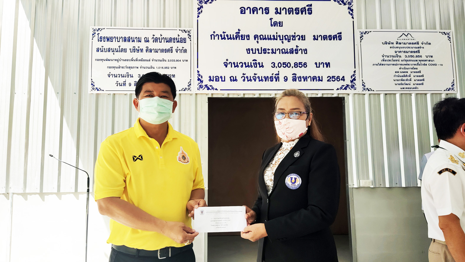 นายณัฐภัทร สุวรรณประทีป ผู้ว่าราชการจังหวัดสุพรรณบุรี กล่าวว่าวันนี้ได้มาตรวจเยี่ยมและเป็นประธานรับมอบอาคารโรงพยาบาลสนามส่วนขยายระดับอำเภอ ขนาด 90 เตียง รู้สึกยินดีและภูมิใจที่เห็นพี่น้องชาวอำเภออู่ทองร่วมมือร่วมใจกันสร้างโรงพยาบาลสนาม ส่วนขยายเพิ่มอีก90เตียง และขอขอบคุณพระปลัดอนวัชอภิลาโส เจ้าอาวาสวัดดงน้อย ครอบครัวมาตรศรี และบริษัทศิลามาตรศรี จำกัด ที่สนับสนุนงบประมาณจัดสร้างอาคารหลังนี้ ให้เป็น จากกองทุนพัฒนาหมู่บ้านรอบพื้นที่เหมืองแร่ จำนวนเงิน 2,033,904 บาท กองทุนเฝ้าระวังสุขภาพ จำนวนเงิน 1,016,952 บาท พร้อมกันนี้ได้รับมอบเตียง จากคณะนักศึกษาหลักสูตร ปศส.19 สถาบันพระปกเกล้า รับมอบวิดิโออินเตอร์คอม จากวิทยาลัยการอาชีพอู่ทอง และนายโกเมศ โตอินทร์ และรับมอบพัดลม 8 เครื่องจากบุญเสิร์ฟ เดลิเวอร์รี่ และน้ำดื่มจากนายพิภพ นางวณิชา บุญธรรม อดีตรองผู้ว่าราชการจังหวัดสุพรรณบุรี
