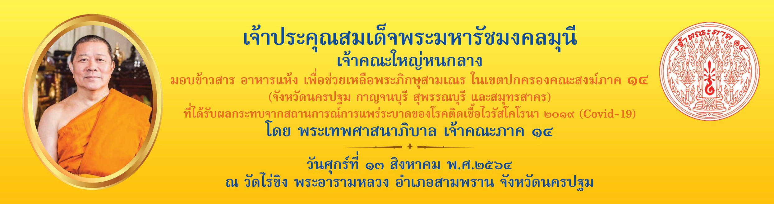 สมเด็จพระมหารัชมงคลมุนี เจ้าคณะใหญ่หนกลาง วัดไตรมิตรวิทยาราม มีดำริในการช่วยเหลือวัด พระภิกษุสามณร พุทธศาสนิกชน และทุกภาคส่วน ในสถานการณ์การแพร่ระบาดของโรคติดเชื้อไวรัสโคโรนา2019 (covid-19)มอบเครื่องอุปโภคบริโภค ข้าวสาร อาหารแห้ง แก่ คณะสงฆ์ภาค 14 ทั้ง4จังหวัด เพื่อช่วยเหลือพระภิกษุสามเณรที่ได้รับผลกระทบจากสถานการณ์การแพร่ระบาดของโรคติดเชื้อไวรัสโคโรนา 2019 (COVID- 19) โดยได้ร่วมกับสถาบันพุทธศาสนา เถรวาทมหายาน-ฝอ-กวง-ซัน ไท่-ฮวา-ซื่อ มูลนิธิพุทธรังษี และสำนักนักงานพระพุทธศาสนาแห่งชาติ จัดถวายเครื่องอุปโภคบริโภคแด่วัด และพระภิกษุในเขตปกครองคณะสงฆ์หนกลาง เพื่อบรรเทาความเดือดร้อนในสถานการณ์การแพร่ระบาดของโรค