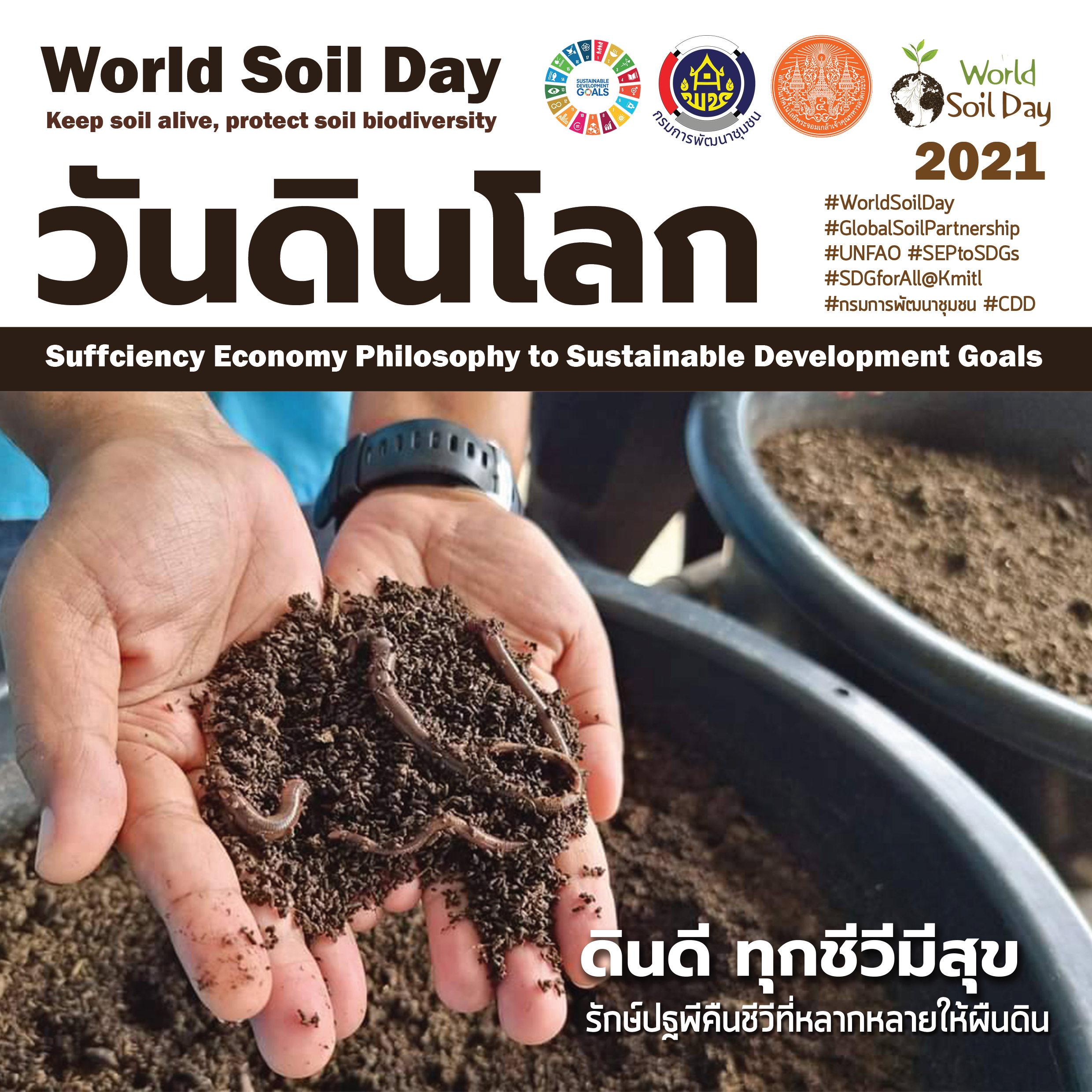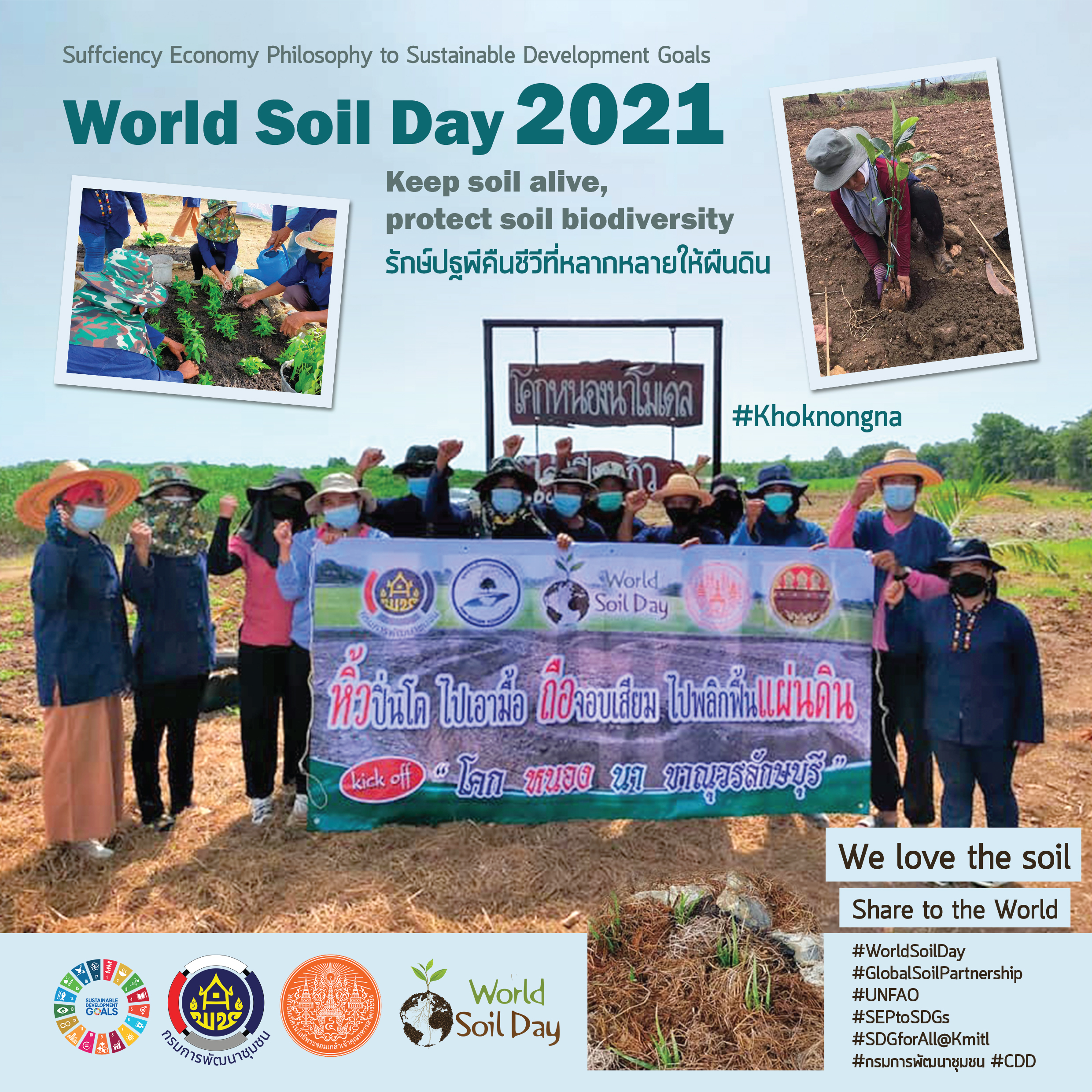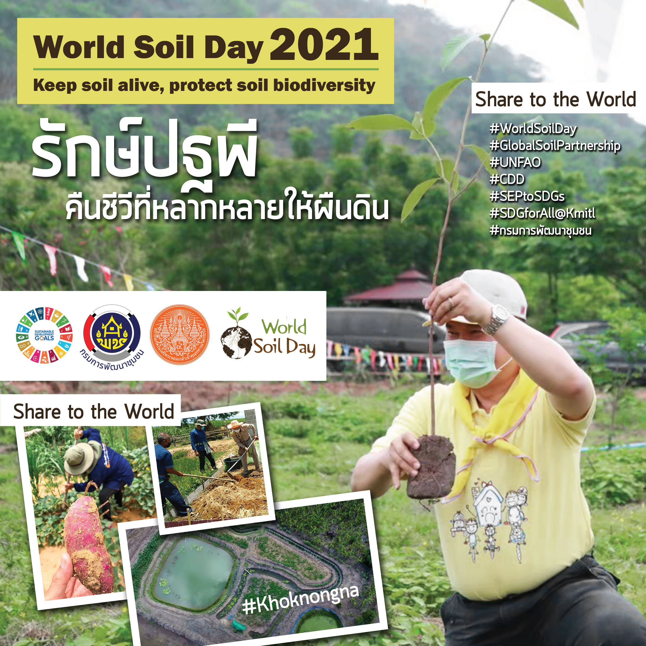 อธิบดีกรมการพัฒนาชุมชน กล่าวต่ออีกว่า กรมการพัฒนาชุมชน กระทรวงมหาดไทย และสถาบันเทคโนโลยีพระจอมเกล้าเจ้าคุณทหารลาดกระบัง (สจล.) ร่วมกับภาคีเครือข่ายทุกภาคส่วน พร้อมที่จะสานต่อเจตนารมณ์ในพระราชปณิธาน พร้อมน้อมนำพระราชดำริ มาเป็นแนวทางในการขับเคลื่อนปรัชญาของเศรษฐกิจพอเพียง และทฤษฎีใหม่ ในการพัฒนาดิน น้ำ ป่า พันธุ์พืช และอาชีพของเกษตรกร ตลอดจนครัวเรือนที่สนใจเข้าร่วมโครงการให้มีความมั่นคง มีคุณภาพชีวิตที่ดี สามารถดำรงชีวิตได้อย่างมั่นคง สร้างความมั่งคั่งให้กับครอบครัวเพื่อความยั่งยืนของชุมชน ซึ่งขณะนี้กรมการพัฒนาชุมชนได้แจ้งให้พัฒนาการจังหวัดและบุคลากรของกรมการพัฒนาชุมชนรวมถึงภาคีเครือข่ายทุกภาคส่วนในพื้นที่แต่ละจังหวัด รวบรวมผลงานและจัดทำสื่อประชาสัมพันธ์ ในงานพัฒนาชุมชนเพื่อสนับสนุนการขับเคลื่อนกิจกรรมที่เกี่ยวข้องกับวันดินโลก โดยประสานความร่วมมือกับเครือข่ายงานพัฒนาชุมชน เช่น องค์กรสตรี อาสาพัฒนาชุมชน ผู้นำอาสาพัฒนาชุมชน ผู้นำชุมชนที่เกี่ยวข้อง และองค์กรอื่น ๆ สนับสนุนการประชาสัมพันธ์ตามแนวทาง ตามโครงการ กิจกรรม ในรูปแบบต่าง ๆ ตามความเหมาะสม นำสื่อประชาสัมพันธ์ที่จัดทำขึ้น เผยแพร่ผ่านช่องทางต่าง ๆ อาทิ สื่อโทรทัศน์ สื่อสิ่งพิมพ์ สื่อสิ่งพิมพ์ออนไลน์ เว็บไซต์ หรือ Social Media ในทุกช่องทาง ทั้ง Facebook Twitter Instagram YouTube LinkedIn ฯลฯ พร้อมติด แฮชแท็ก หรือสัญลักษณ์ # ให้ครบดังนี้ #WorldSoilDay #GlobalSoilPartnership #UNFAO #SEPtoSDGs #กรมการพัฒนาชุมชน #CDD #SDGforAll@Kmitl ทั้งนี้ สามารถติดแฮชแท็กชื่อกิจกรรมของแต่ละโครงการได้อีก เช่น #Khoknongna #ปลูกพืชปลูกผักปลูกรักกับพช. #ผู้นำการเปลี่ยนแปลง #SmartLeader #โคกหนองนา #โคกหนองนาโมเดล #โคกหนองนาพัฒนาชุมชน #หมู่บ้านเศรษฐกิจพอเพียง ตามรายละเอียดตามที่มีหนังสือแจ้งถึงจังหวัด ทั้งนี้ เพื่อรวมพลังสนับสนุนกิจกรรม “วันดินโลก” ซึ่งถือเป็นความภาคภูมิใจของข้าราชการ กรมการพัฒนาชุมชนทั้งส่วนกลางและภูมิภาค ในการสนับสนุนผลงานหรือกิจกรรมการประกวดชิงรางวัล King Bhumibol World Soil Day Award ต่อไป ตลอดจนเป็นความร่วมมือกับหน่วยงานภาคีเครือข่ายต่างๆที่เกี่ยวข้อง ที่จะร่วมกันสื่อสารประชาสัมพันธ์ออกไป เพื่อร่วมสร้างความภาคภูมิใจในการดำเนินงานร่วมกัน ที่เริ่มต้นจากจุดเล็กๆ ด้วยหลักการพัฒนาตามหลักปรัชญาของเศรษฐกิจพอเพียง( Sufficiency Economy Philosophy : SEP) แต่สามารถสร้างประโยชน์สุขให้คนจำนวนมากได้ โดยมีเป้าหมายสอดคล้องกับการพัฒนาอย่างยั่งยืนของโลก ( Sustainable Development Goals : SDGs ) อธิบดีกรมการพัฒนาชุมชนกล่าวย้ำในตอนท้าย