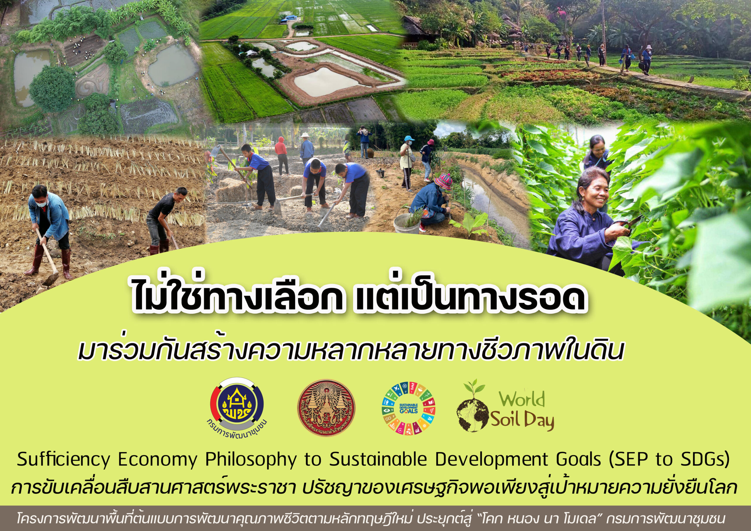 ด้วยวิสัยทัศน์และภารกิจ กรมการพัฒนาชุมชน กระทรวงมหาดไทย และสถาบันเทคโนโลยีพระจอมเกล้าเจ้าคุณทหารลาดกระบัง ร่วมกับภาคีเครือข่ายทุกภาคส่วน ได้ลงนามความความมือและร่วมขับเคลื่อนงานในพื้นที่ต่างๆเพื่อสืบสานศาสตร์พระราชา ปรัชญาของเศรษฐกิจพอเพียงและทฤษฎีใหม่ สู่เป้าหมายความยั่งยืนโลก และมีกิจกรรมด้านการจัดการทรัพยากรดินอย่างยั่งยืนผ่านกิจกรรมหลายโครงการ อาทิ กิจกรรมการพัฒนาทรัพยากรมนุษย์ผ่านการฝึกอบรมเชิงปฏิบัติการในหลักสูตรที่เกี่ยวข้องกับการฟื้นฟูและพัฒนาทรัพยากรดิน น้ำ ป่า อย่างยั่งยืน กิจกรรมการเอามื้อสามัคคีเพื่อร่วมเรียนรู้การฟื้นฟูดินผ่านกระบวนการลงมือทำในพื้นที่จริงด้วยกลไกจิตอาสา กิจกรรมการพัฒนาพื้นที่ต้นแบบการพัฒนาคุณภาพชีวิตตามหลักทฤษฎีใหม่ประยุกต์สู่ “โคก หนอง นา โมเดล” ทั้งแปลงชุมชนต้นแบบ CLM และแปลงครัวเรือนต้นแบบ HLM ทั่วประเทศ กิจกรรมการลงพื้นที่เรียนรู้และทำงานของนักพัฒนาพื้นที่ต้นแบบ( นพต.) ร่วมกับภาคประชาชนในพื้นที่ การพัฒนาศูนย์เรียนรู้การพัฒนาพื้นที่ต้นแบบการพัฒนาคุณภาพชีวิตตามหลักทฤษฎีใหม่ ประยุกต์สู่ โคก หนอง นา พช. ฯลฯ โดยมีวัตถุประสงค์เพื่อส่งเสริมการเรียนรู้การน้อมนำหลักปรัชญาของเศรษฐกิจพอเพียงประยุกต์สู่การปฏิบัติรูปแบบ โคก หนอง นา ด้วยการพัฒนาพื้นที่เรียนรู้ชุมชนต้นแบบ “โคก หนอง นา” ตามหลักปรัชญาของเศรษฐกิจพอเพียงระดับตำบล และระดับครัวเรือน เพื่อฟื้นฟูเศรษฐกิจท้องถิ่นและชุมชนผ่านการสร้างงานสร้างรายได้ให้แก่เกษตรกร แรงงานและบัณฑิตจบใหม่ กลุ่มแรงงานที่อพยพกลับท้องถิ่นและชุมชน ที่ได้รับผลกระทบจากสถานการณ์ในช่วงวิกฤตการแพร่ระบาดของโรคติดเชื้อไวรัสโคโรนา ๒๐๑๙ (COVID – 19) และมีเป้าหมายในการสร้างคุณภาพชีวิตที่ดี สร้างประโยชน์และสร้างความสุขแก่พี่น้องประชาชน ได้อย่างยั่งยืน โดยจะเห็นได้จากกิจกรรมที่กล่าวมาข้างต้นนั้น ล้วนมี ดิน เป็นทรัพยากรธรรมชาติที่สำคัญ ในด้านการขับเคลื่อนโครงการเพื่อพัฒนาคุณภาพชีวิต ร่วมกับการพัฒนากสิกรรมธรรมชาติ ดินเป็นแหล่งผลิตอาหาร ยารักษาโรค สมุนไพร เครื่องนุ่งห่ม และเชื้อเพลิง ดินช่วยพัฒนาระบบนิเวศให้มีความยั่งยืน เอื้อให้เกิดความหลากหลายทางชีวภาพ ช่วยดูดซับคาร์บอน และบรรเทาผลกระทบจากสภาวะการเปลี่ยนแปลงสภาพภูมิอากาศ