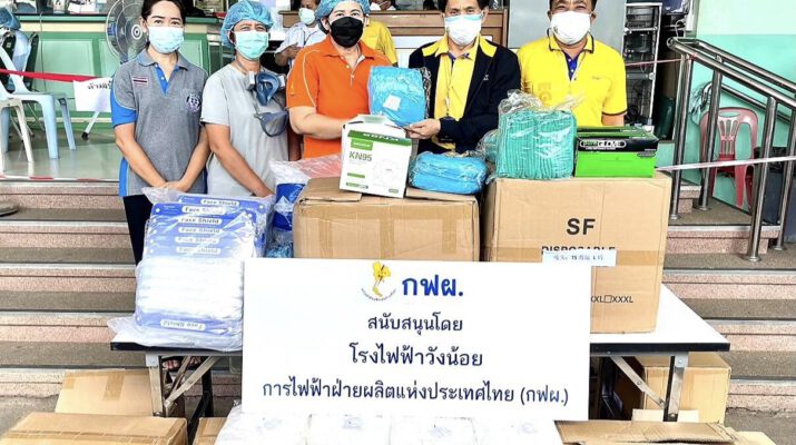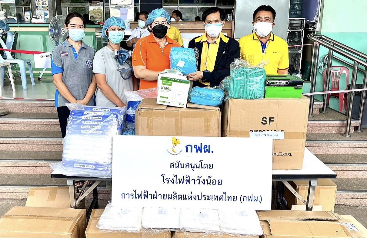 วันที่ 13 สิงหาคม 2564 การไฟฟ้าฝ่ายผลิตแห่งประเทศไทย (กฟผ.) โรงไฟฟ้าวังน้อย นำโดย นายสุรัตน์ วิชชุลดา วิศวกรระดับ11พร้อมผู้ปฏิบัติงานแผนกประชาสัมพันธ์และชุมชนสัมพันธ์ โรงไฟฟ้าวังน้อย ลงพื้นที่มอบอุปกรณ์ทางการแพทย์ ได้แก่ ถุงมือยาง จำนวน 300คู่ หมวกคลุมผม จำนวน 300 ชิ้น เสื้อคลุมสีฟ้ากันน้ำ จำนวน 300 ตัว เสื้อ PPE จำนวน 270ตัว หน้ากาก KN 95 จำนวน 280 ชิ้น และ Face Shield จำนวน 280 ชิ้น ให้แก่ โรงพยาบาลพระนครศรีอยุธยา เพื่อปกป้องบุคลากรทางการแพทย์ และลดความเสี่ยงติดเชื้อโรคโควิด-19 โดยมี นางศศิธร ช่างสุวรรณ์ หัวหน้าหน่วยอุบัติเหตุฉุกเฉิน โรงพยาบาล พระนครศรีอยุธยา เป็นผู้รับมอบ