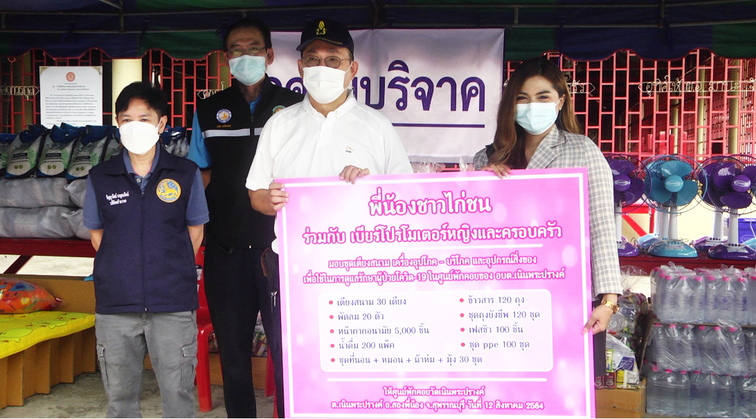 ทางด้าน น.ส. ธันย์ชนก เอี่ยมอิสรา กล่าวว่าตนเป็นโปรโมเตอร์หญิง เป็นอีกหนึ่งตัวแทนพี่น้องชาวไก่ชนทั่วประเทศไทยวันนี้เราได้ระดมทุนจัดซื้อข้าวของเครื่องใช้ต่างๆนับหมื่นชิ้นมามอบให้กับศูนย์พักคอยวัดเนินพระปรางค์ ตำบลเนินพระปรางค์ อำเภอสองพี่น้อง เพื่อให้พี่น้องประชาชนชาวตำบลเนินพระปรางค์ และชาวอำเภอสองพี่น้อง ที่เข้ามากักตัวสังเกตอาการ ซึ่งอยากฝากถึงพี่น้องประชาชนว่าพวกเราชาวไก่ชน ขอทำความดีที่เป็นประโยชน์เพื่อช่วยบรรเทาทุกข์บรรเทาความเดือดร้อนให้กับพี่น้องประชาชนและเพื่อสังคมส่วนรวม ตนก็เคยเป็นผู้ป่วยโควิดมาก่อนปัจจุบันรักษาหายแล้วจากการที่เคยเป็นผู้ป่วยและได้สัมผัสกับผู้ป่วยที่ไม่มีเตียง ต้องคอยเตียงนั้นเดือดร้อนลำบากแค่ไหน บางคนเป็นคนที่หาเช้ากินค่ำไม่สามารถที่จะทำมาหากินได้วันนี้เราได้มาช่วยบรรเทาความเดือดร้อนให้ผู้ป่วยที่ไม่ มีเตียงและทำมาหากินไม่ได้โดยการจัดหาเตียง ถุงยังชีพรวมทั้งของใช้อื่นๆอีกนับหมื่นชิ้นมามอบให้ ขอเป็นกำลังใจให้ผู้ที่ป่วยก็ขอให้หายป่วยโดยเร็ว