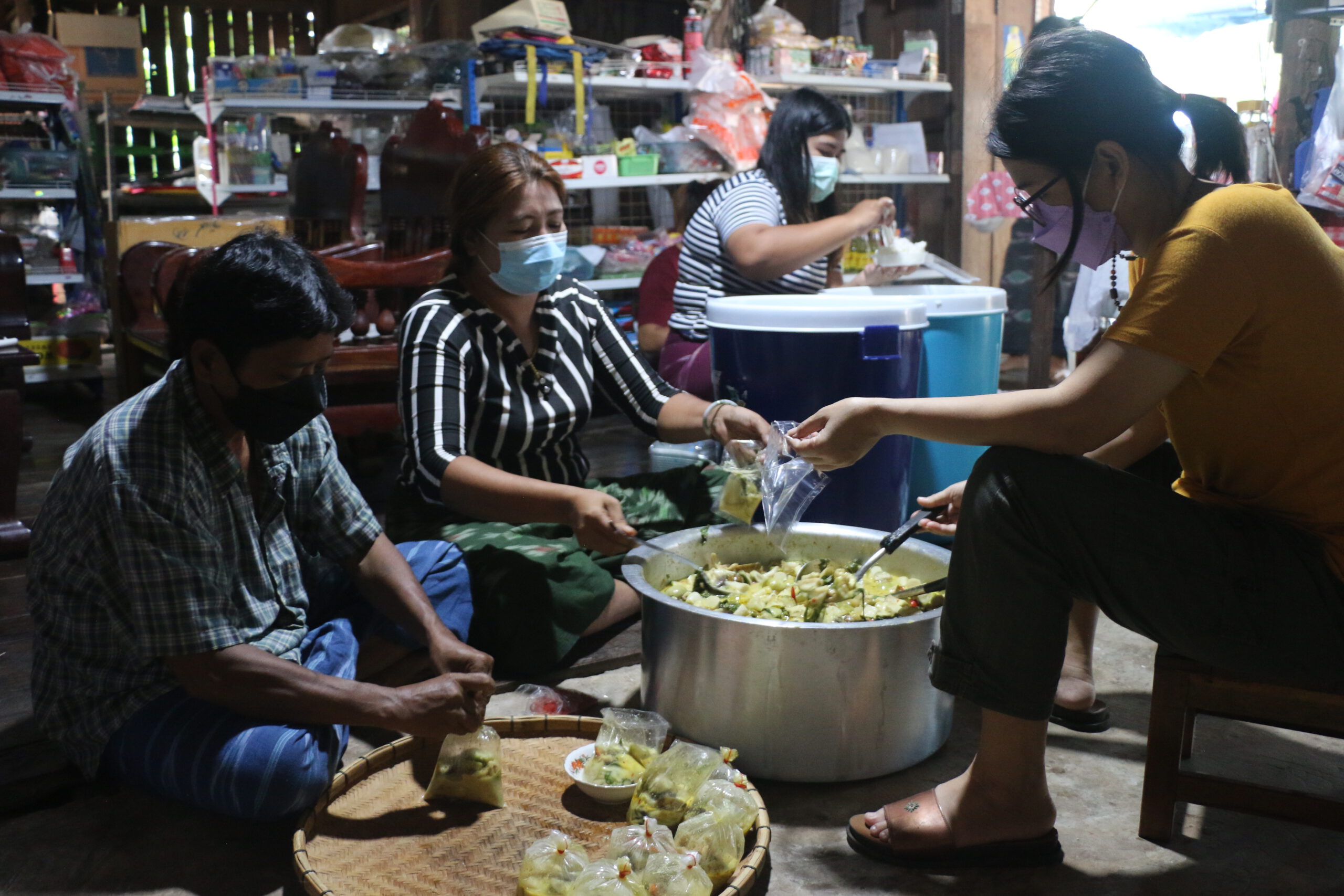 ทุกๆเช้า หลังจากเสร็จสิ้นภารกิจที่บ้านเรียบร้อยแล้ว กลุ่มแม่บ้านชาวมอญบ้านวังกะ หมู่ที่ 2 ตำบลหนองลู อำเภอสังขละบุรี จังหวัดกาญจนบุรี จำนวน12-15 คน จะเดินทางมาที่บ้านหลังหนึ่งของสมาชิก ที่เปิดเป็นครัวอาสาของกลุ่มฯ. เพื่อช่วยกันประกอบอาหารกล่อง วันละ 300-350 กล่อง เพื่อไปแจกให้ชาวบ้านในหมู่บ้านวังกะ ที่ได้รับความเดือดร้อนจากการมาตรการปิดหมู่บ้านวังกะ ของคณะกรรมการโรคติดต่อจังหวัดกาญจนบุรี( 6-19 สิงหาคม) ภายหลังจากที่มีการตรวจพบผู้ติดเชื้อโควิด19 ในหมู่บ้านเพิ่มขึ้นอย่างต่อเนื่องมากกว่า 170 คน