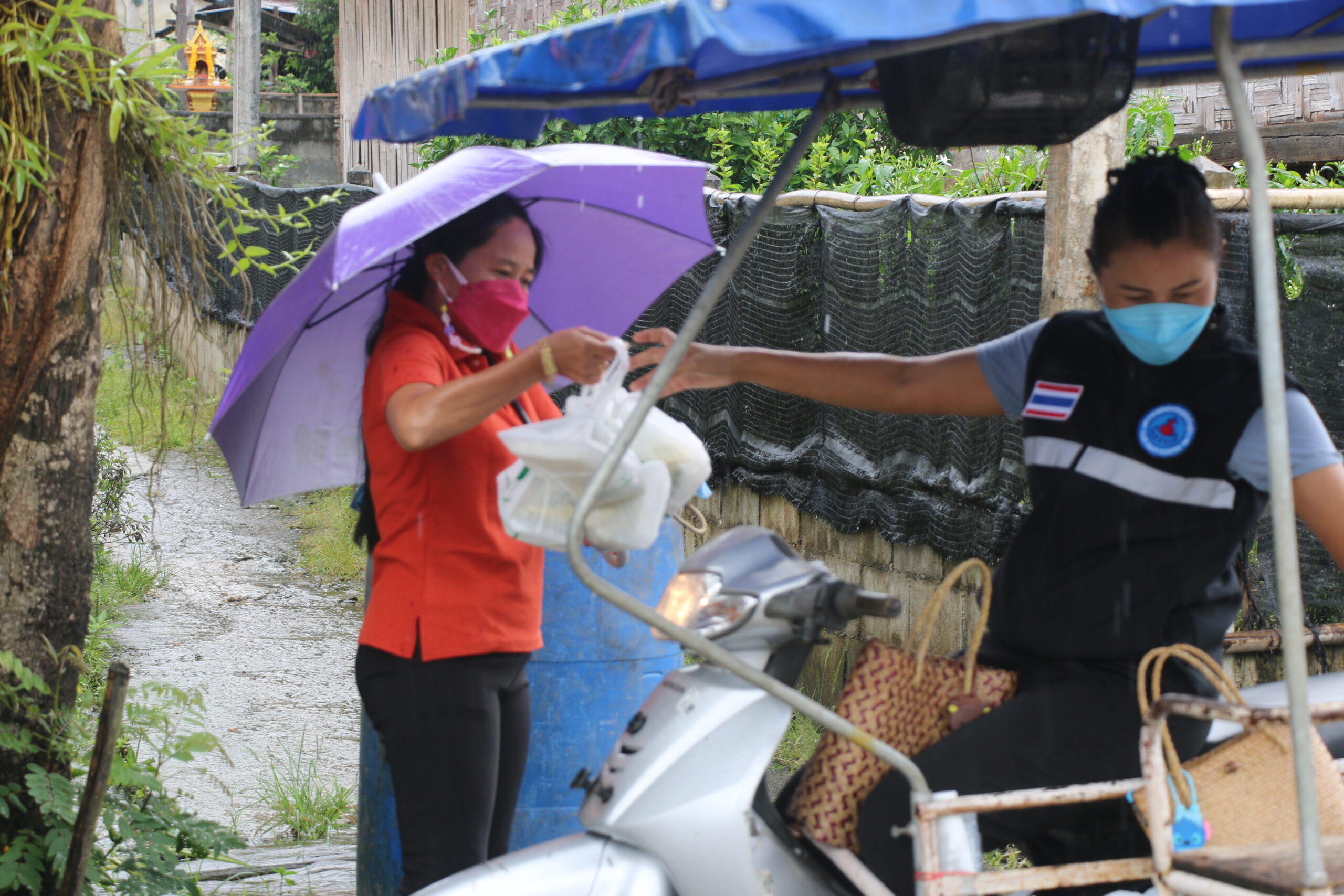 ส่วนวัตถุดิบในการประกอบข้าวกล่องแจก ทั้งข้าวสาร อาหารแห้ง เครื่องปรุง อาหารสด ผัก ได้มาจากการ ช่วยเหลือมาจากกิ่งกาชาดอำเภอสังขละบุรี โดยนายปกรณ์ กรรณวัลลี นายอำเภอสังขละบุรี และ มูลนิธิวันสกาย มอบมาให้ในวันแรก ต่อจากนั้นเมื่อทุกคนเห็นว่าเป็นกิจกรรมที่ดี จึงมีการบอกต่อๆกัน ทำให้มีประชาชนและผู้ประกอบการในพื้นที่ ได้ช่วยกันนำสิ่งของมาบริจาค บางคนก็มอบเงินสดมาช่วยเหลือเพื่ออยากให้ กิจกรรมสามารถดำเนินต่อไปได้จนผ่านพ้นวิกฤติครั้งนี้ โดยกลุ่มแม่บ้านเริ่มทำอาหารแจกตั้งแต่วันที่ 10 สิงหาคม ที่ผ่านมา ในเบื้องต้นตั้งใจจะทำจนถึงวันที่ 31 สิงหาคมนี้ เพื่อช่วยเหลือชาวบ้านที่เดือดร้อนให้ได้มากที่สุดซึ่งในแต่ละวันการทำอาหารแจกค่าใช้จ่ายวันละ 3,000 – 4,000 บาท เพื่อแจกจ่ายให้เพื่อนบ้านในชุมชน ที่มีกว่า 1000 หลังคาเรือน โดยต้องแบ่งแจก ไปวันละโซน เพื่อให้ทั่วถึง หลังจากจัดเตรียมข้าวกล่องเสร็จเรียบร้อยแล้ว ก็จะมีการนำข้าวกล่องใส่รถจักรยานยนต์พ่วงข้าง ตระเวนแจกจ่ายให้กลุ่มเป้าหมายที่ในหมู่บ้าน ตามเป้าหมายที่วางแผนการแจกไว้ บ้านไหนไม่เจอเจ้าของก็จะแขวนไว้บริเวณรั้วหน้าบ้าน บ้านไหนพบเจ้าของบ้านก็จะมอบให้ด้วยตัวเอง สร้างความสุขให้กับผู้ที่ได้รับแจก ได้บ้างในยามที่ต้องเผชิญกับวิกฤติโควิด -19 จนทำให้หลายคนตกงาน และไม่มีรายได้ดีใจเป็นอย่างมาก ที่เราไม่ทิ้งกันยามลำบาก