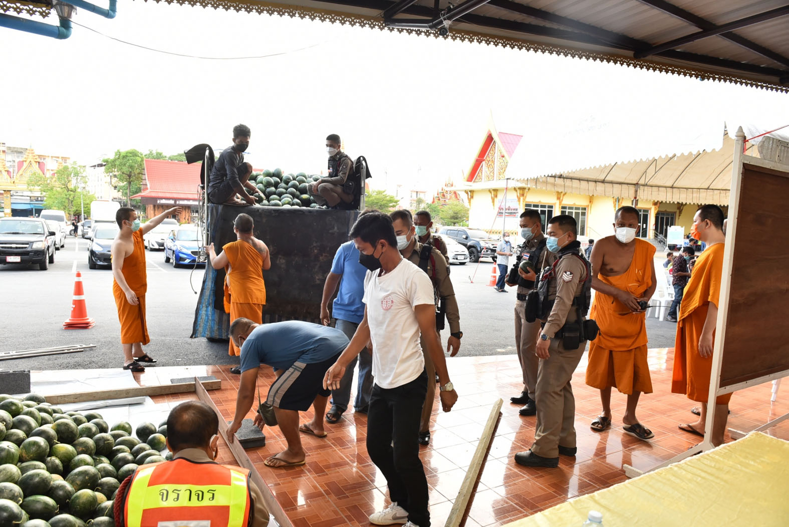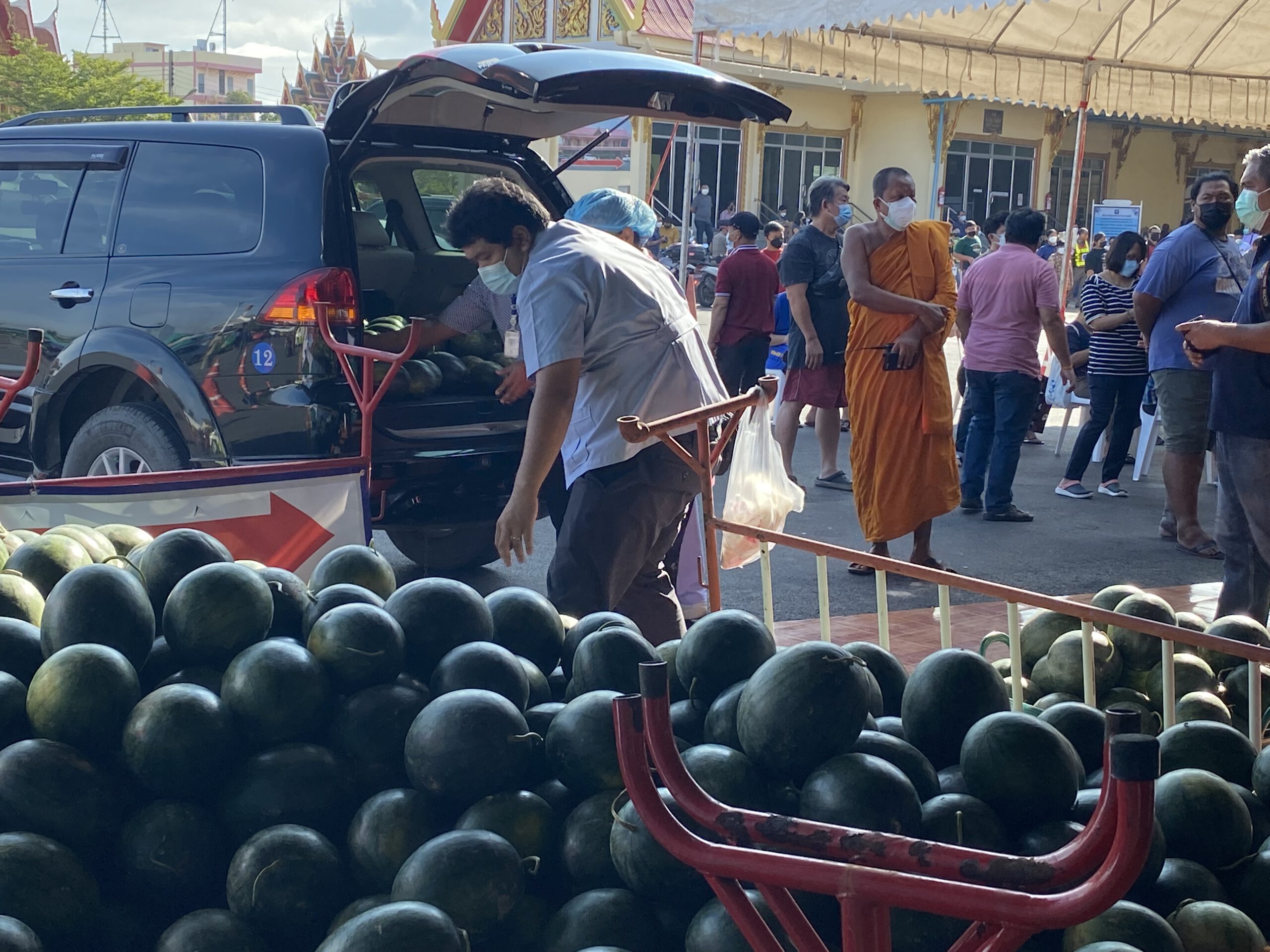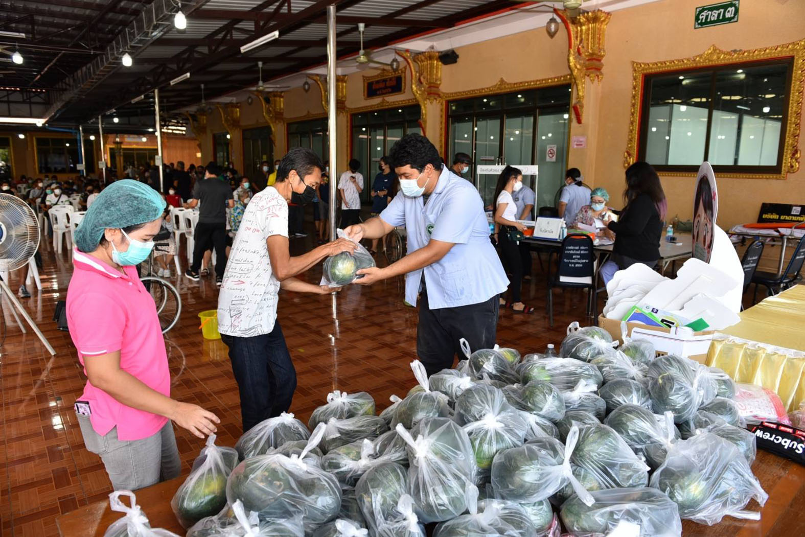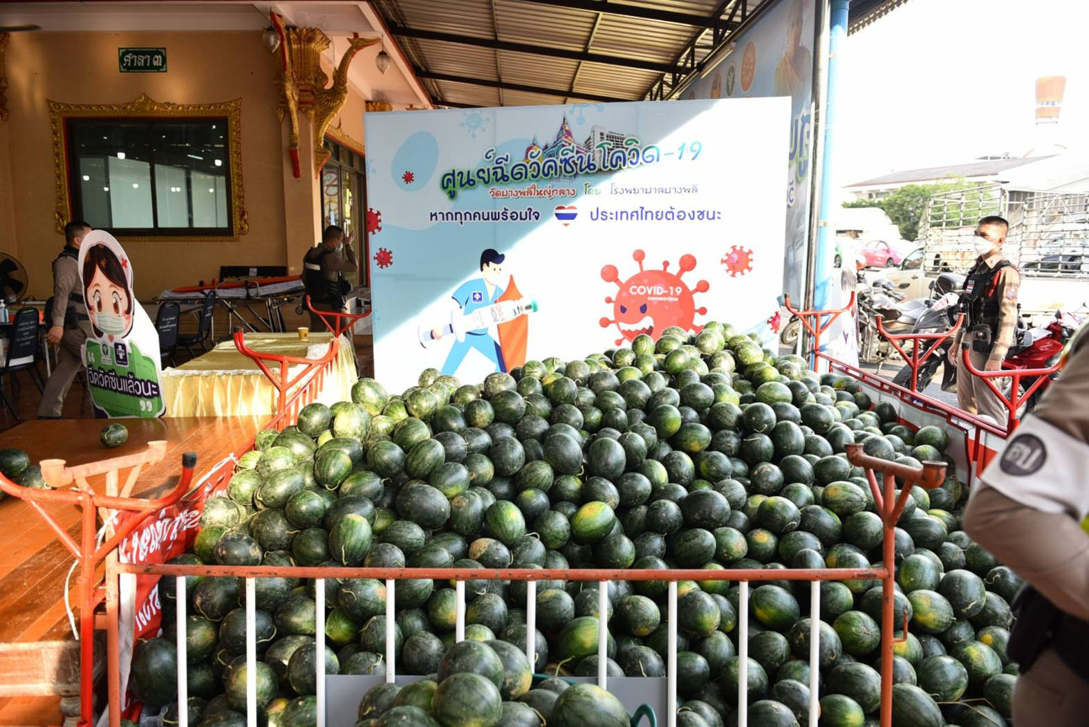 สมุทรปราการ พระอาจารย์แจ้ เหมาแตงโมแจกชาวบ้านที่มาฉีดวัคซีนที่ศูนย์ฉีดวัคซีนวัดบางพลีใหญ่กลาง