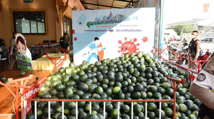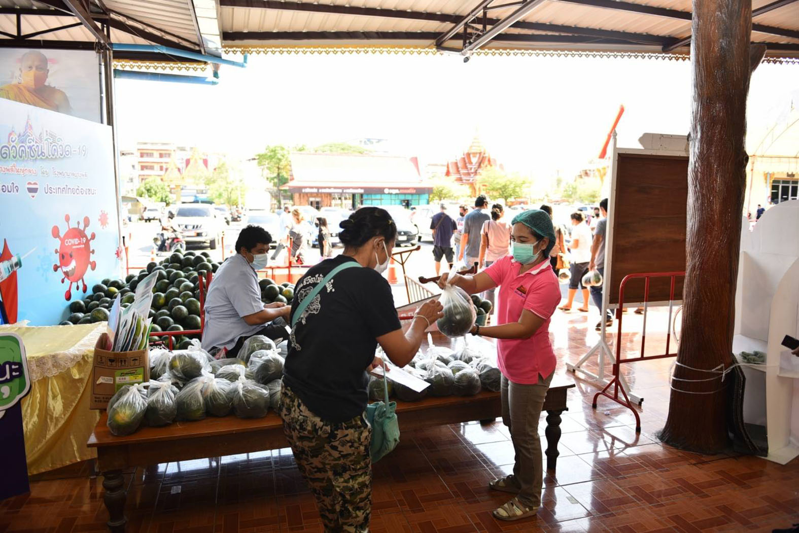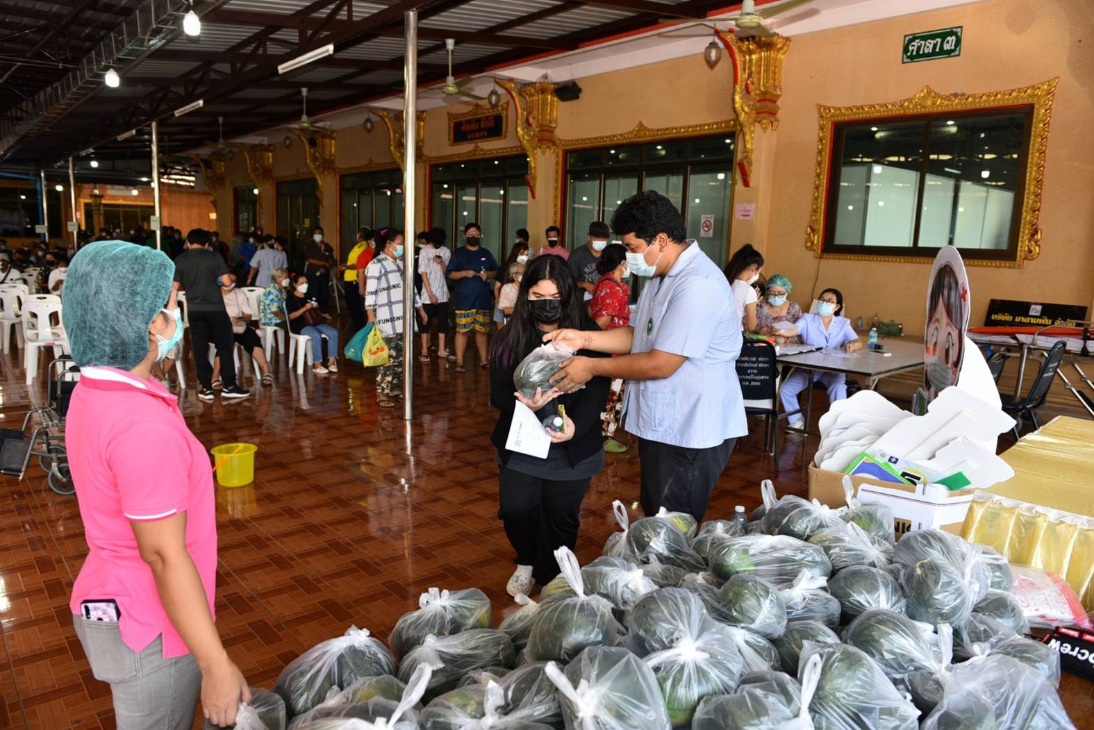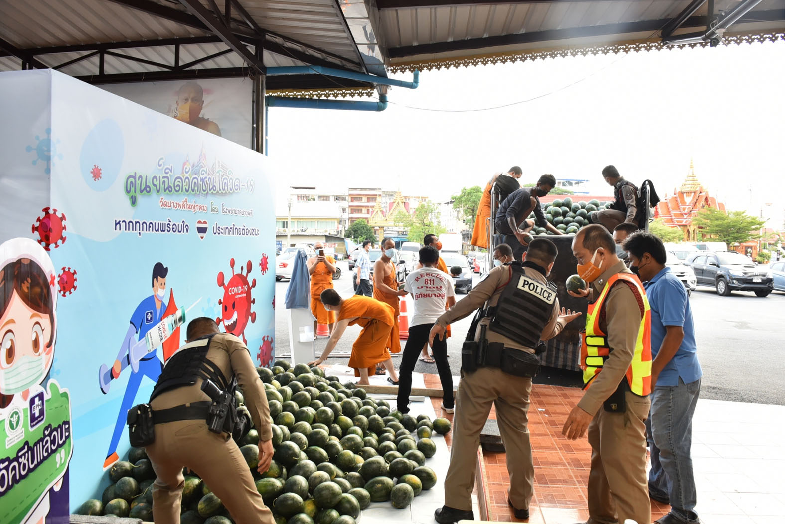 สมุทรปราการ พระอาจารย์แจ้ เหมาแตงโมแจกชาวบ้านที่มาฉีดวัคซีนที่ศูนย์ฉีดวัคซีนวัดบางพลีใหญ่กลาง