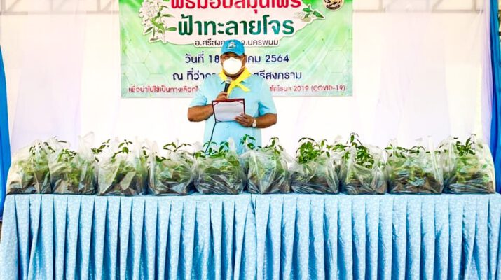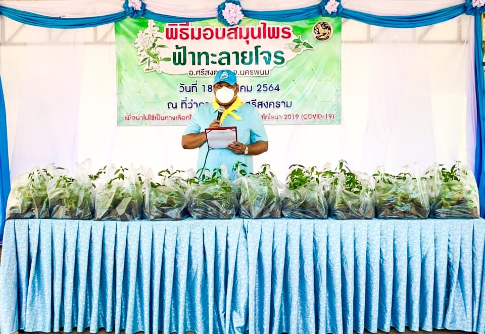 ในการนี้ นายสุรพล แก้วอินธิ มอบหมายให้ นางมลิวัลย์ ปูคะธรรม พัฒนาการอำเภอศรีสงคราม พร้อมด้วยเจ้าหน้าที่พัฒนาชุมชนอำเภอศรีสงคราม ร่วมกิจกรรมและรับมอบต้นกล้าฟ้าทะลายโจร จำนวน 50 ต้น ในการนี้ ได้ส่งมอบเพื่อสนับสนุนโครงการเสริมสร้างและพัฒนาผู้นำการเปลี่ยนแปลง ขยายผลบ้านพี่เมืองน้อง ผนึกกำลังสร้างความมั่นคงทางอาหาร “ตู้ยาข้างบ้าน ตู้อาหารข้างครัว” ตำบลหาดแพง ต่อไป และมอบหมายพัฒนากรทุกตำบลบูรณาการการขับเคลื่อนครัวชุมชน/ถนนกินได้ ขับเคลื่อนกิจกรรมวัดประชารัฐ สร้างสุข สร้างครัวชุมชน (ศูนย์แบ่งปัน) เพื่อเฉลิมพระเกียรติสมเด็จพระนางเจ้าสิริกิติ์ พระบรมราชินีนาถ พระบรมราชชนนีพันปีหลวง เนื่องในโอกาสวันเฉลิมพระชนมพรรษา 12 สิงหาคม 2564 และสร้างความมั่นคงทางอาหารตามโครงการ “นครพนมสร้างสุข บำบัดทุกข์ด้วยชุมชนท้องถิ่น” (Nakhon Phanom Happy Creation) ในพื้นที่หมู่บ้าน/ชุมชน ในห้วงเดือนสิงหาคม 2564 ร่วมกับผู้นำชุมชนต่อไป