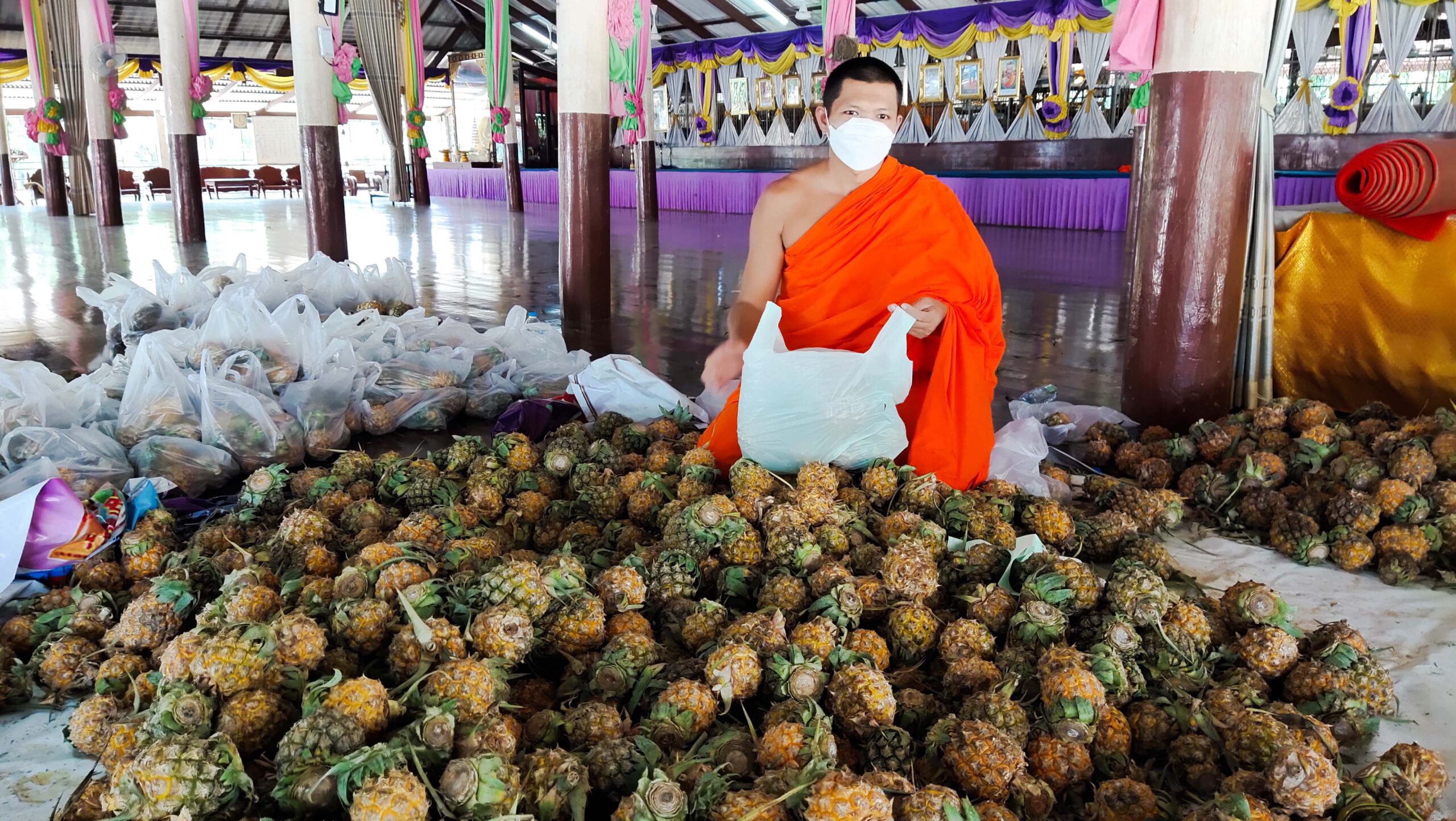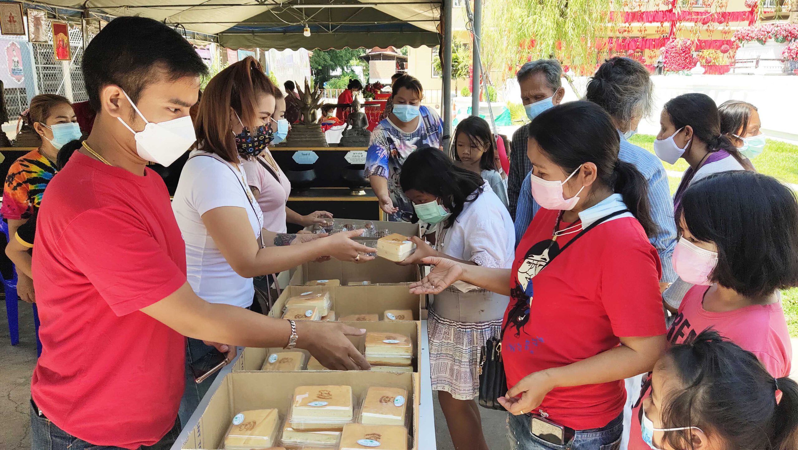 นางสุทิศา อนันตกุล ชาวอำเภอเมืองสุพรรณบุรี ได้นำขนมจีนแกงเขียวหวาน จำนวน 150ชุด คุณวรารักษ์ จิโน พร้อมครอบครัวพันธุ์ทับทิม นำข้าวหมูกระเทียมไข่เจียว 200 กล่อง มาเลี้ยงฟรี สำหรับผู้ที่นำอาหารน้ำดื่มมาเลี้ยงแจกฟรีทุกรายเป็นผู้โชคดี ได้โชคจากท้าวเวสสุวรรณ และยังมีชาวจังหวัดเชียงรายซึ่งมีจิตศรัทธาท้าวเวสสุวรรณ และเป็นผู้โชคดีจากท้าวเวสสุวรรณได้ซื้อสับปะรดภูแล ส่งมาถวายให้วัดพังม่วง จำนวน 3 ตัน เพื่อให้ทางวัดได้นำมาแจกประชาชนที่มากราบไหว้ขอพรในวันนี้ด้วยซึ่งนอกจากจะช่วยเหลือประชาชนที่มากราบขอพรพระแล้วยังได้ช่วยเหลือเกษตรกรผู้ปลูกสับปะรดช่วงโควิด19 แพร่ระบาดอีกทางหนึ่งด้วย