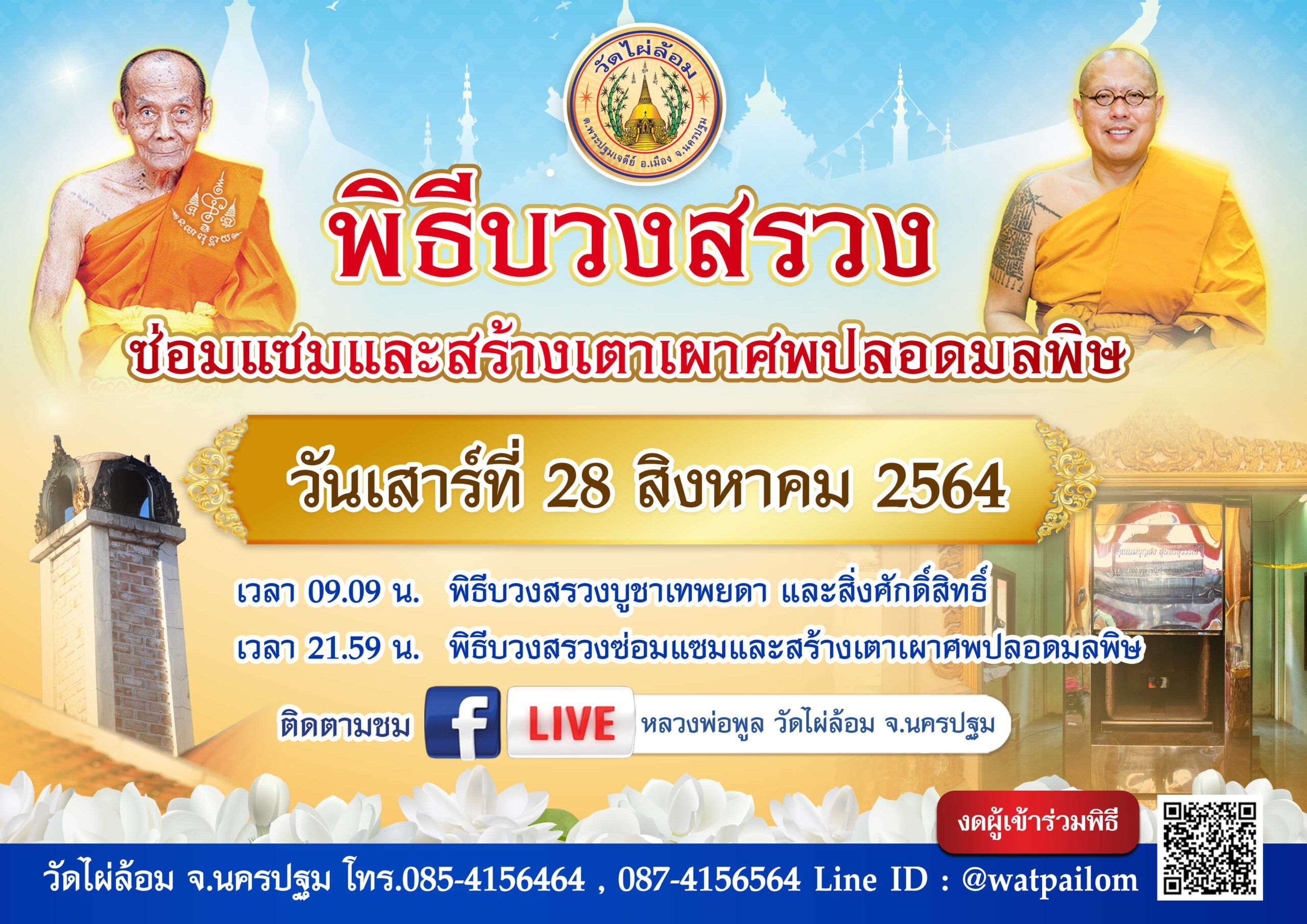 และในวันที่ 28 สิงหาคมนี้ จะมีพิธีการบวงสรวงเพื่อซ่อมแซมและสร้างเตาเผาปลอดมลพิษ โดยในเวลา 9.09 น. จะมีพิธีการบวงสรวงบูชาเทพยดา และสิ่งศักดิ์สิทธิ์ และในเวลา 21.59 น. จะบวงสรวงซ่อมแซมและสร้างเตาเผาปลอดมลพิษ ซึ่งจะมีการไลฟ์สด ทางเพจหลวงพ่อพูล วัดไผ่ล้อม จ.นครปฐม และเป็นการจัดงานที่งดผู้เข้าร่วมพิธีภายในงานด้วย